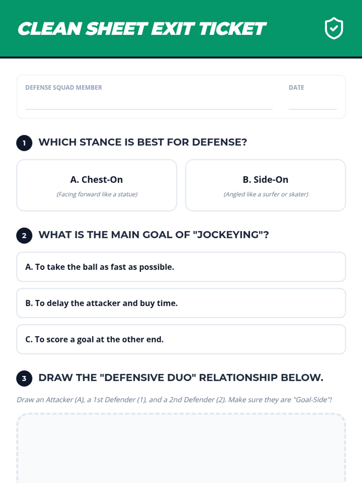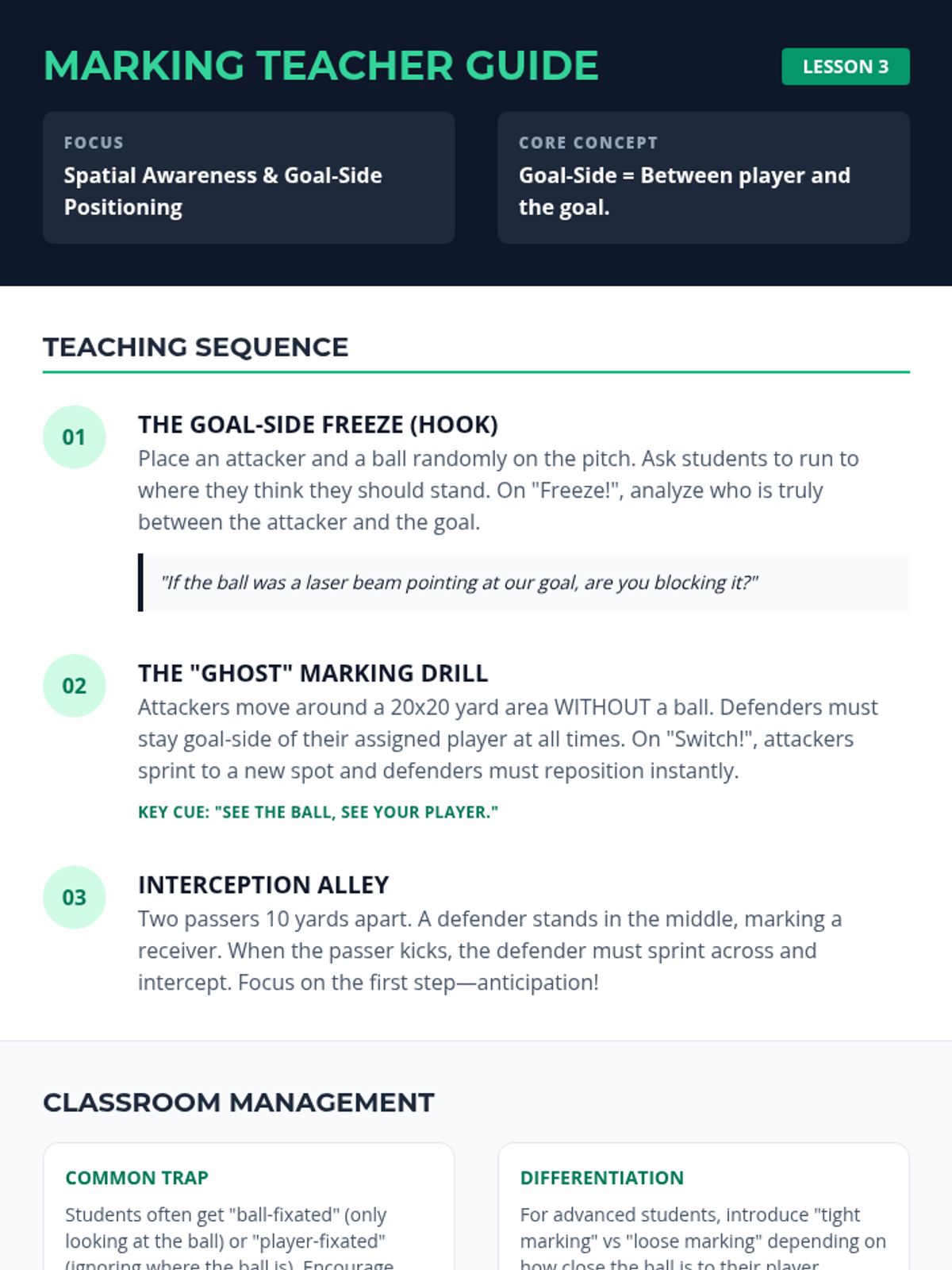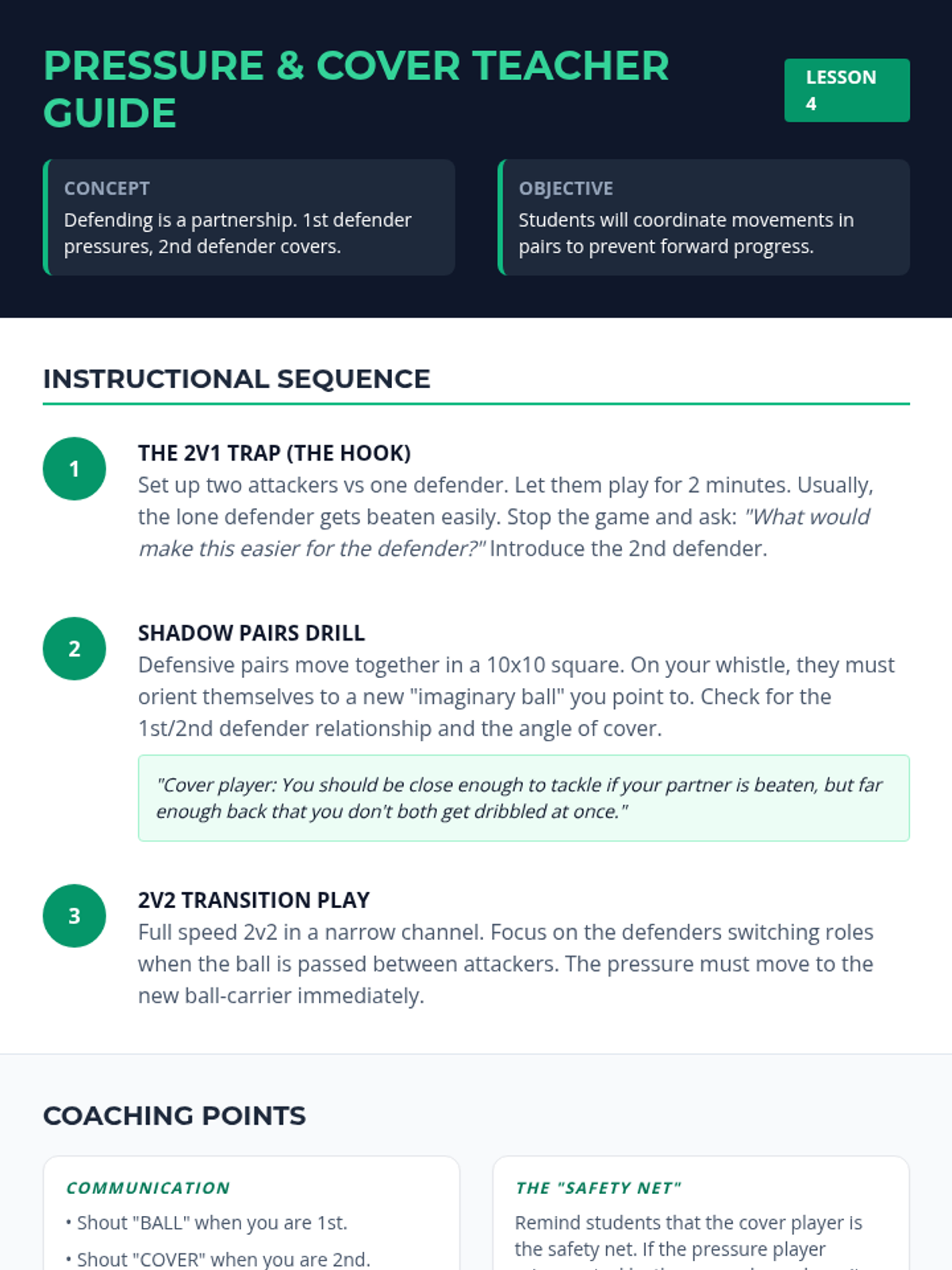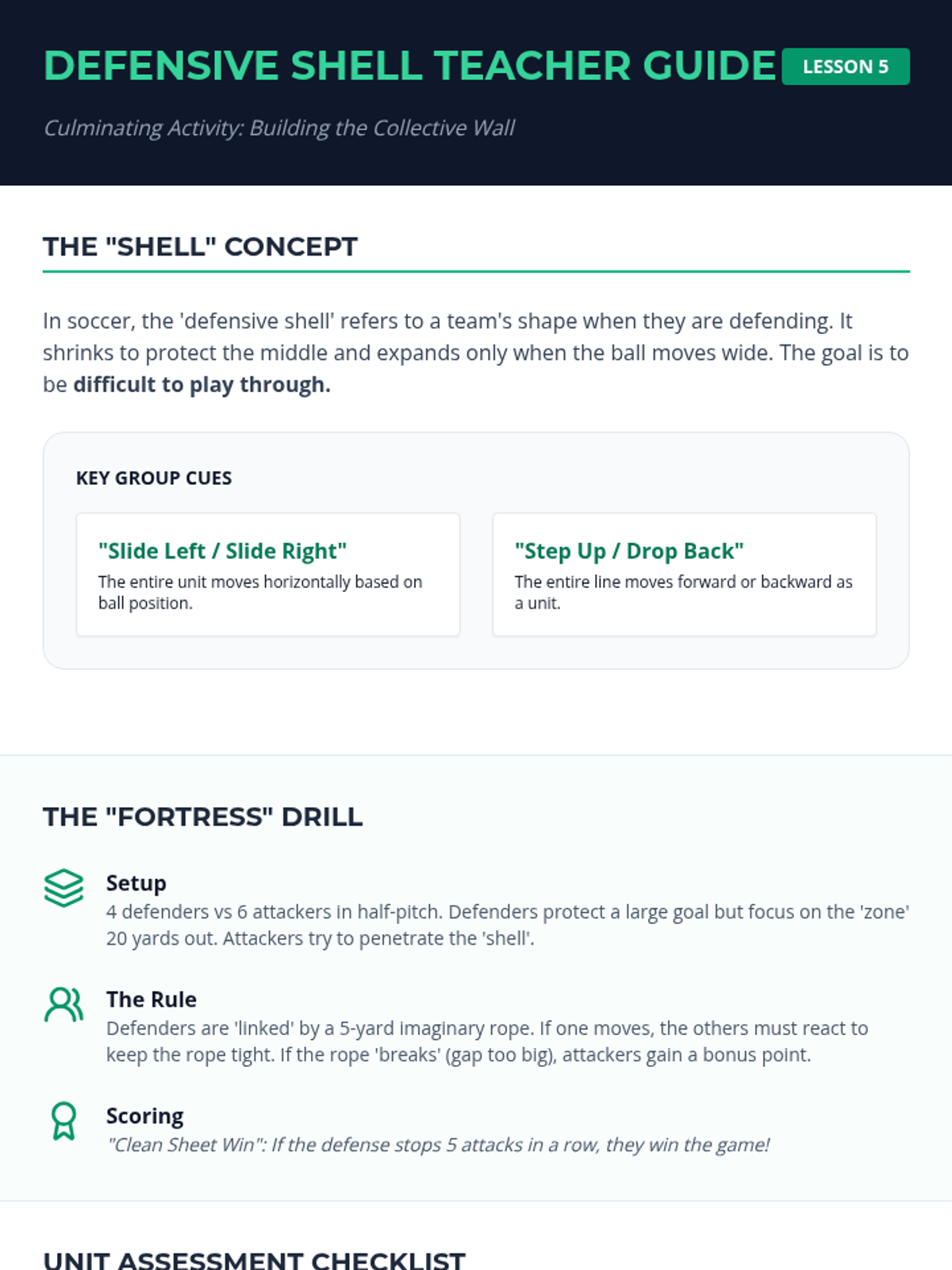 A comprehensive 5-lesson unit for 4th-grade students focusing on soccer defensive skills, including jockeying, tackling, marking, and team coordination. Students progress from individual stance to collective unit defense.