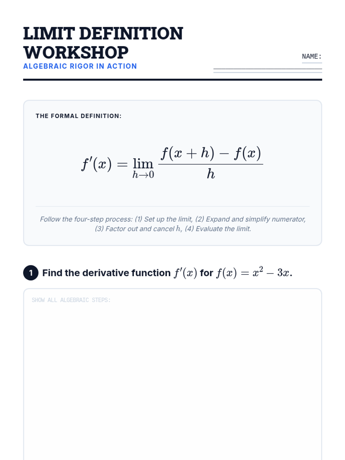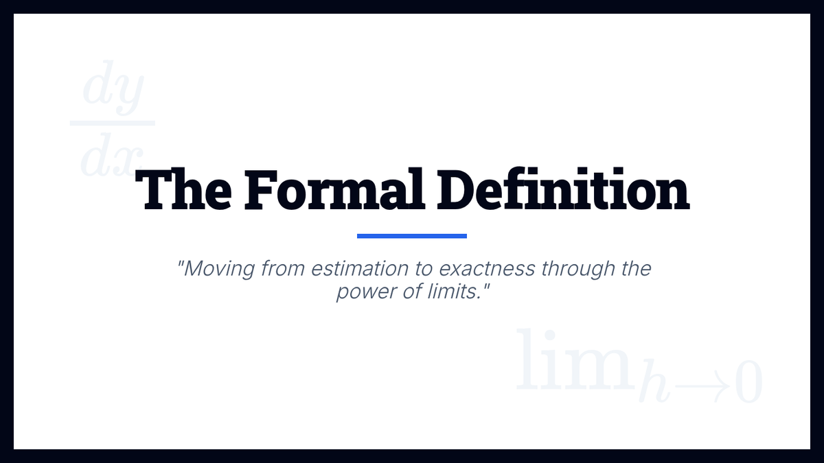 A rigorous introduction to the formal definition of the derivative, bridging the gap between average rates of change and instantaneous rates using limits, various notations, and graphical analysis of differentiability.