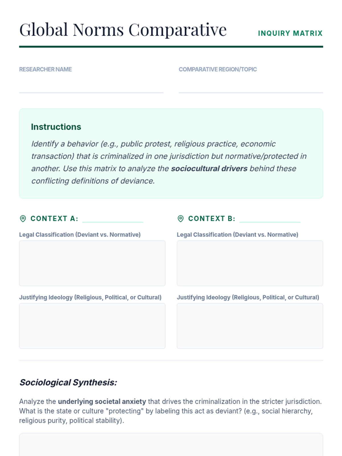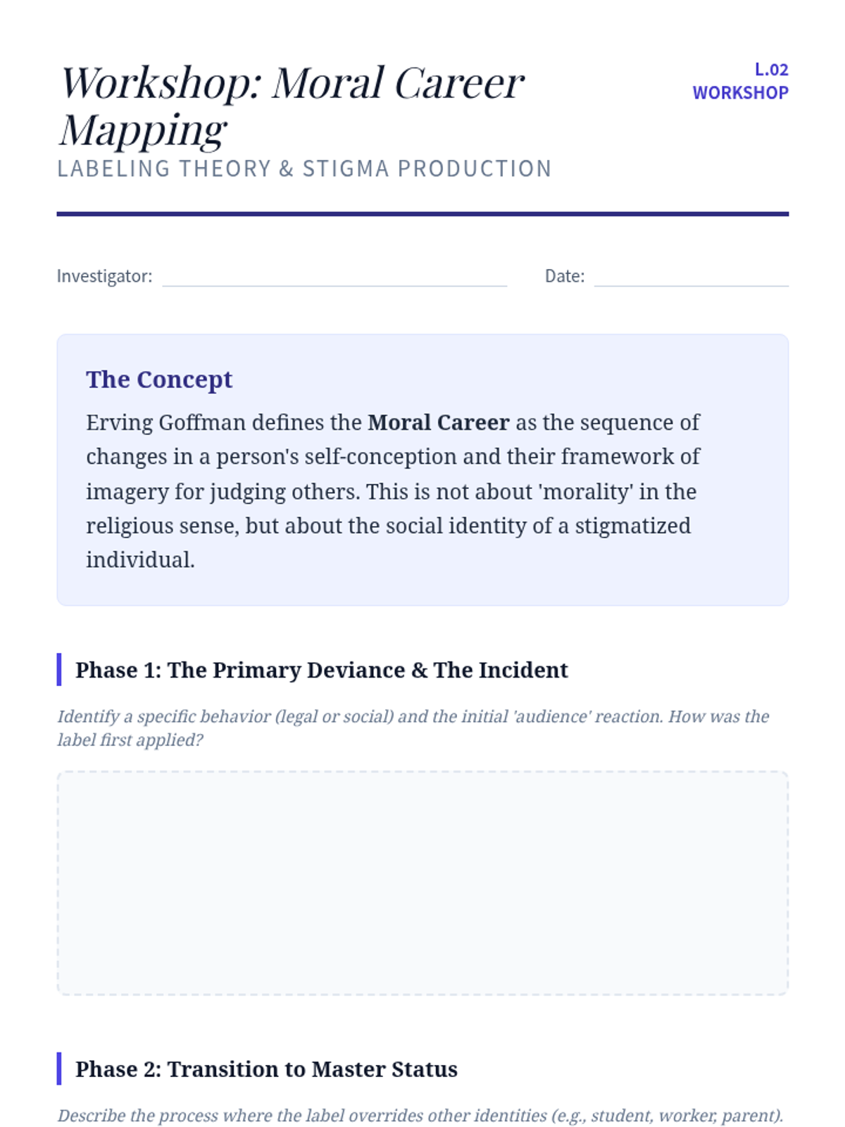This graduate-level sequence explores the sociological construction of deviance, examining how social norms, power dynamics, and legal frameworks define acceptable behavior. Students transition from structural theories to labeling and medicalization, concluding with a critical analysis of institutional policy.