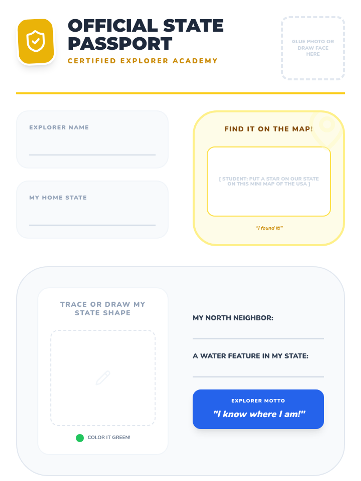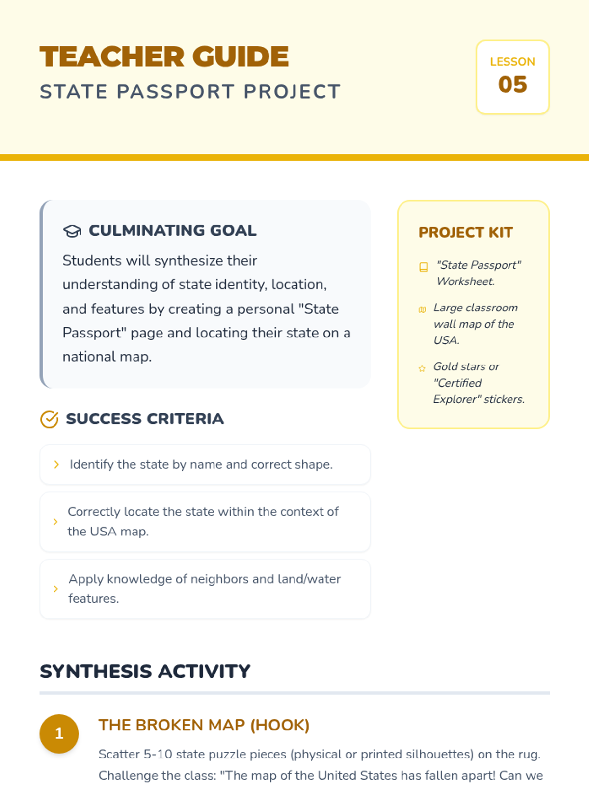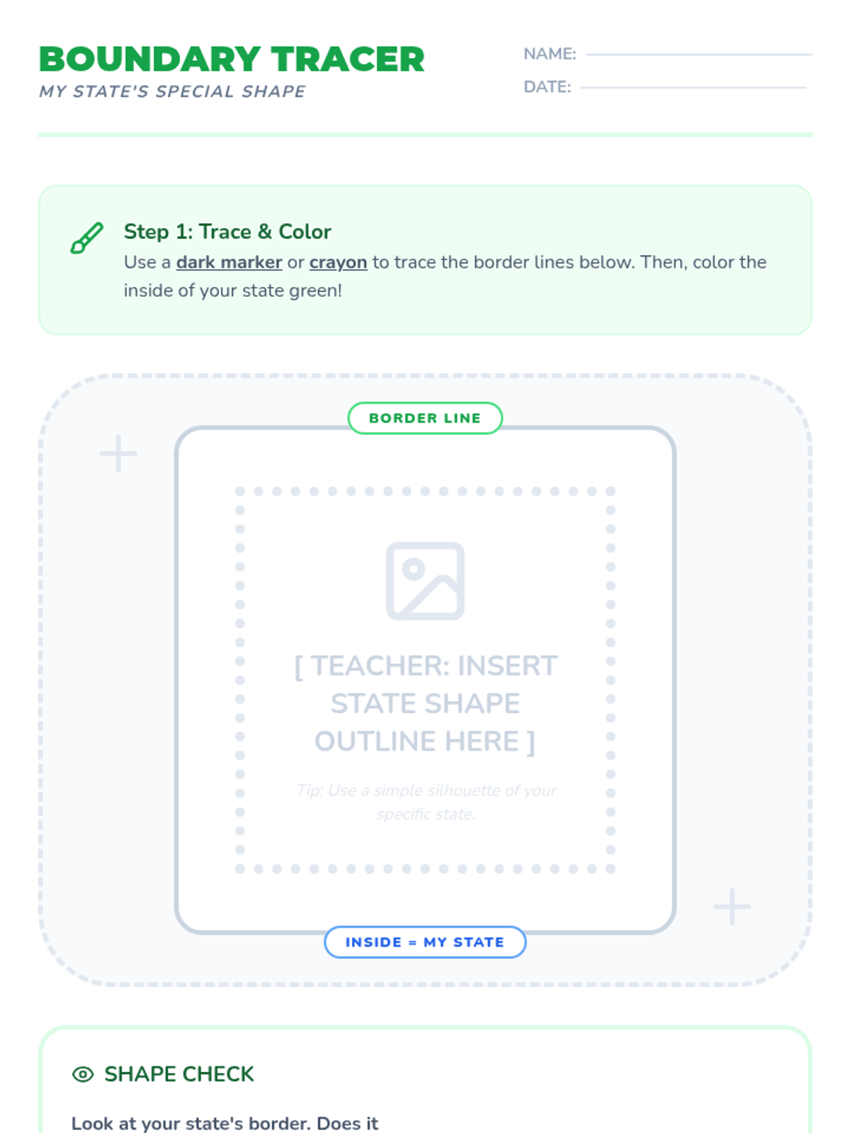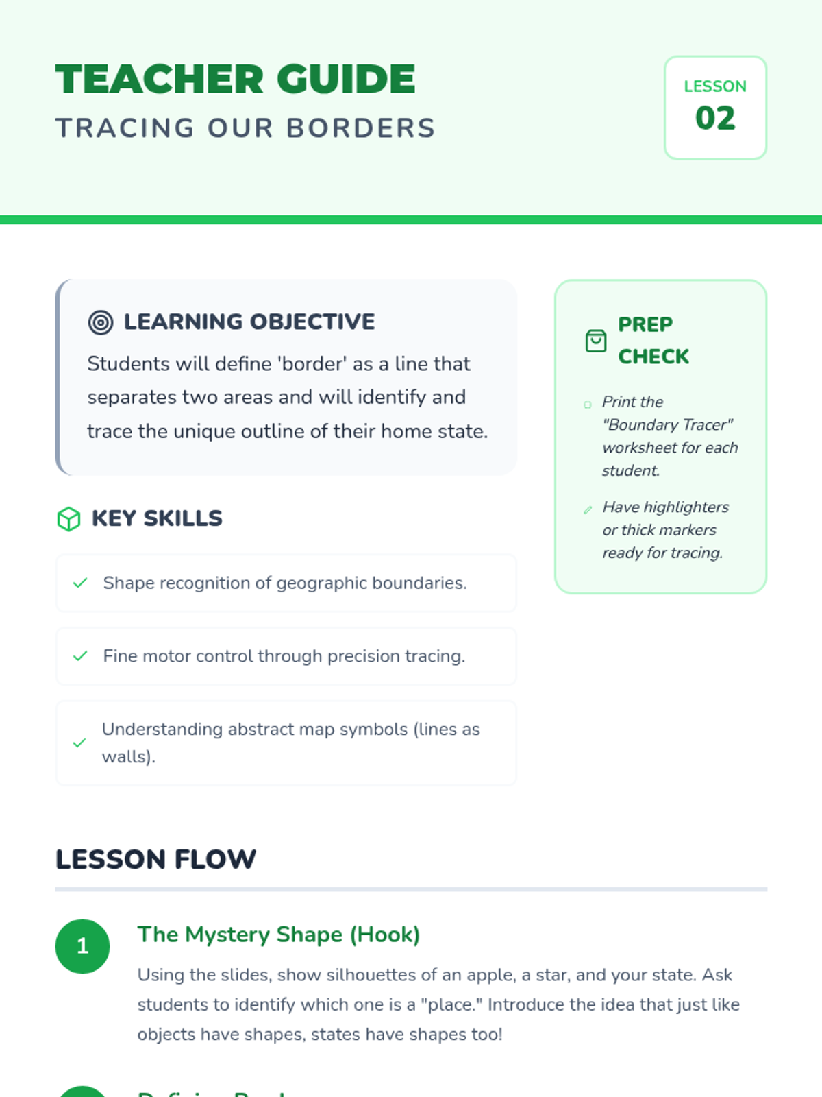 This sequence introduces 1st-grade students to the concept of a state, its boundaries, and its location within the world. Students move from their immediate surroundings to understanding their state's shape, neighbors, and natural features.