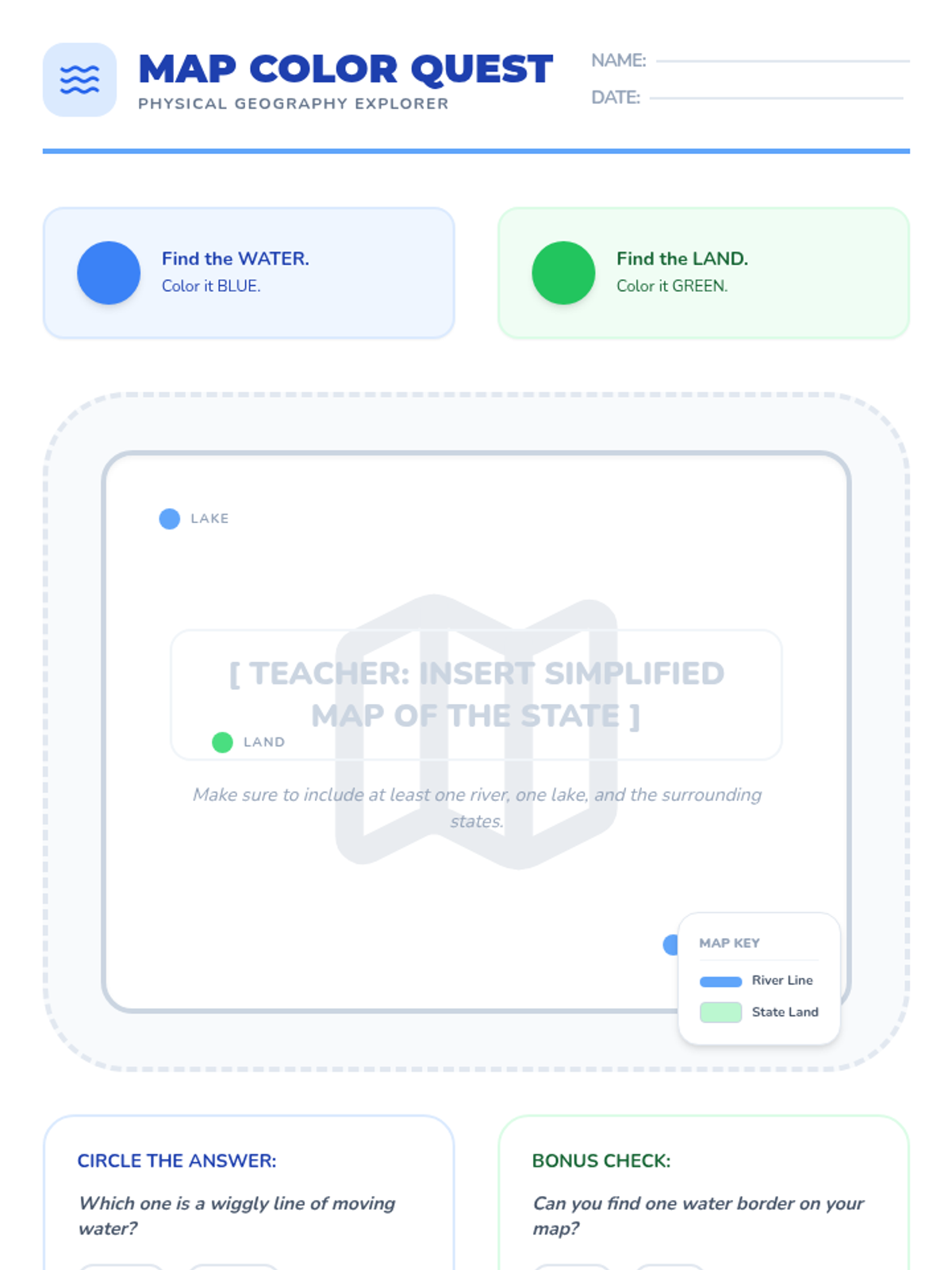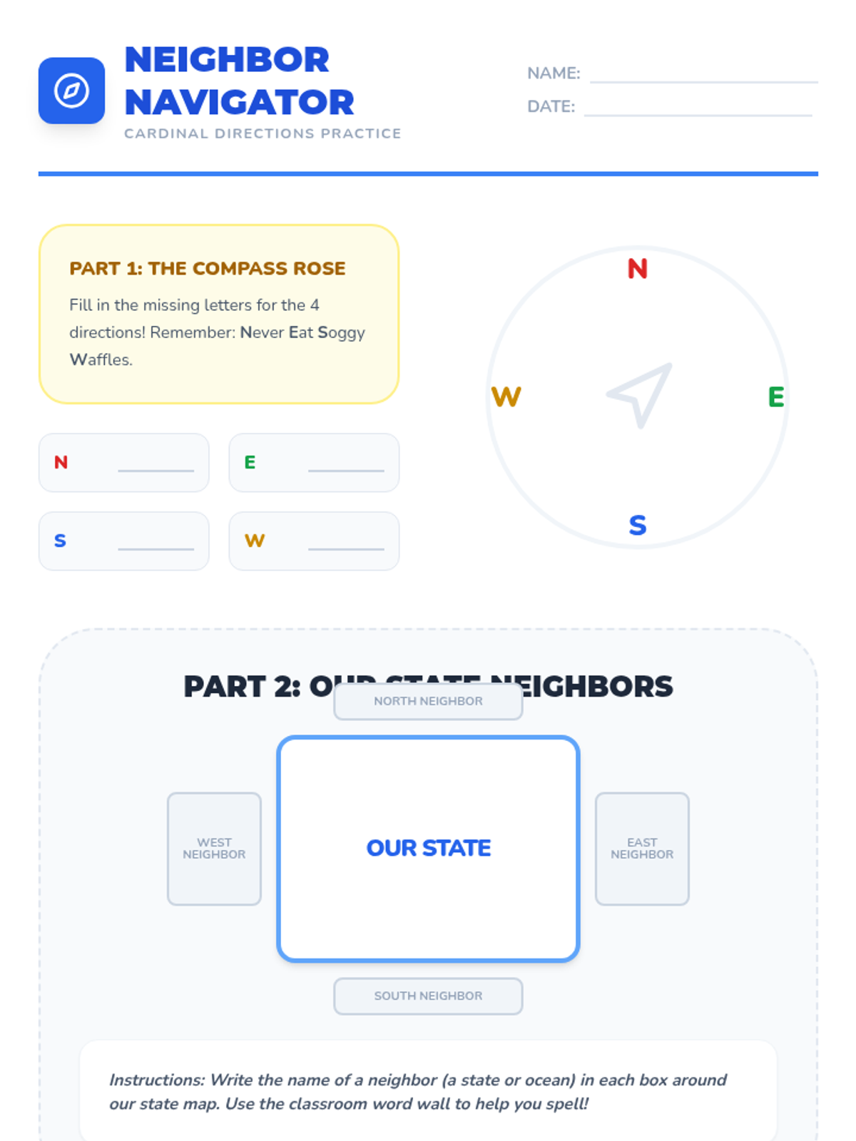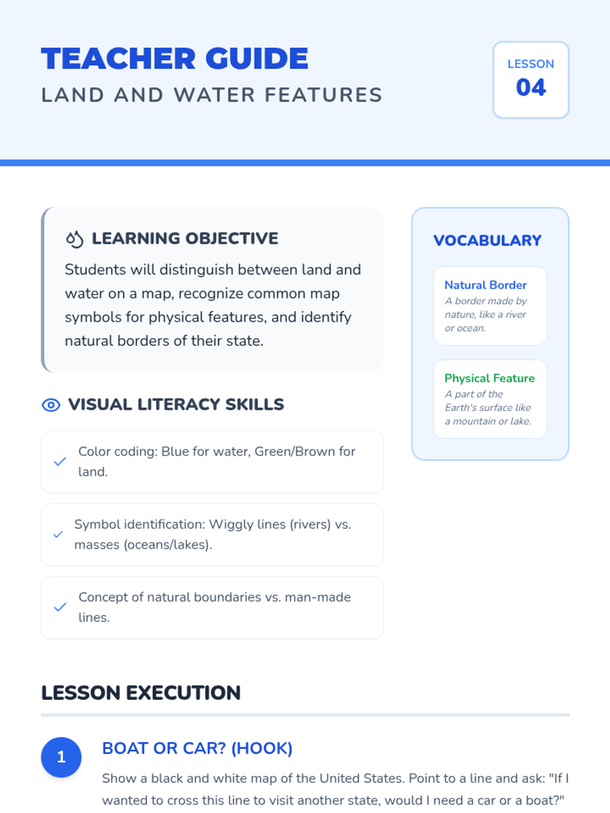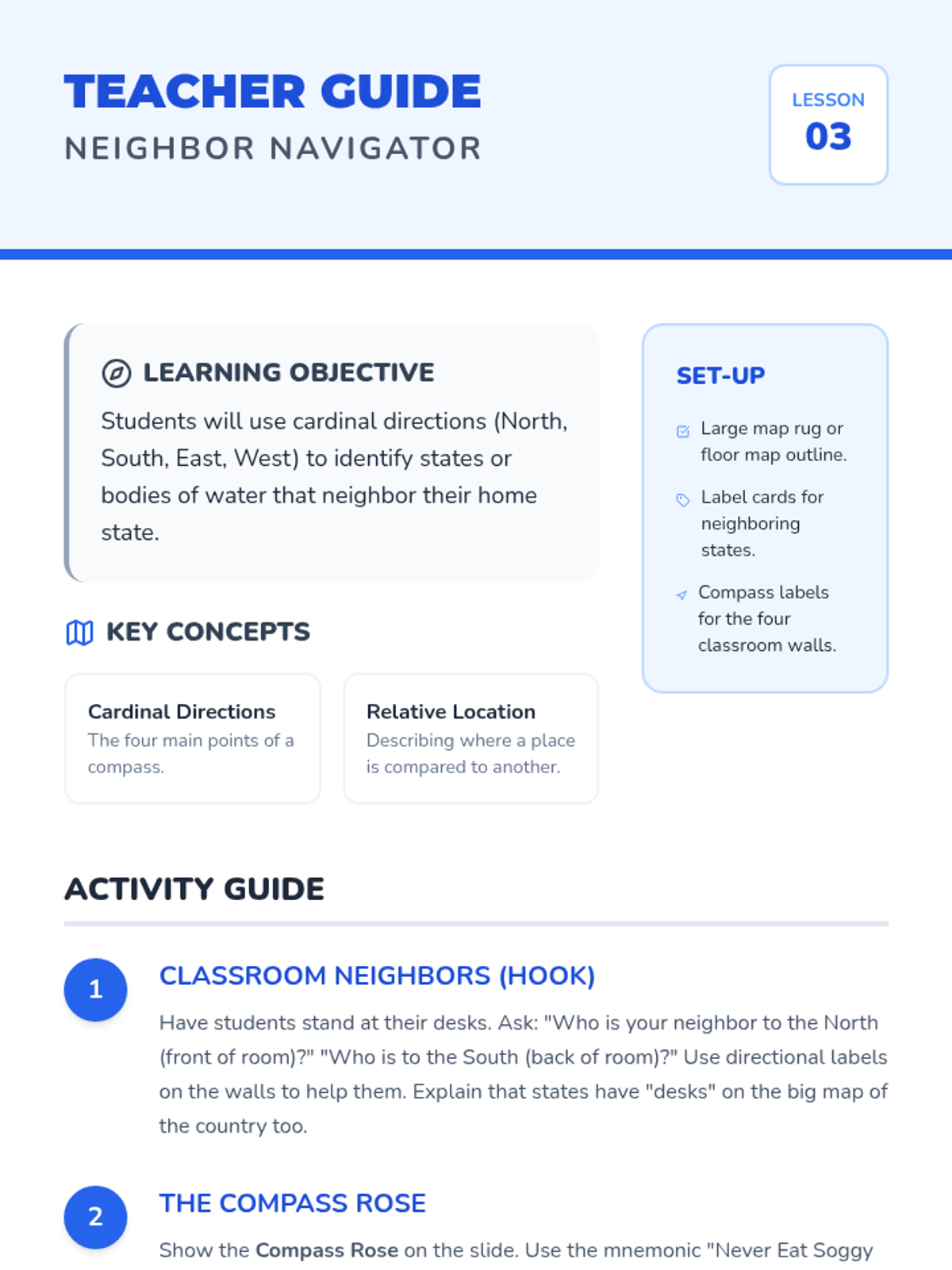 This sequence introduces 1st-grade students to the concept of a state, its boundaries, and its location within the world. Students move from their immediate surroundings to understanding their state's shape, neighbors, and natural features.