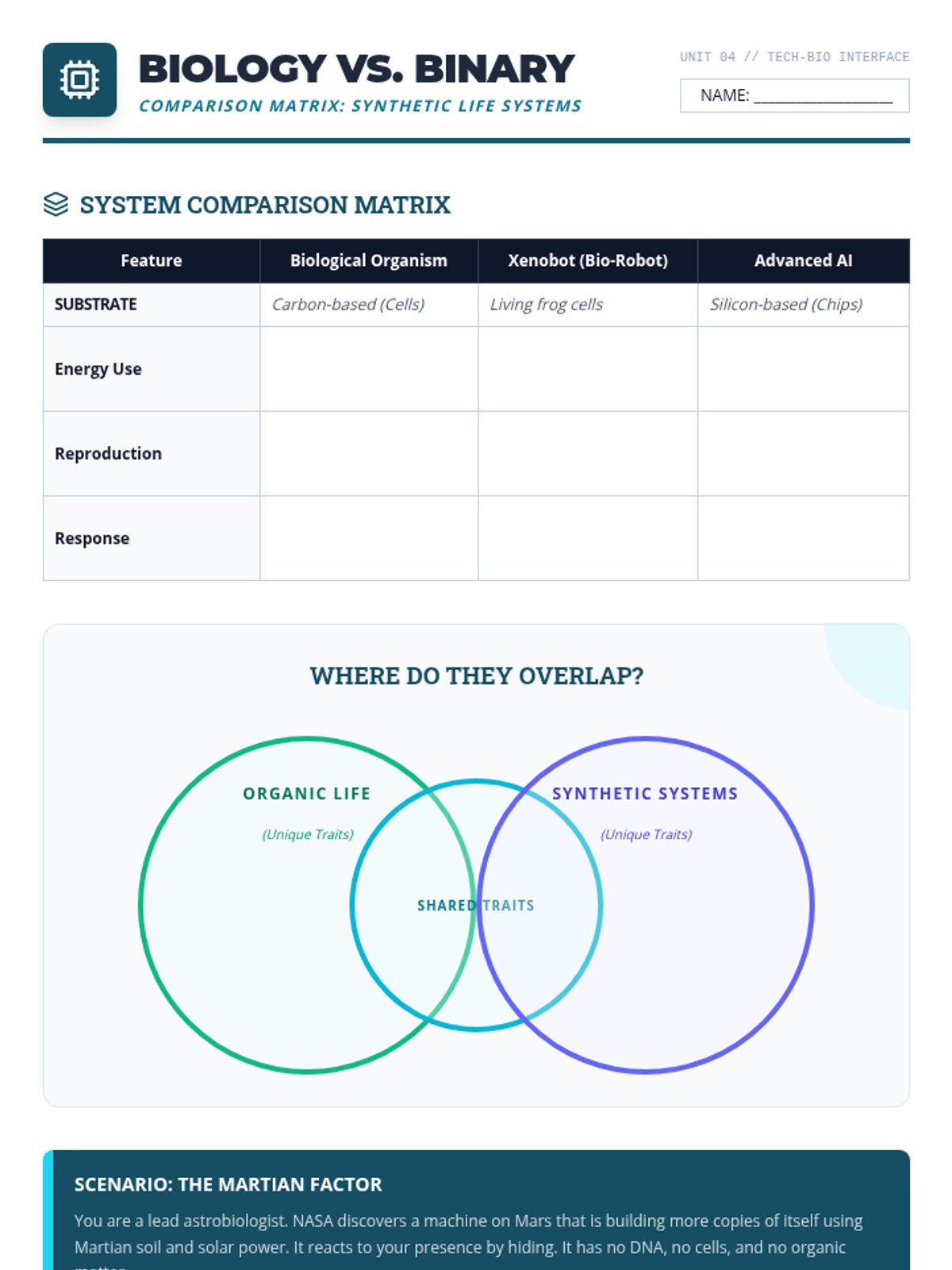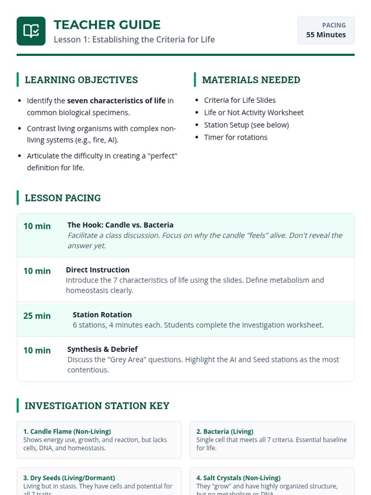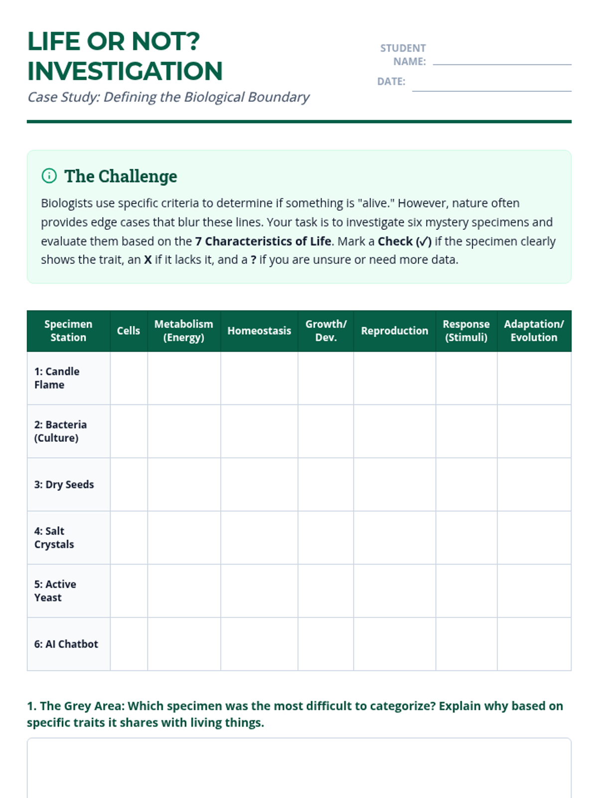 This inquiry-based sequence challenges 9th-grade students to define the boundary between living and non-living matter by examining 'edge cases' in biology, such as viruses, prions, and AI. Students move from memorizing the standard characteristics of life to constructing evidence-based arguments about the classification of ambiguous entities.
