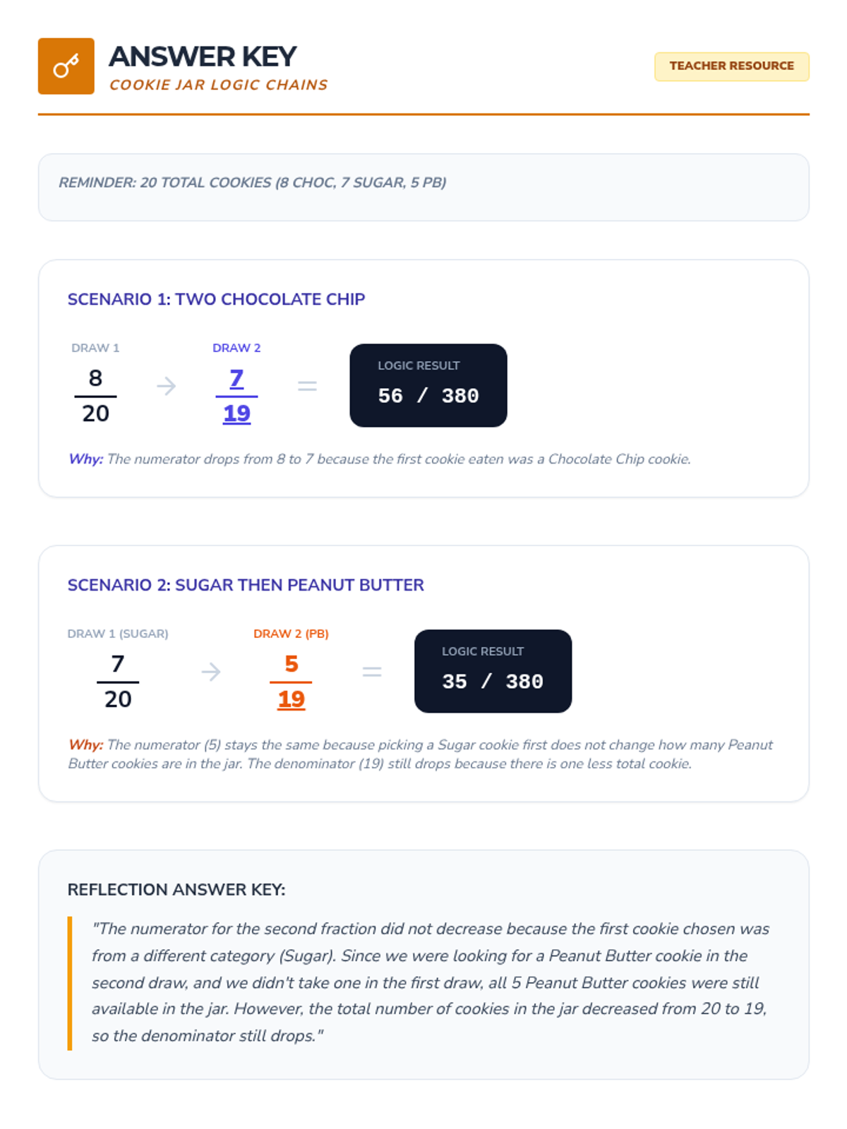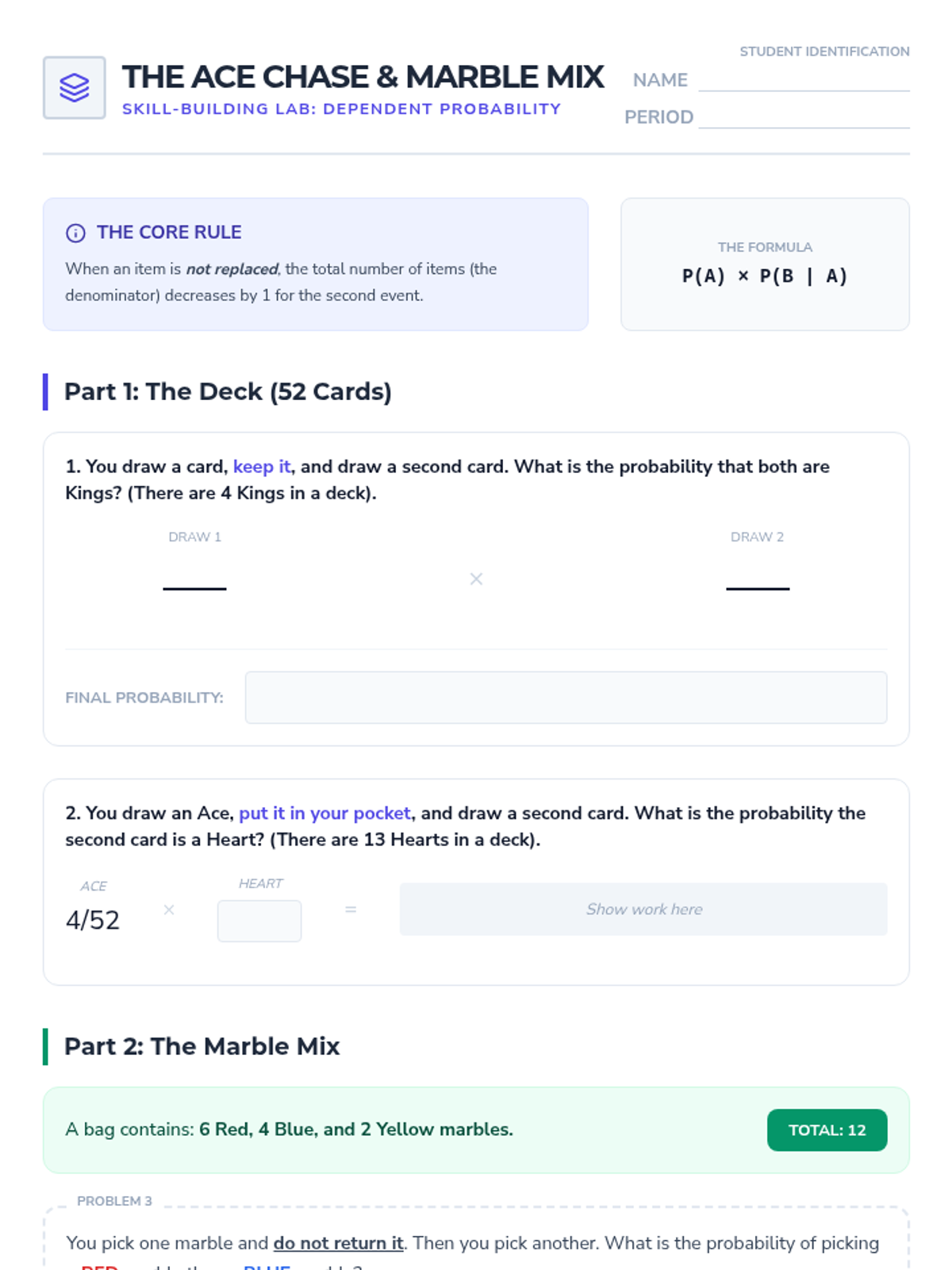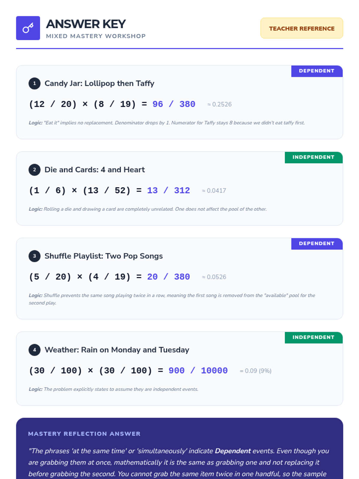 A comprehensive 5-lesson sequence on dependent probability for 8th Grade students, moving from hands-on simulations to complex real-world case studies. Students master the logic of 'without replacement' and learn to distinguish between independent and dependent event types.