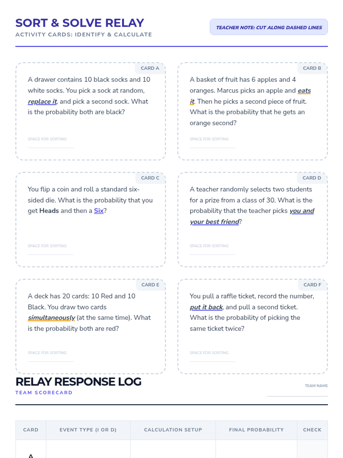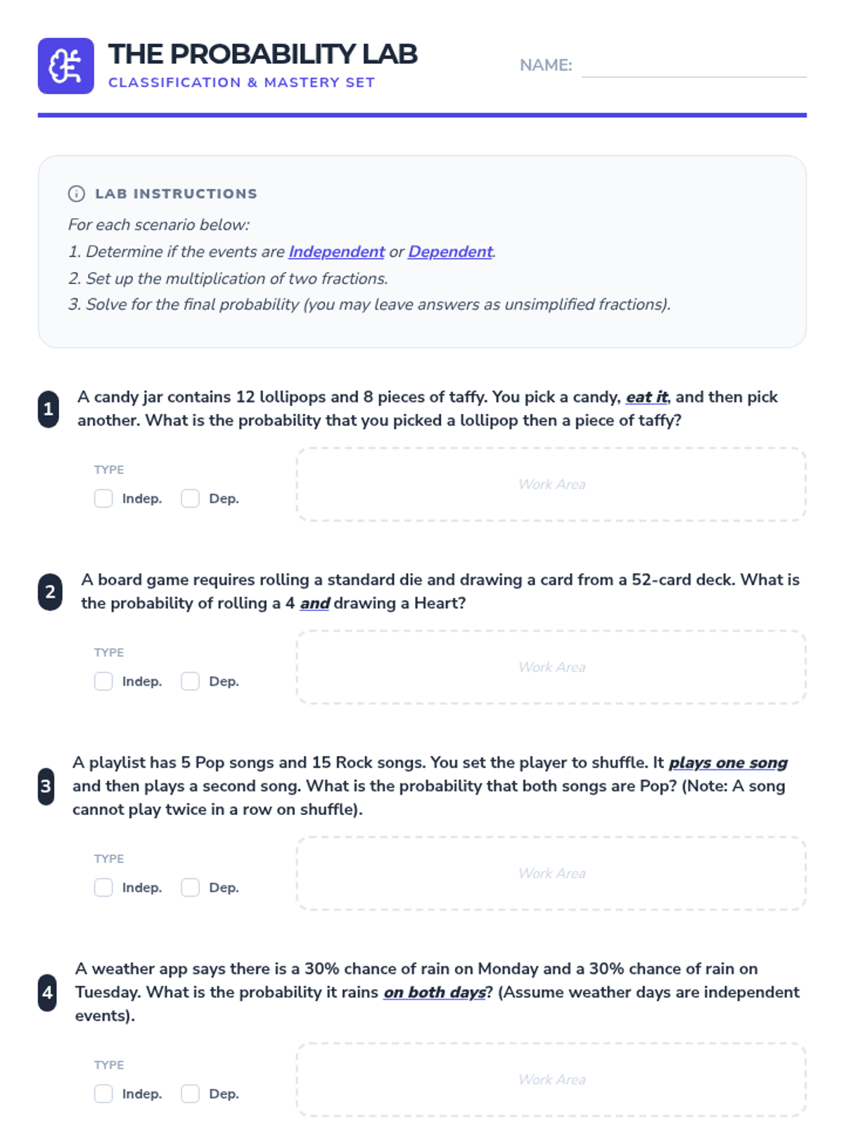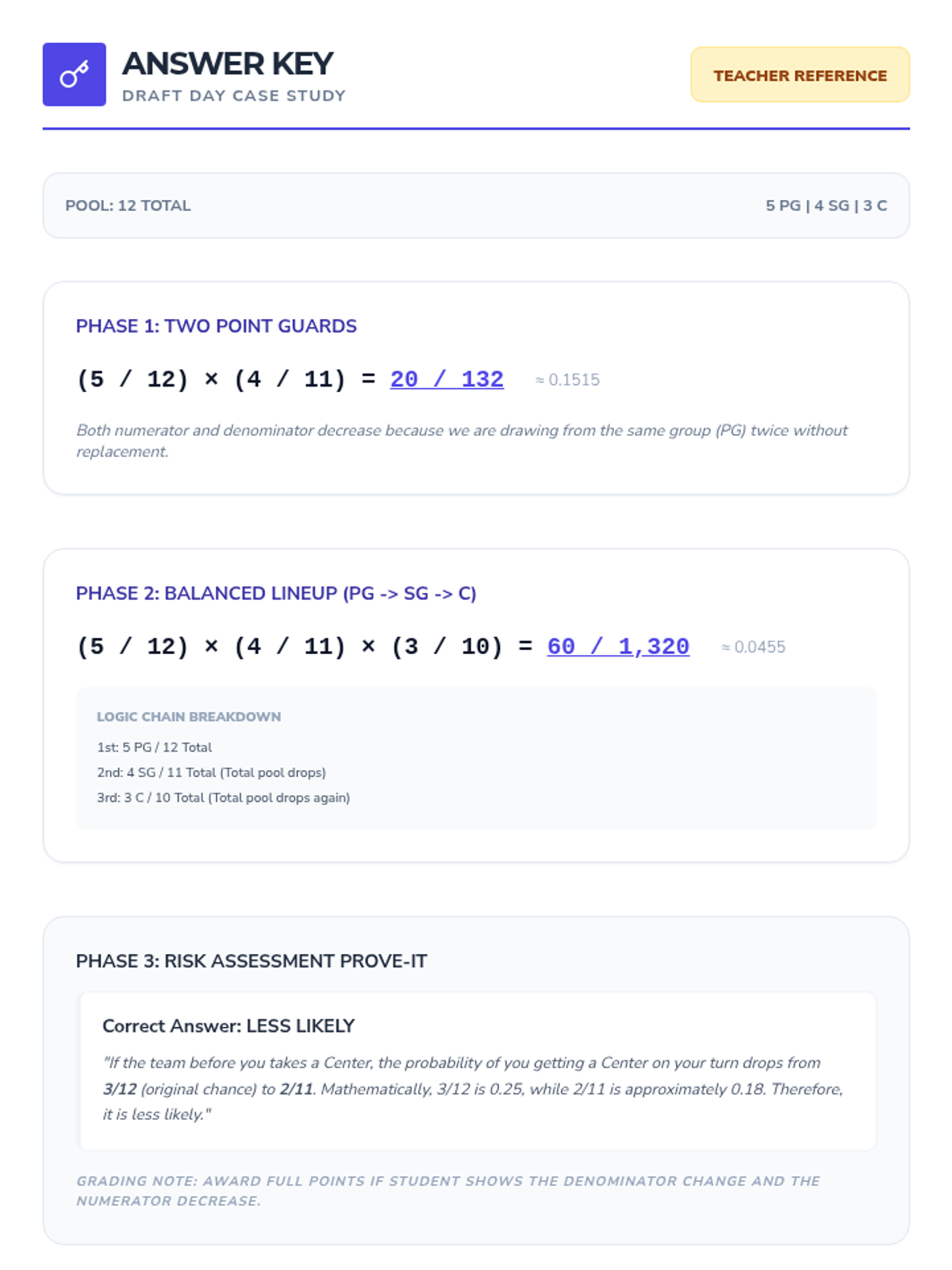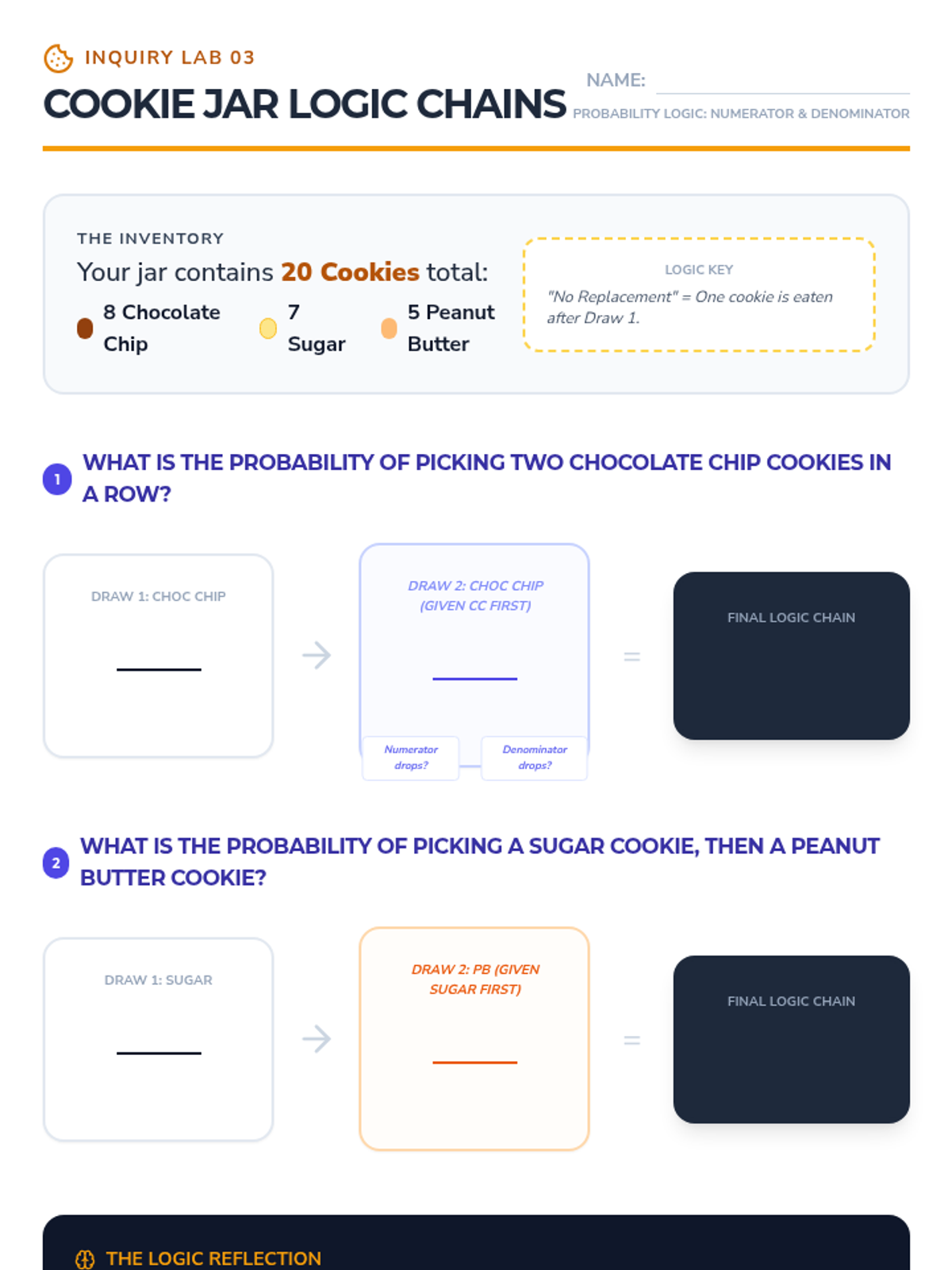 A comprehensive 5-lesson sequence on dependent probability for 8th Grade students, moving from hands-on simulations to complex real-world case studies. Students master the logic of 'without replacement' and learn to distinguish between independent and dependent event types.