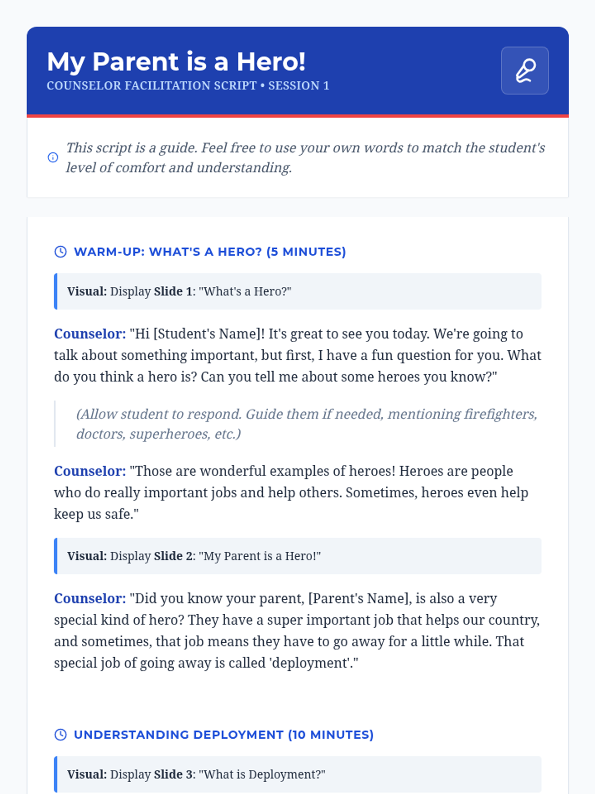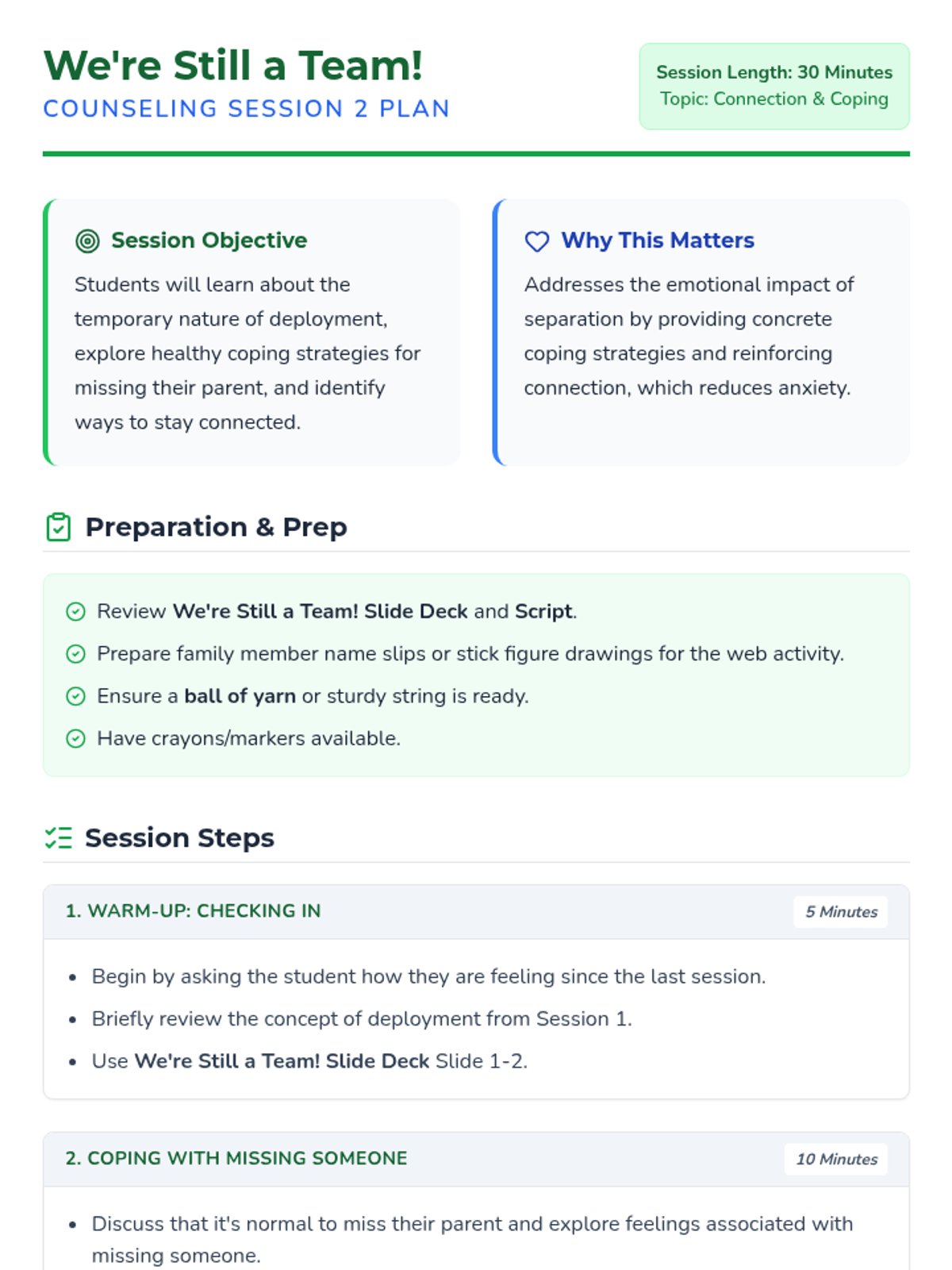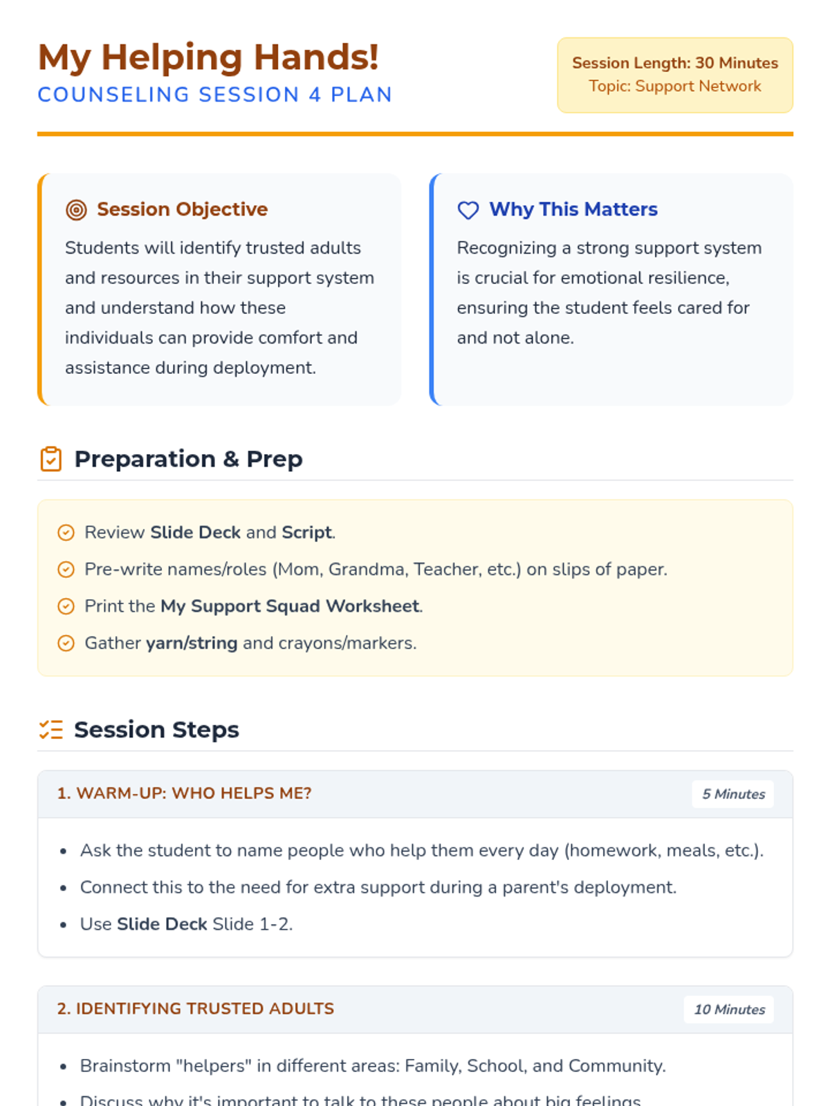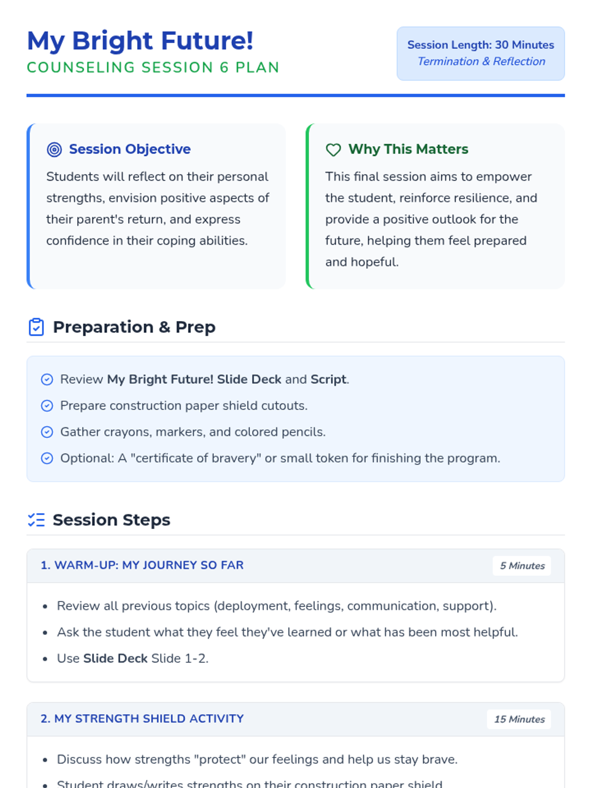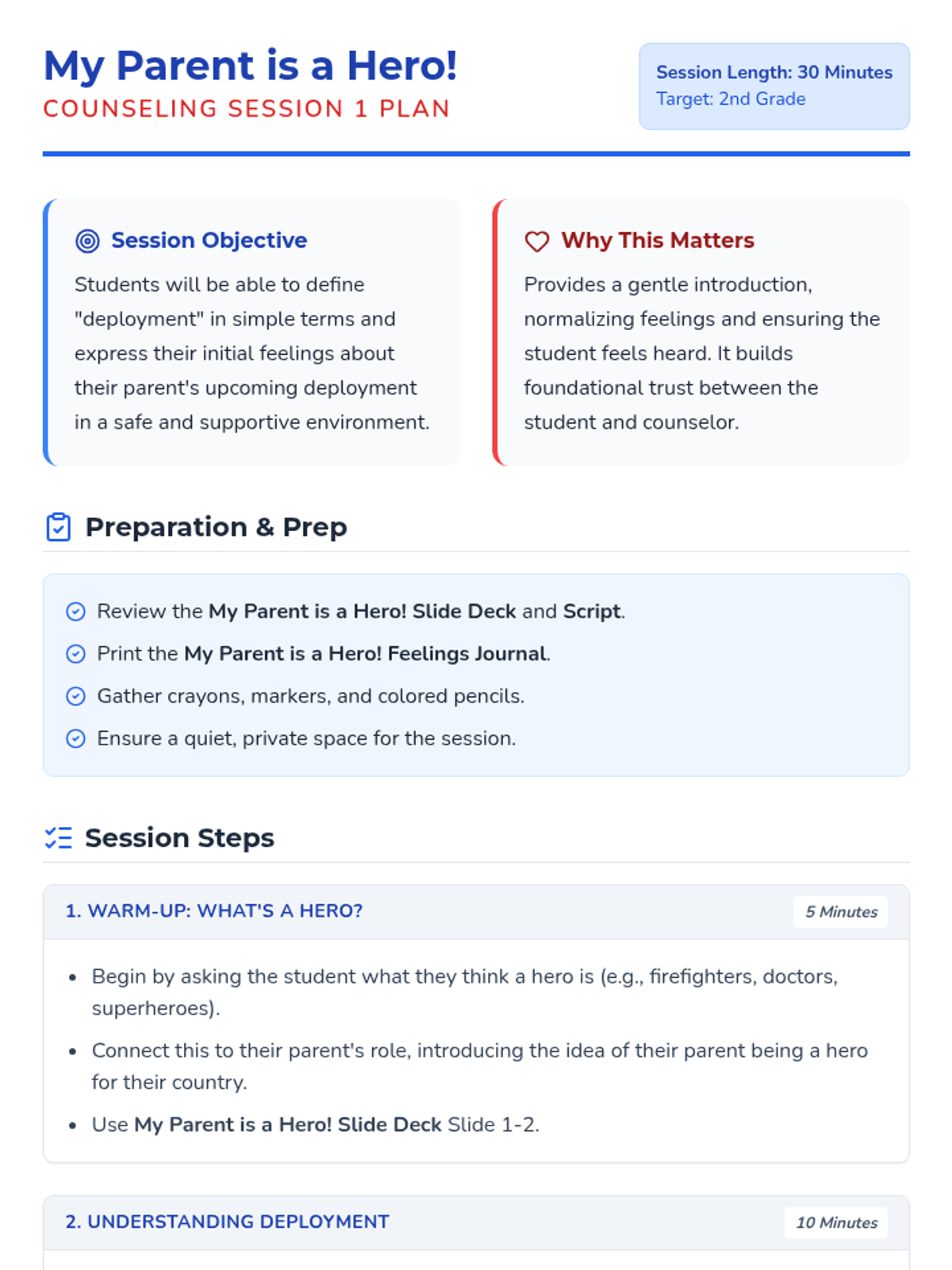 A six-session individual counseling sequence for 2nd-grade students navigating parental deployment. It focuses on emotional expression, coping strategies, and building a support network through a 'Hero's Mission' lens.