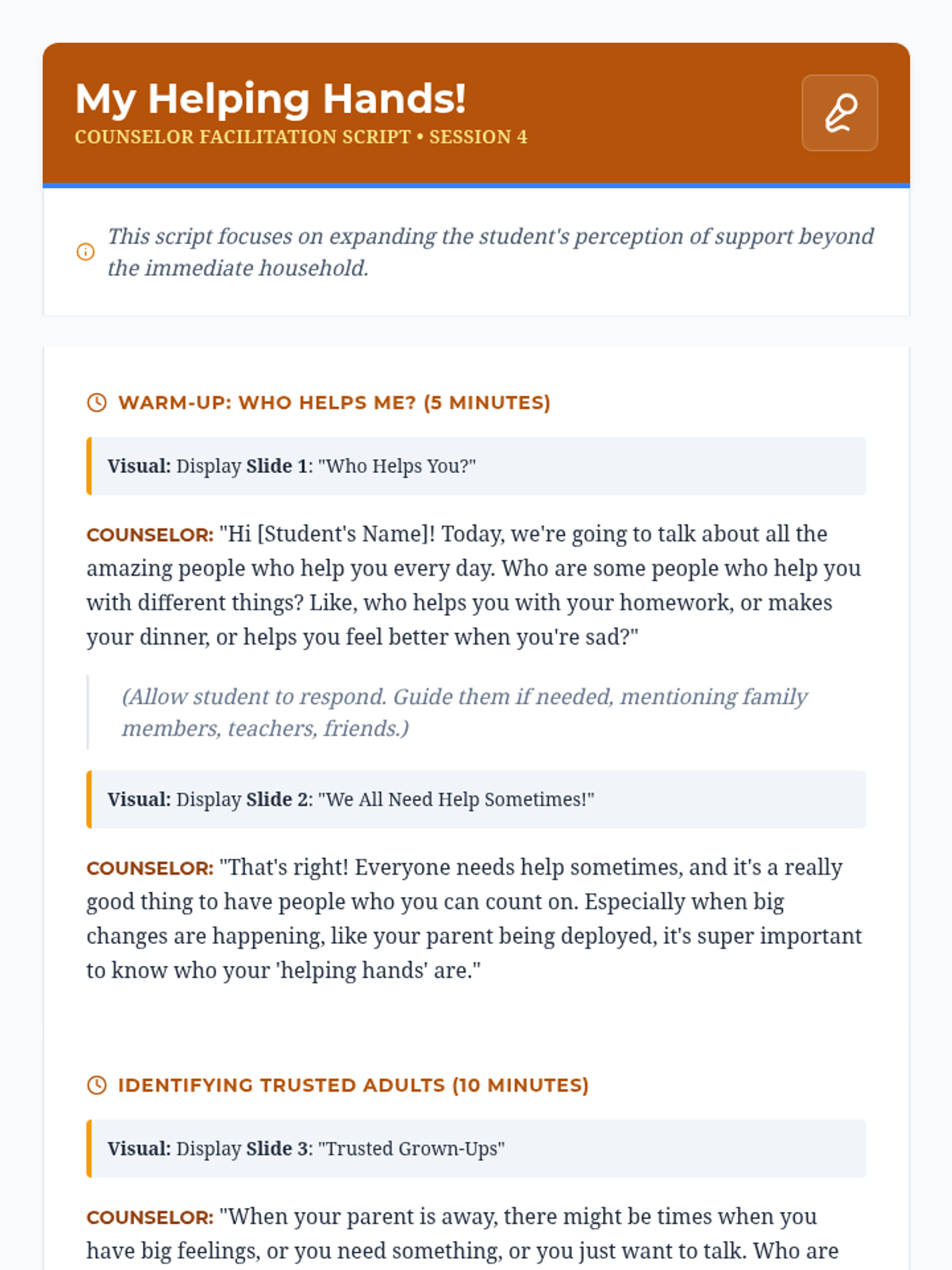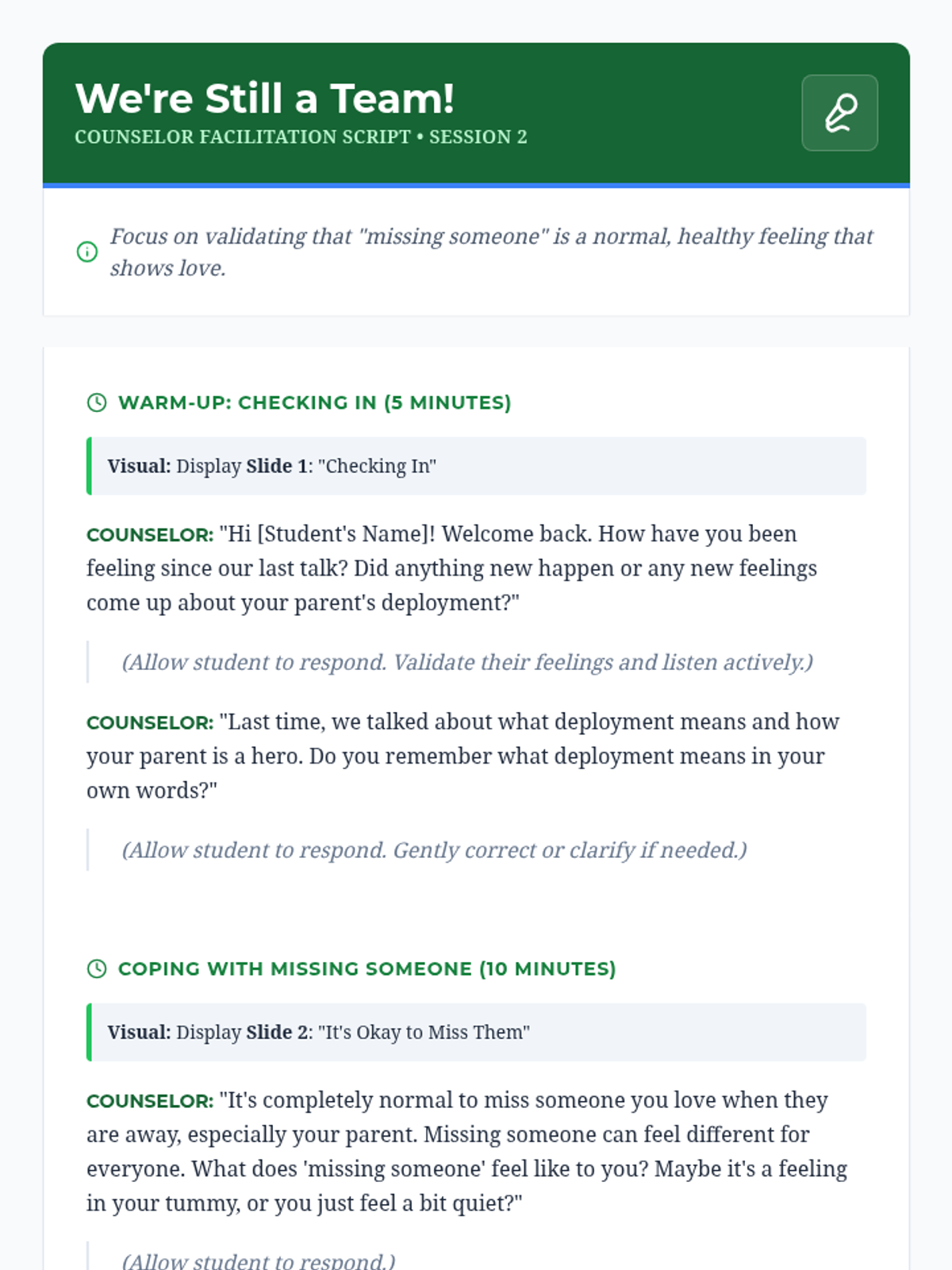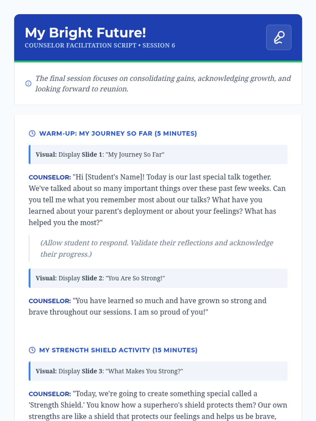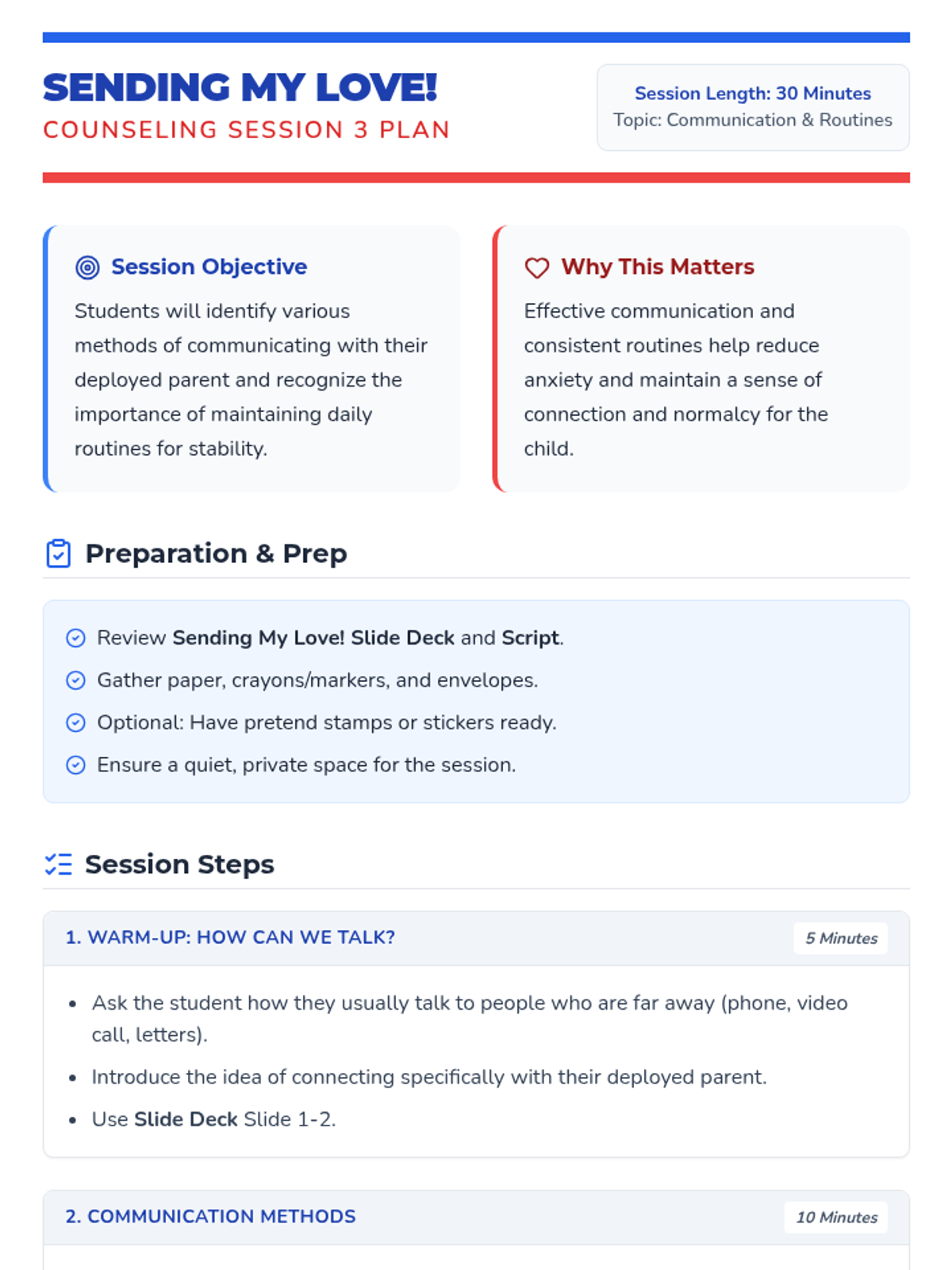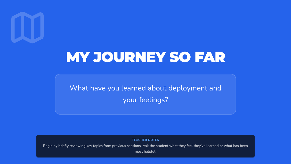 A six-session individual counseling sequence for 2nd-grade students navigating parental deployment. It focuses on emotional expression, coping strategies, and building a support network through a 'Hero's Mission' lens.