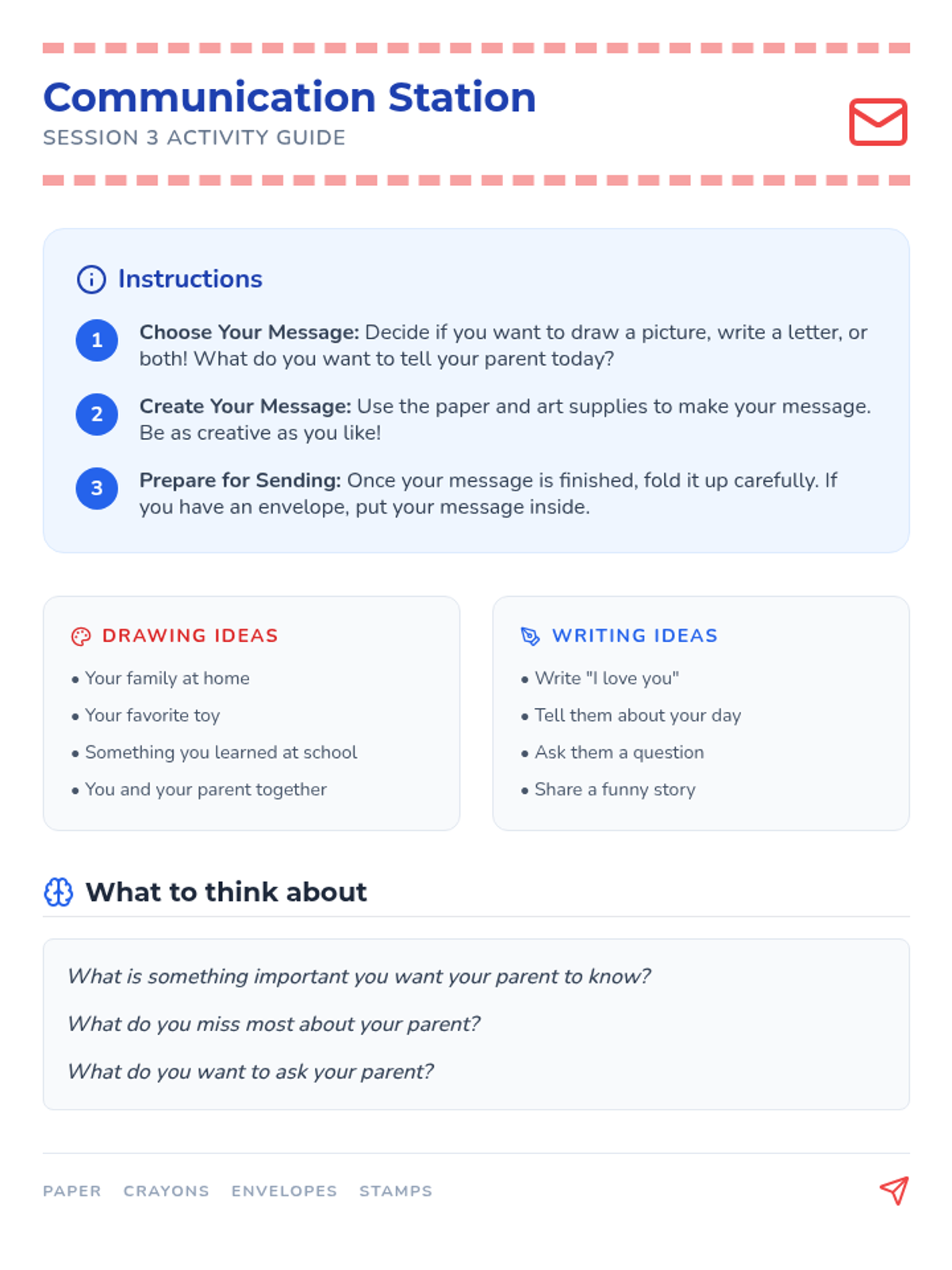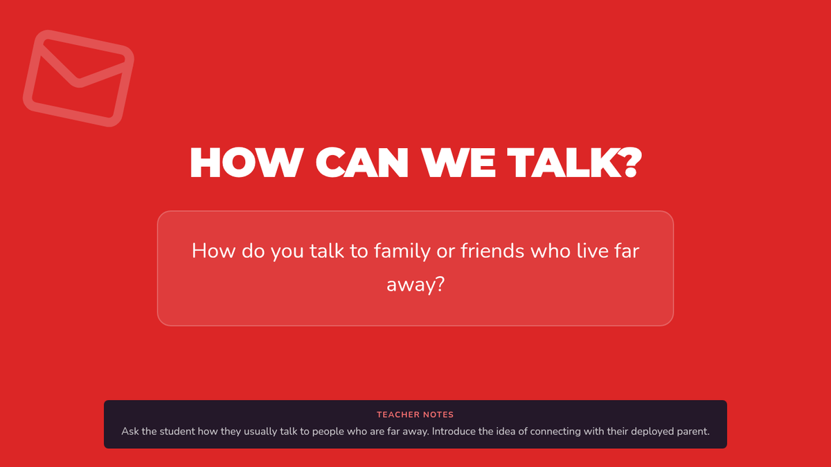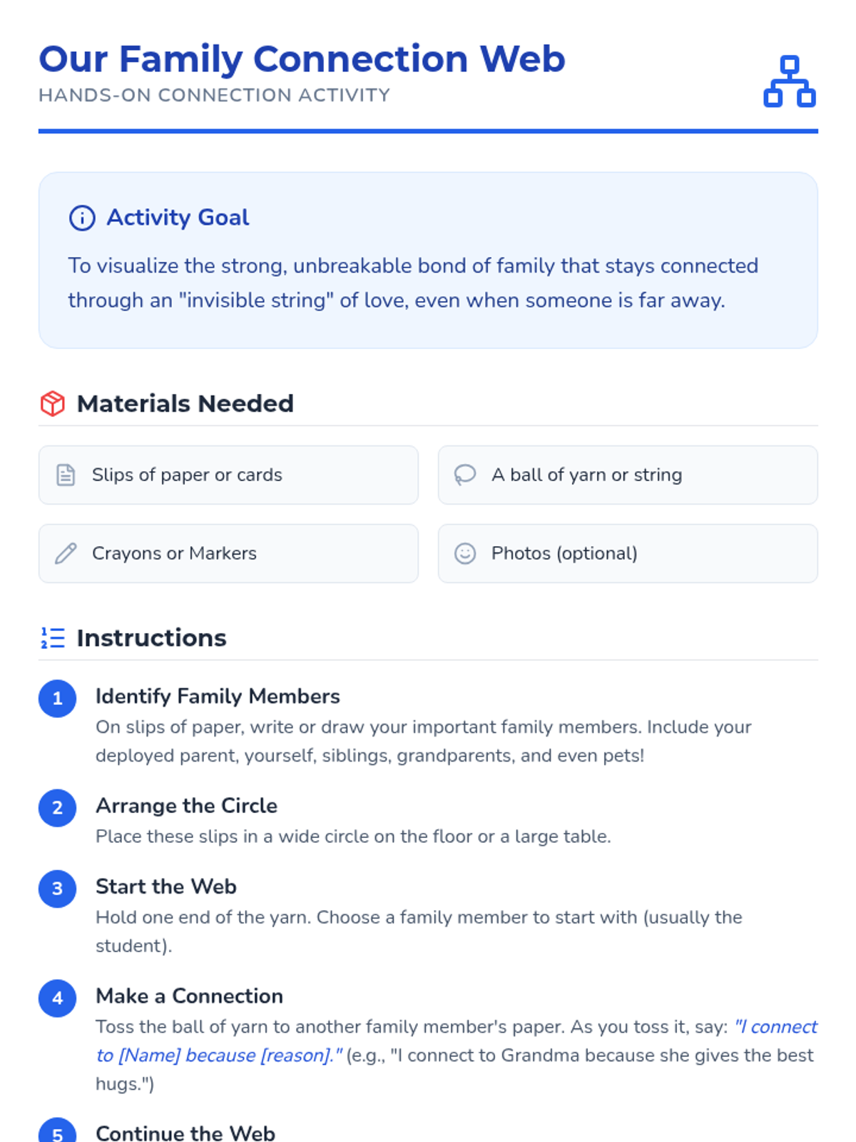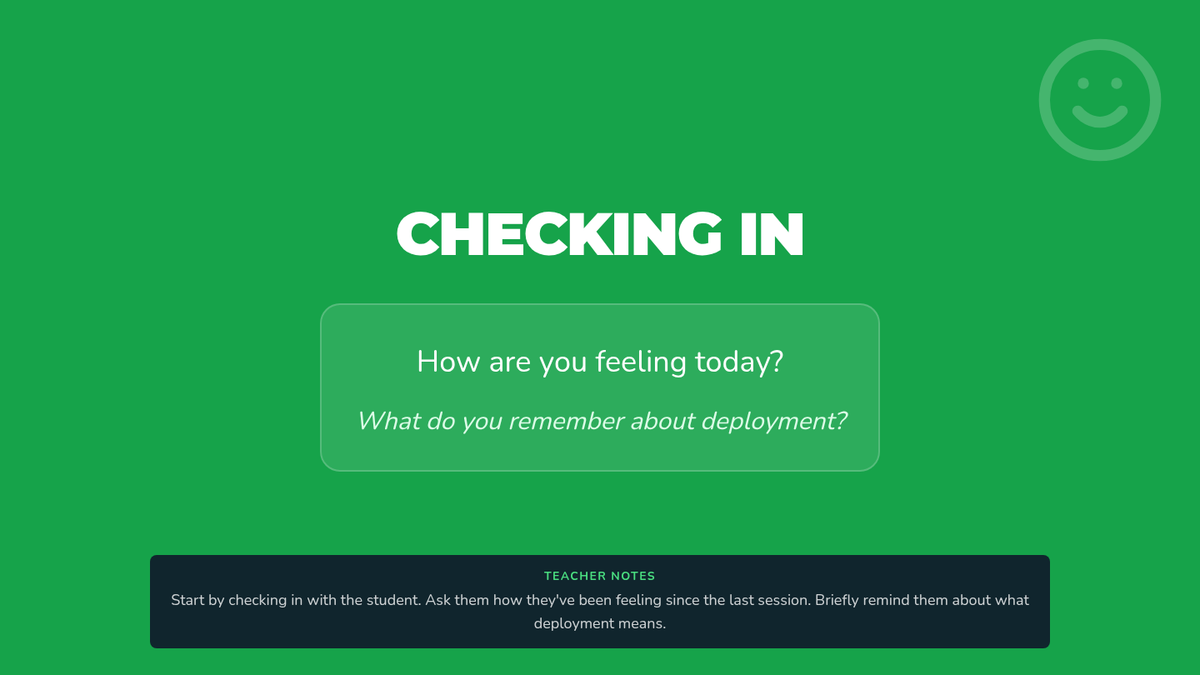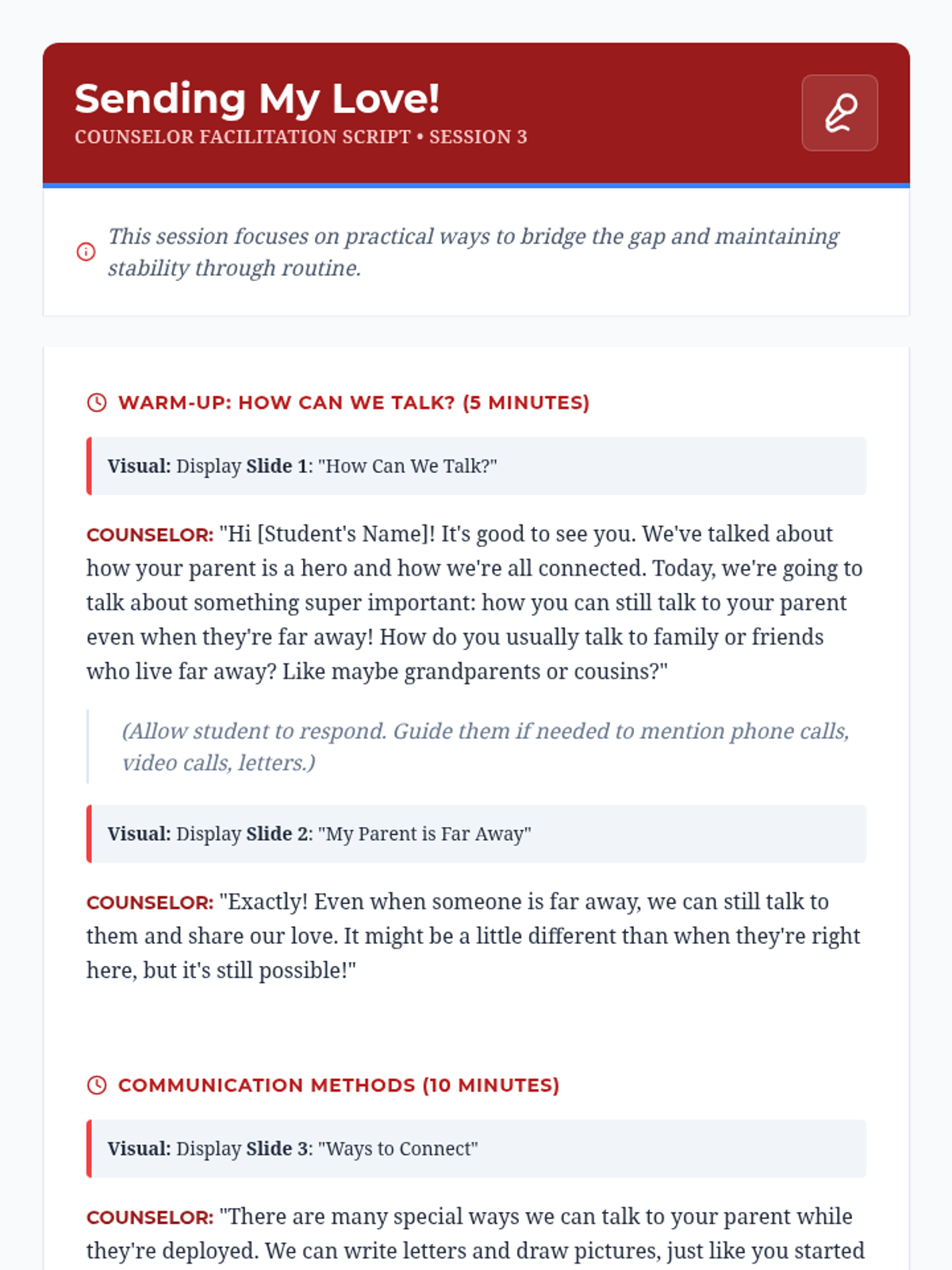 A six-session individual counseling sequence for 2nd-grade students navigating parental deployment. It focuses on emotional expression, coping strategies, and building a support network through a 'Hero's Mission' lens.
