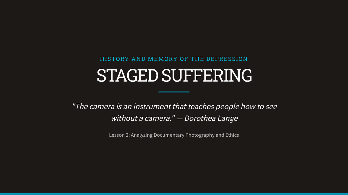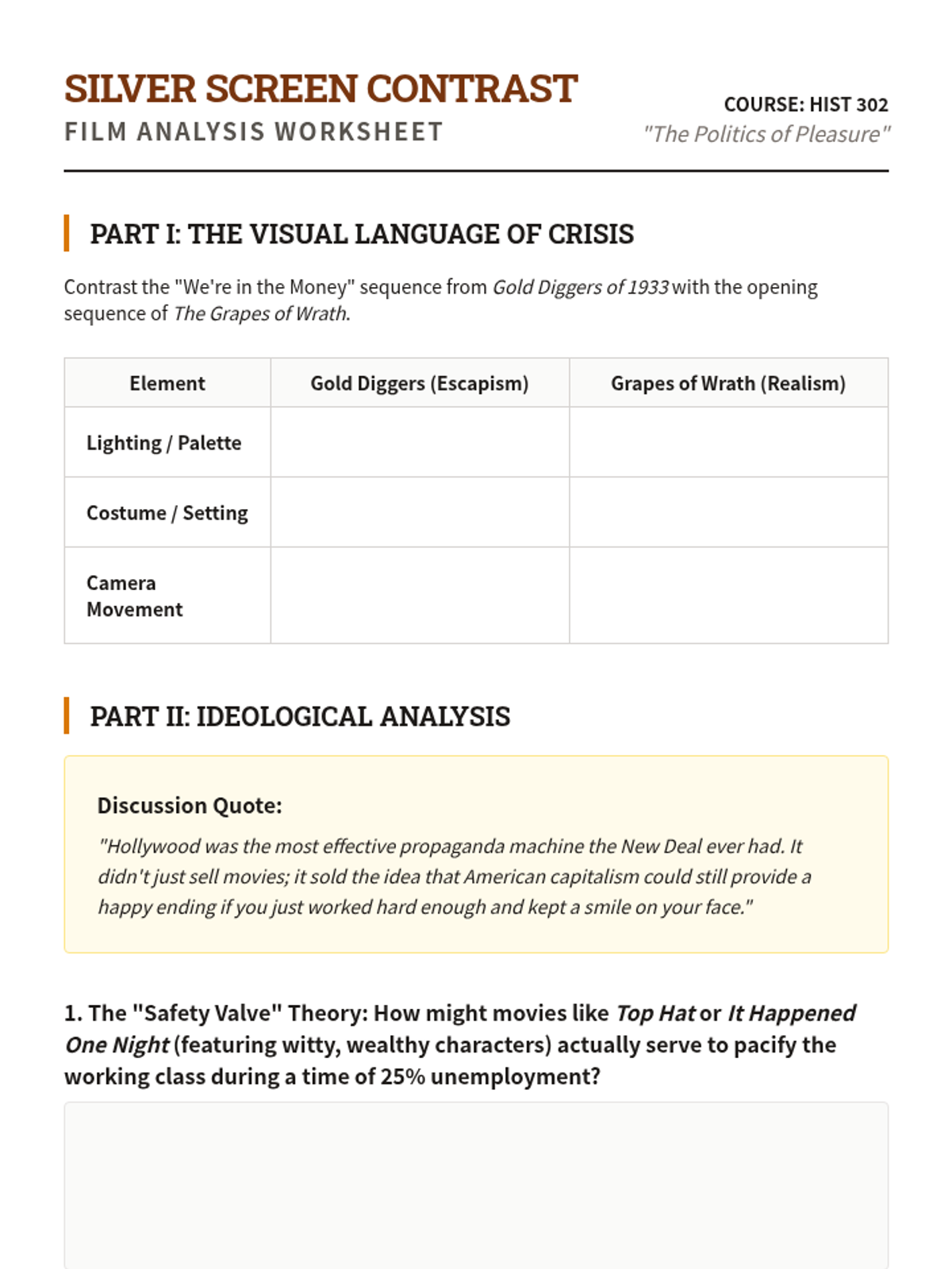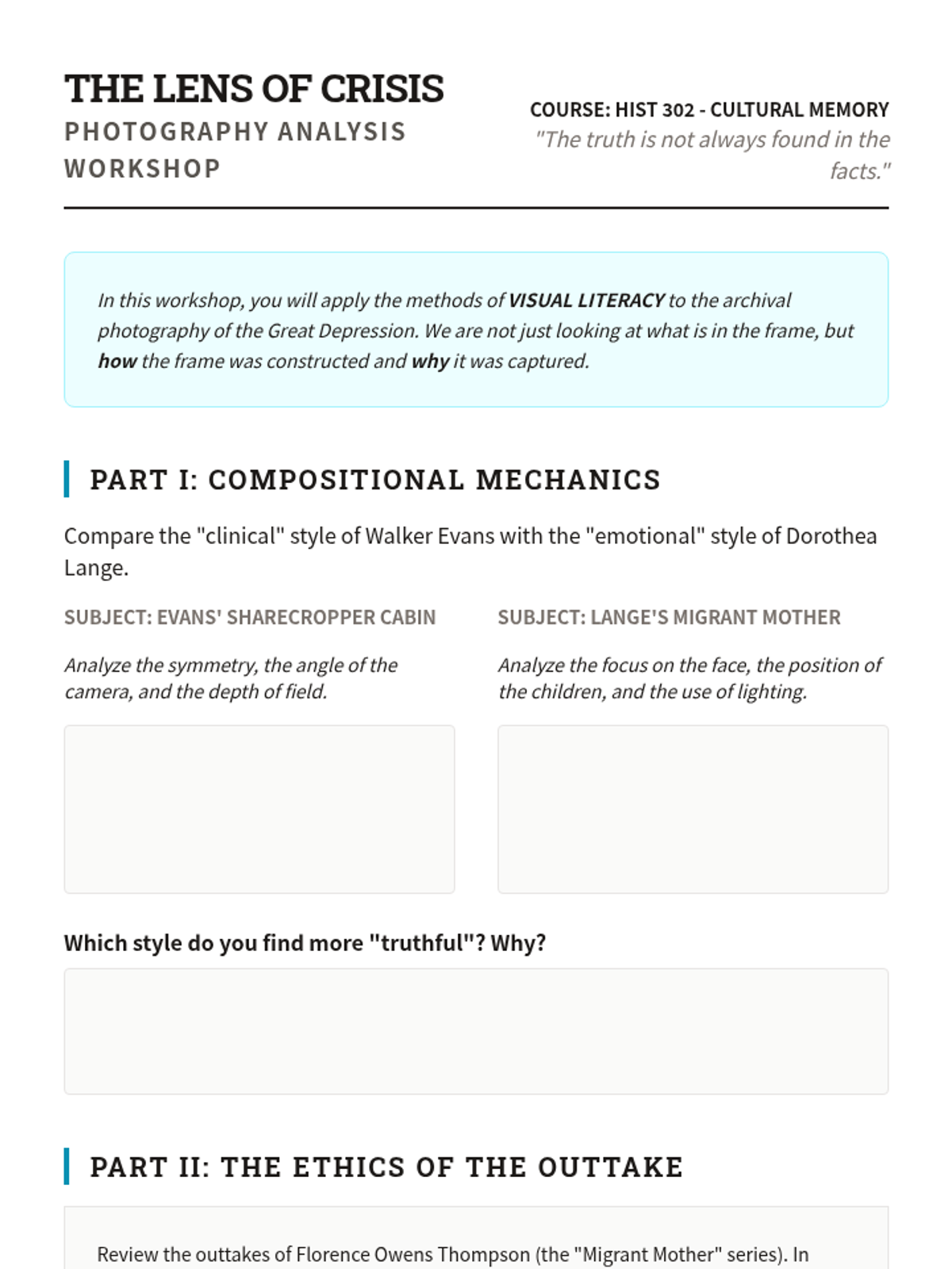 This undergraduate-level sequence explores the cultural history of the 1930s, analyzing how art, photography, cinema, and historiography shaped and contested the memory of the Great Depression. Students move from analyzing state-funded art projects to critiquing the ethics of documentary realism and the systemic racial inequalities encoded in recovery efforts.
