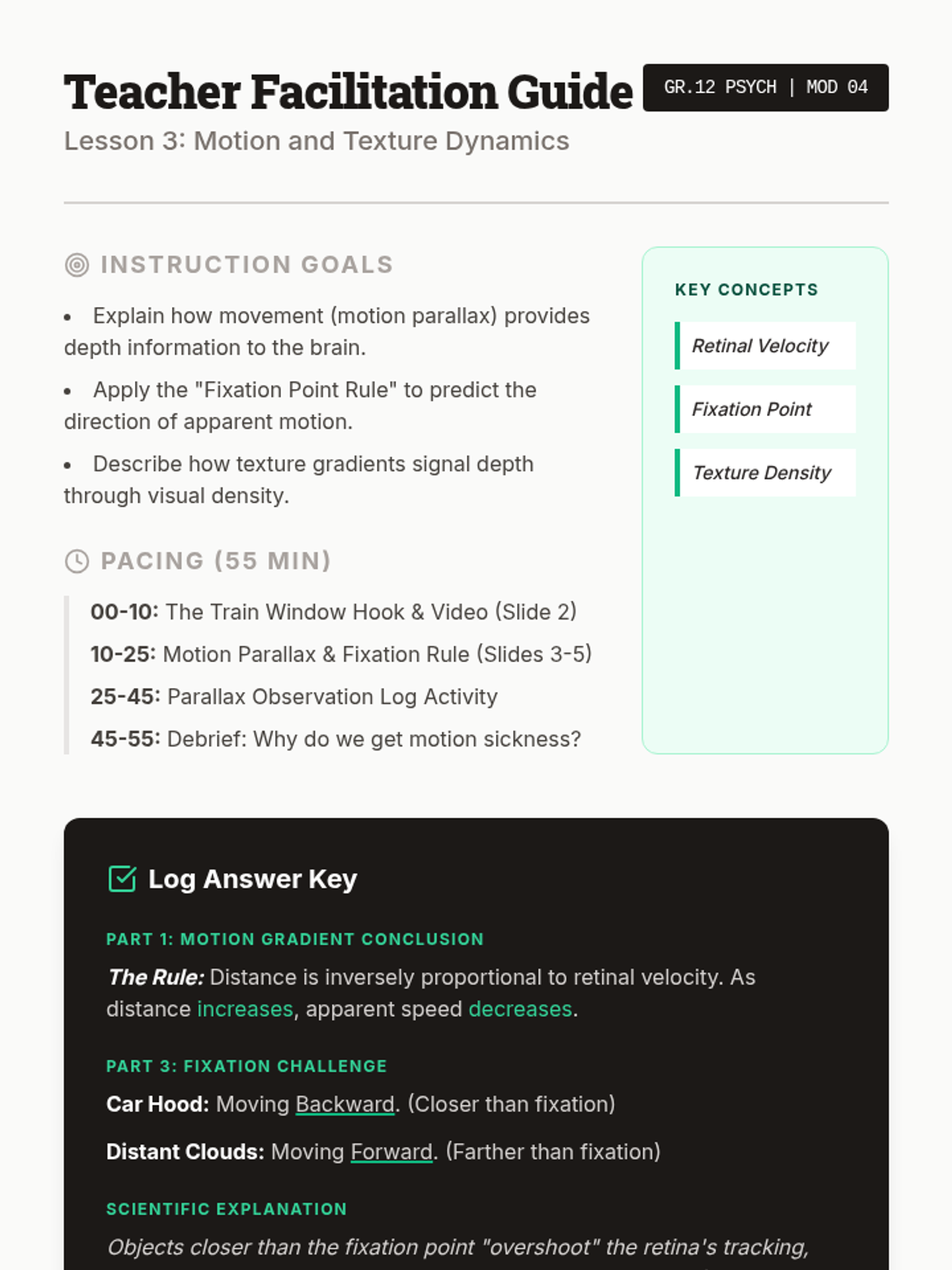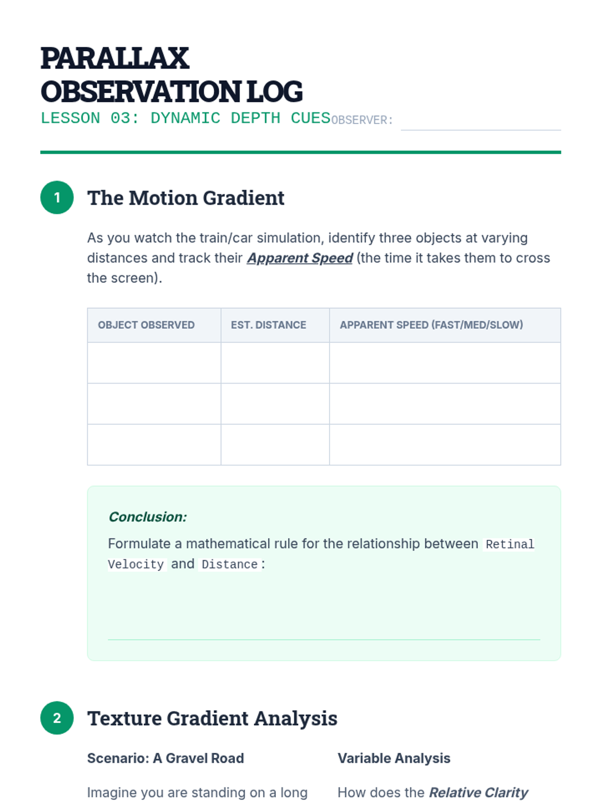 This sequence explores how the human brain constructs a 3D world from 2D retinal images. Students investigate binocular and monocular depth cues, motion parallax, and perceptual constancies through hands-on labs, art analysis, and digital critique.