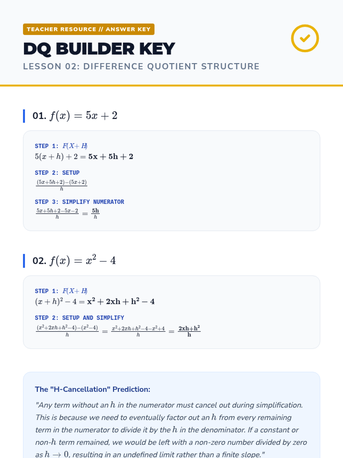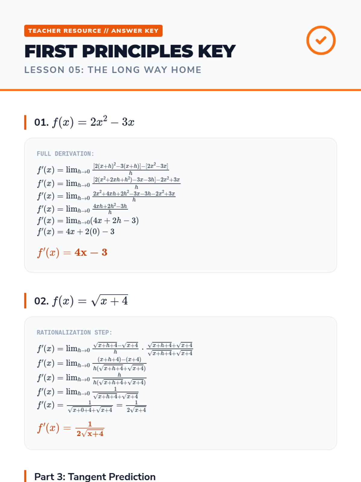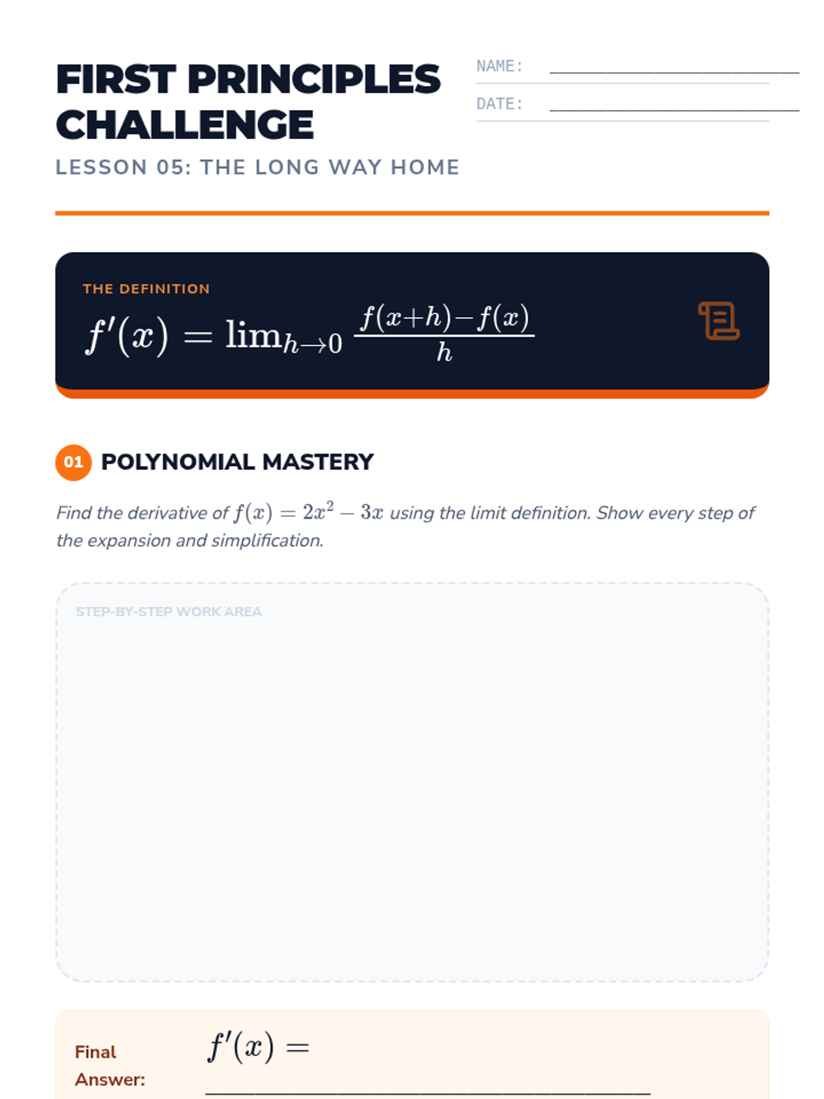 This sequence bridges the gap between pre-calculus algebra and calculus by rigorously defining the derivative through geometric intuition, the formal limit definition, and varied notation systems. Students transition from average to instantaneous rates of change, explore differentiability, and master the algebraic manipulation required to find derivatives from first principles.