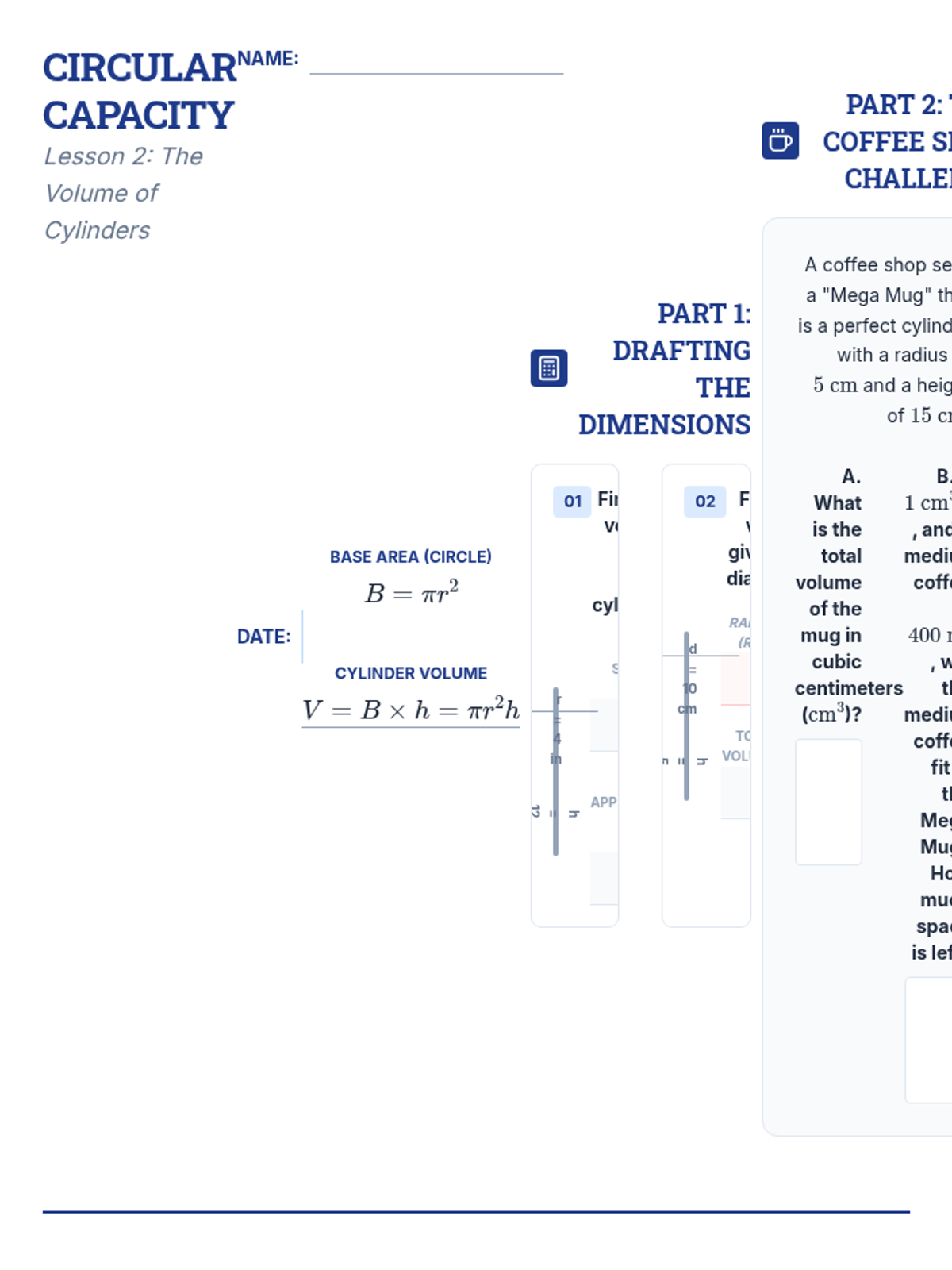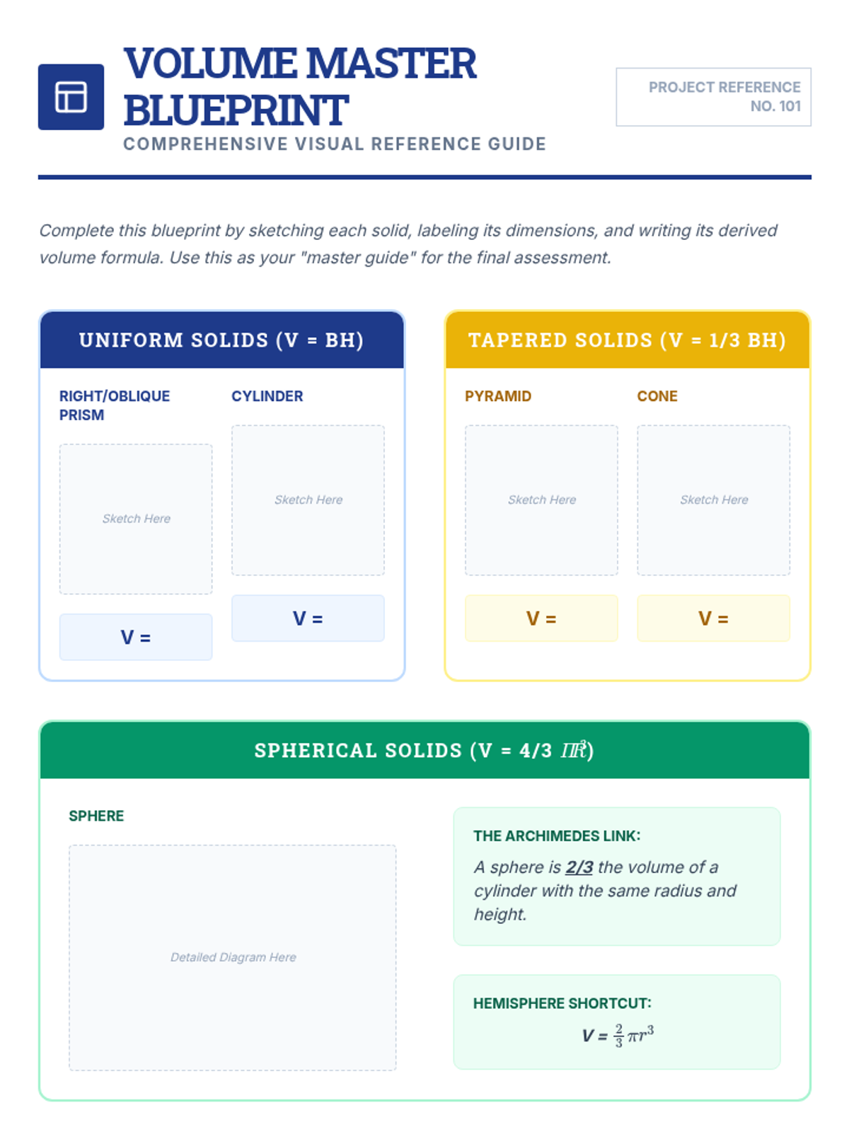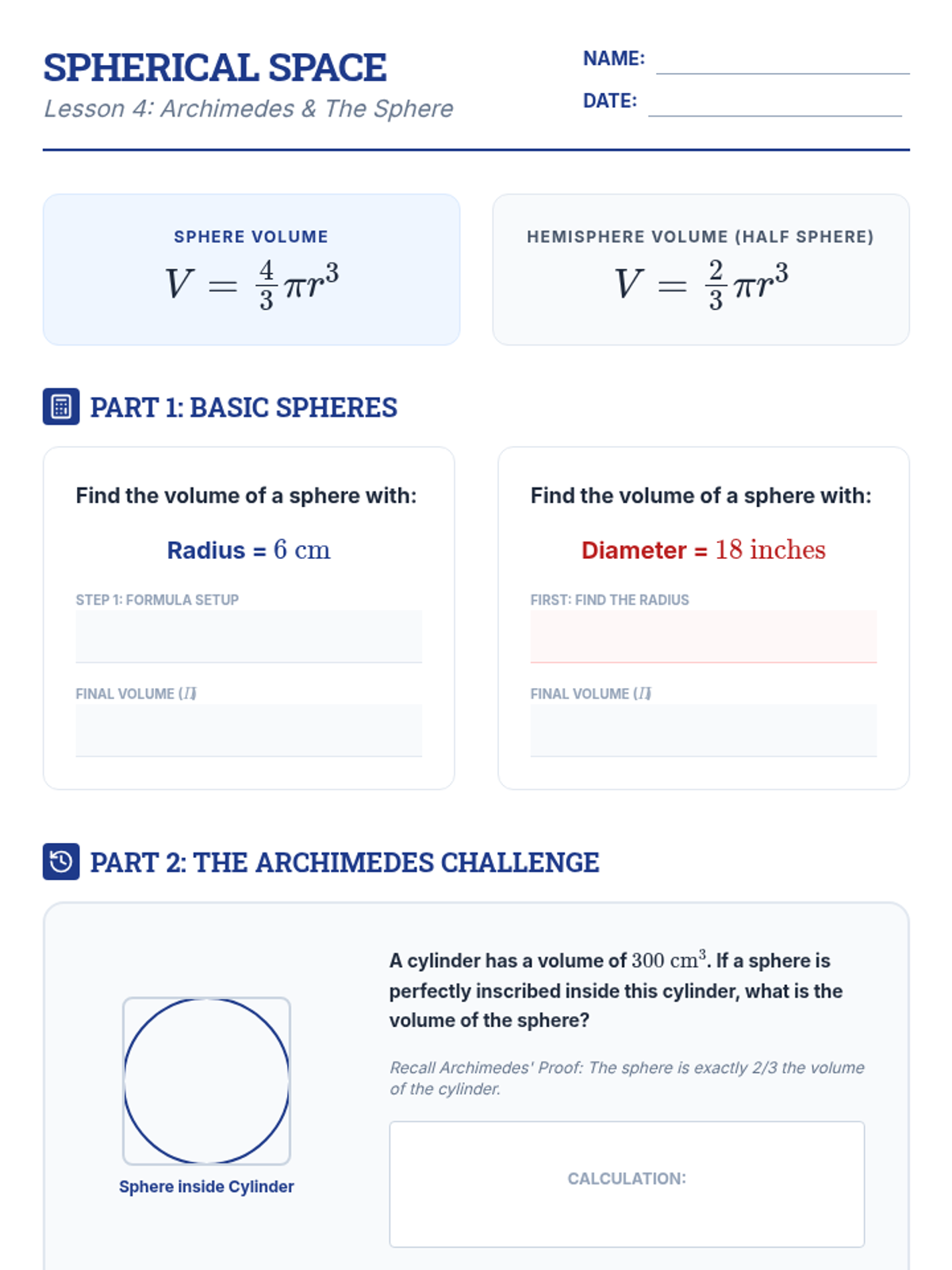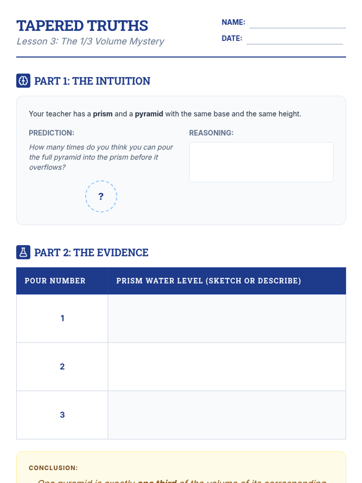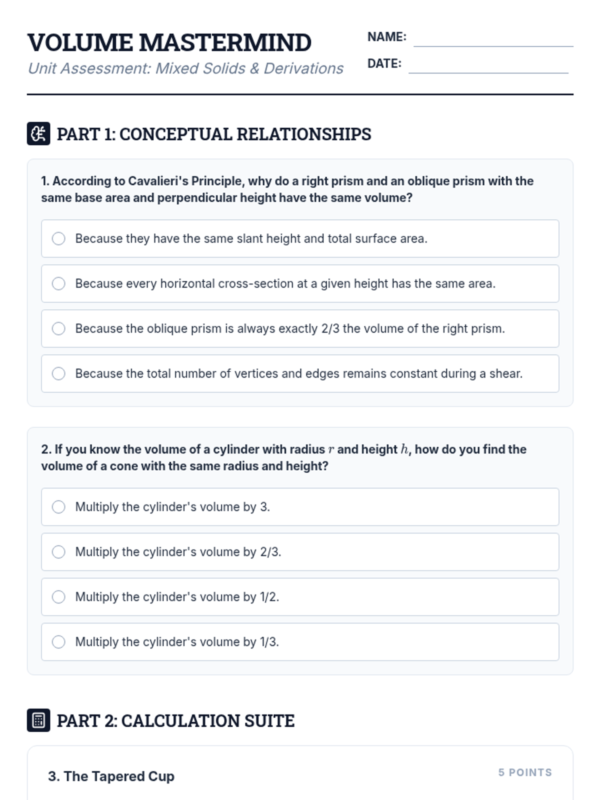 This inquiry-based geometry sequence guides 10th-grade students through the conceptual derivation and application of volume formulas. Students explore Cavalieri's Principle, the 1/3 relationship between tapered and non-tapered solids, and the historic sphere-cylinder relationship.