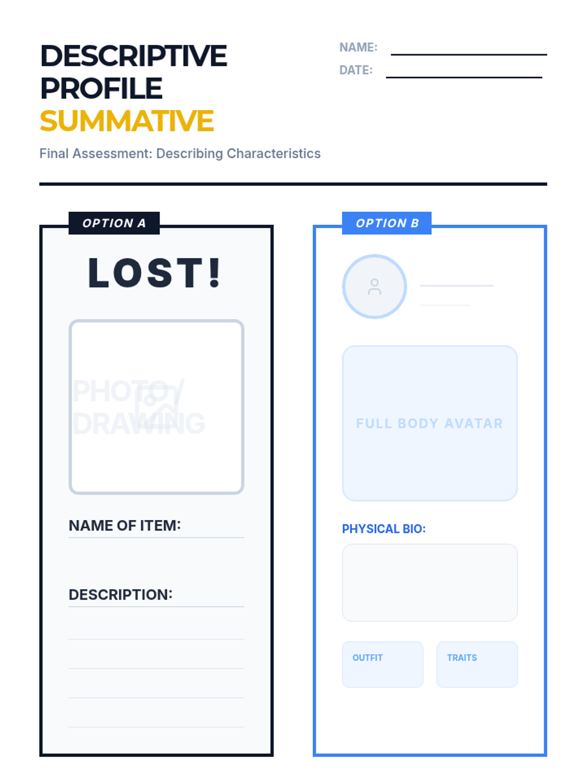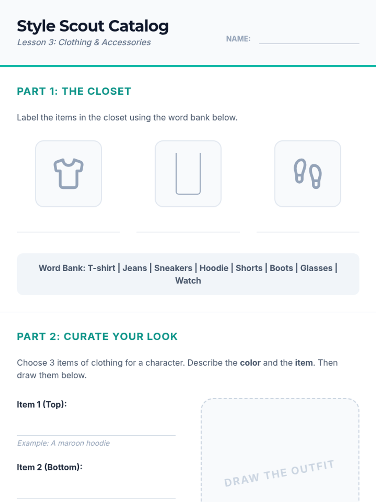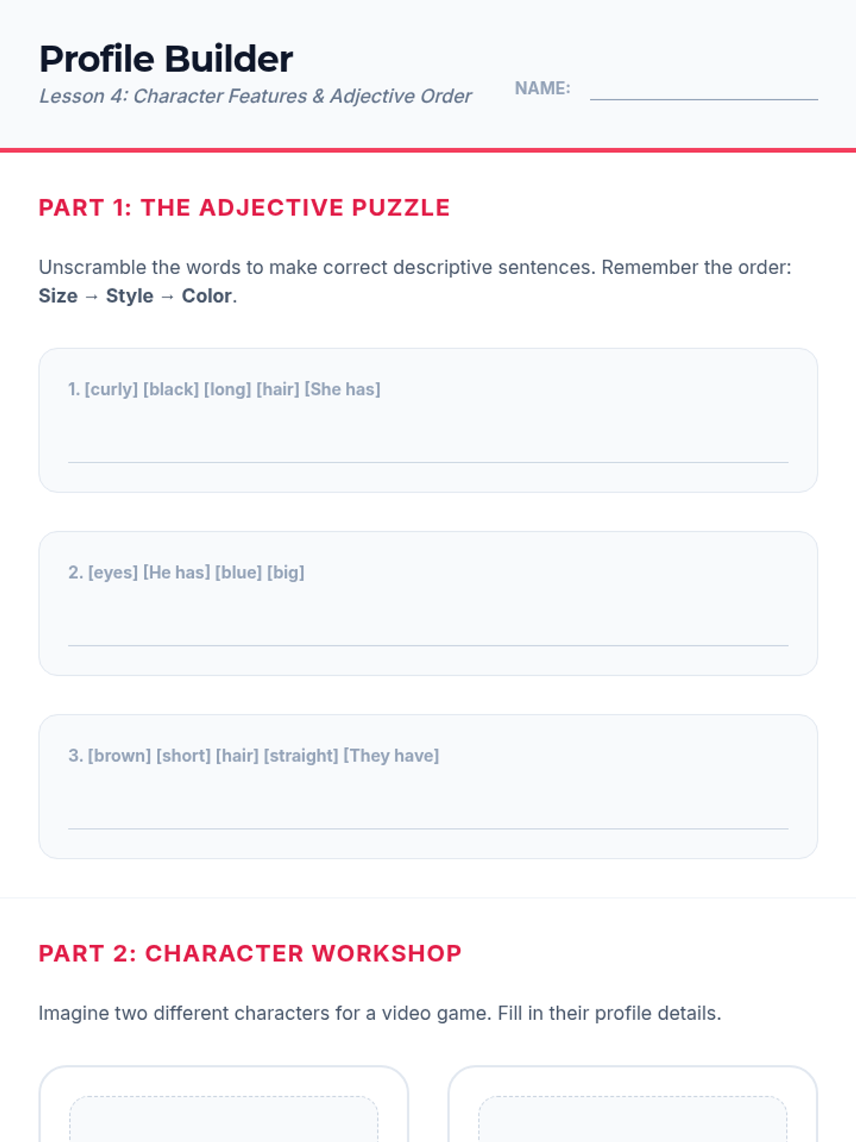 A comprehensive 8th-grade English Language Learning sequence focused on basic descriptive vocabulary. Students progress from naming colors and sizes to constructing detailed physical profiles for people and objects using correct adjective order and teen-relevant contexts like fashion and avatars.
