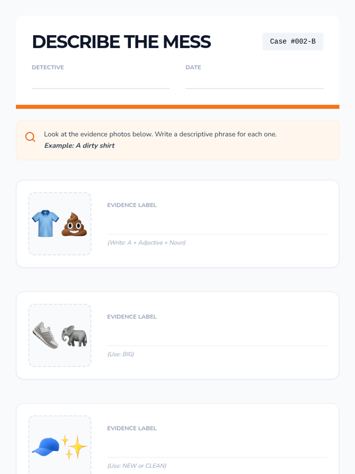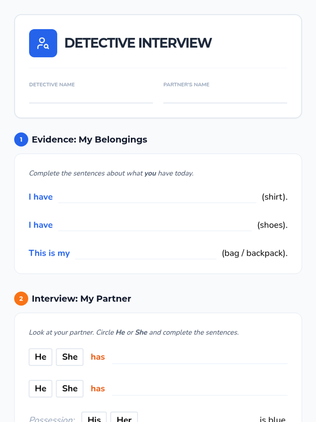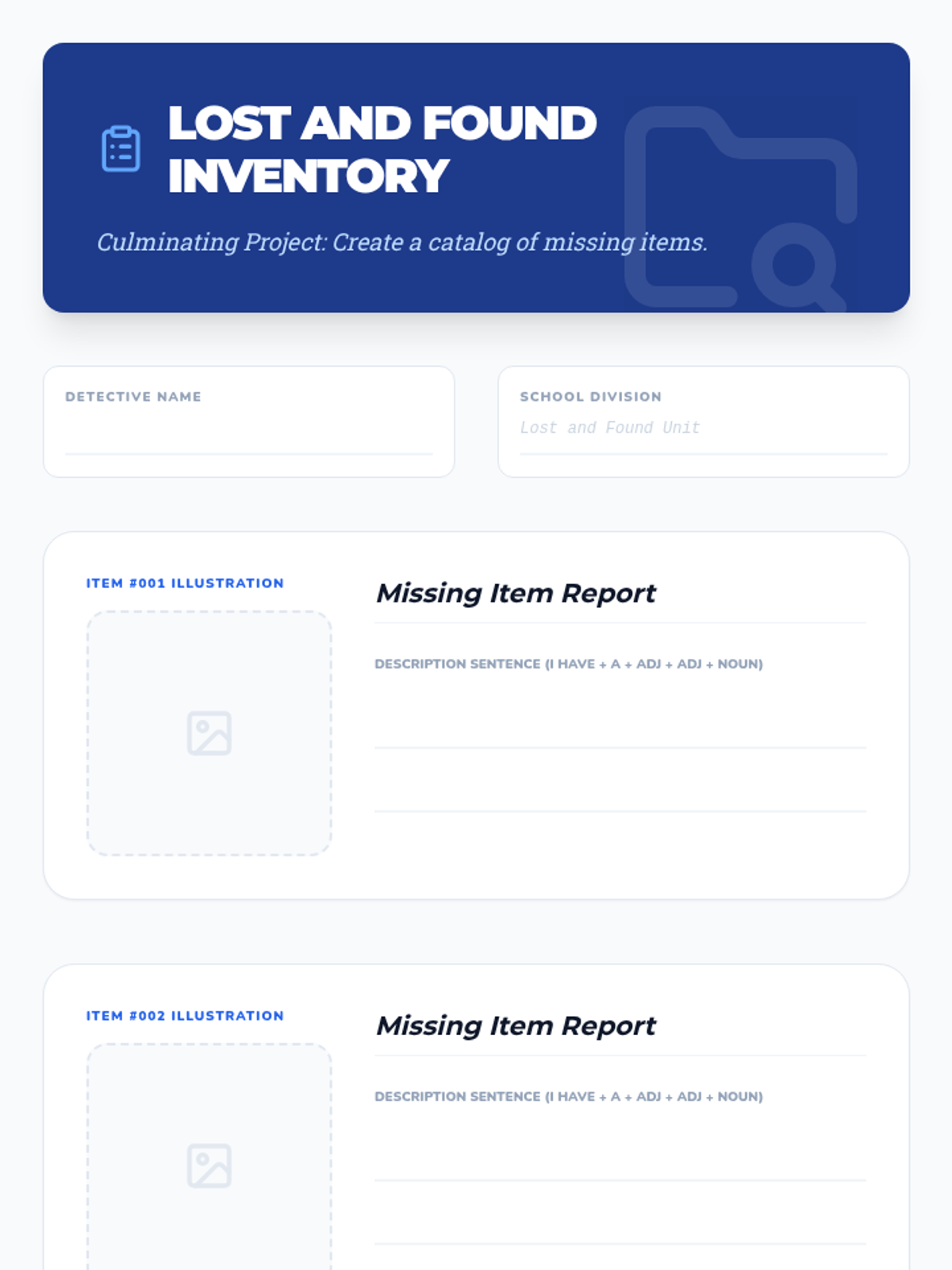 A beginner English sequence focused on naming and describing objects, clothes, and physical appearance. Students progress from simple vocabulary to full descriptive sentences through detective-themed activities like creating a 'Lost and Found' inventory and 'Wanted' posters.