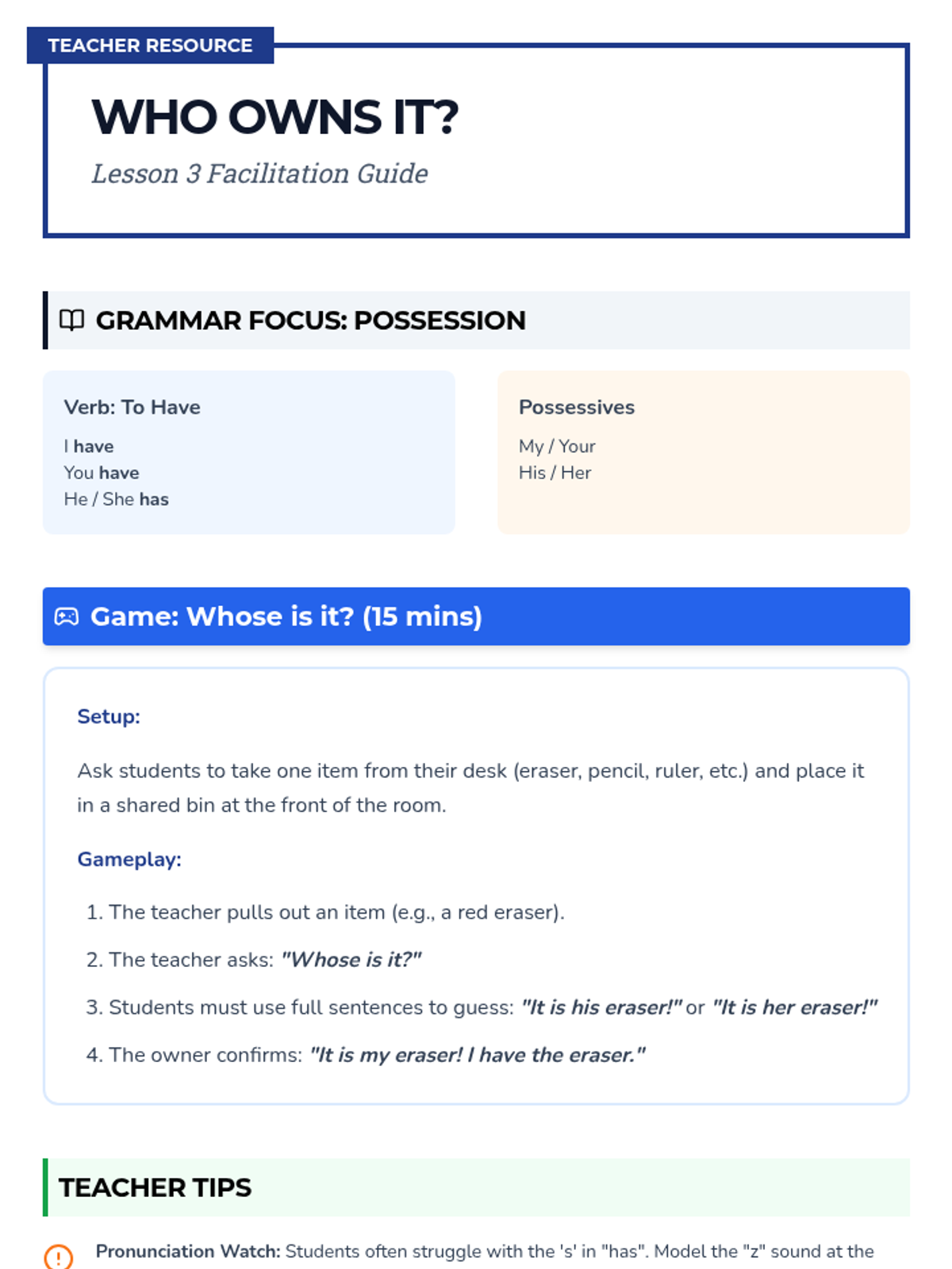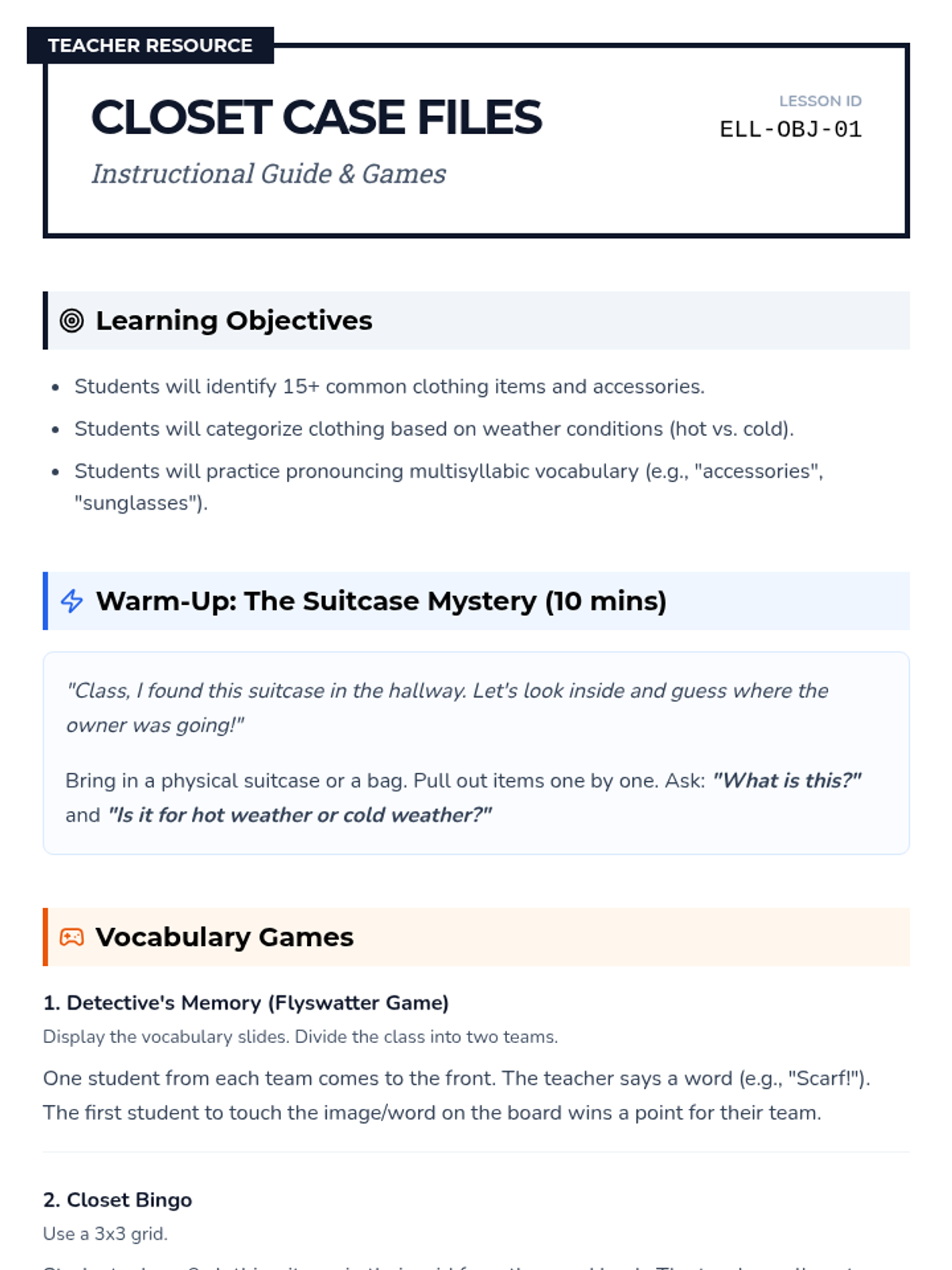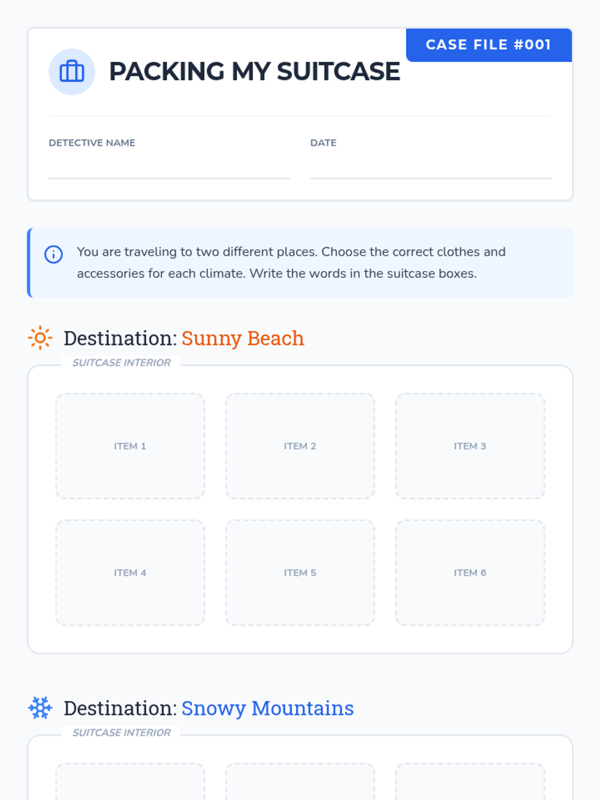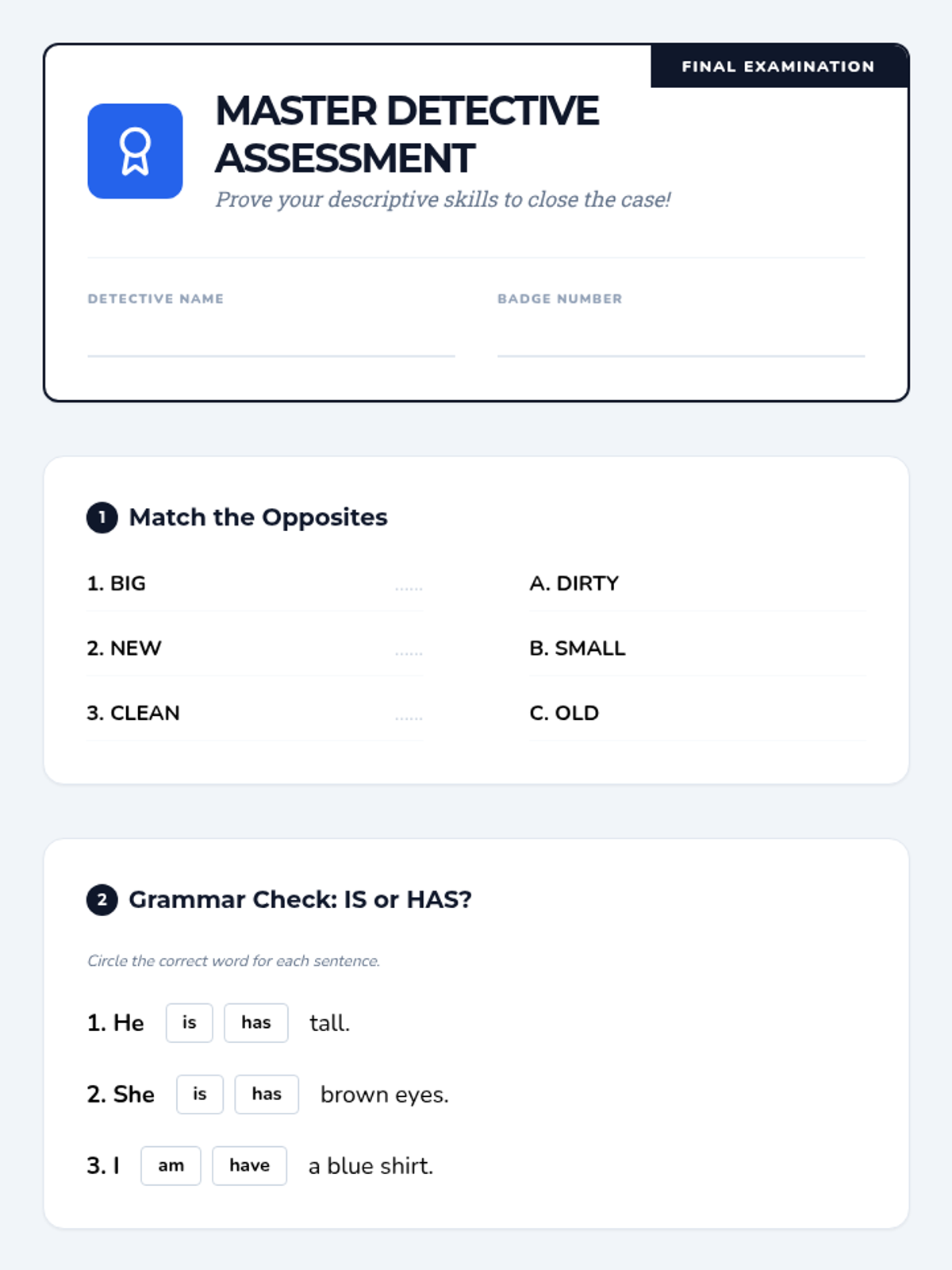 A beginner English sequence focused on naming and describing objects, clothes, and physical appearance. Students progress from simple vocabulary to full descriptive sentences through detective-themed activities like creating a 'Lost and Found' inventory and 'Wanted' posters.