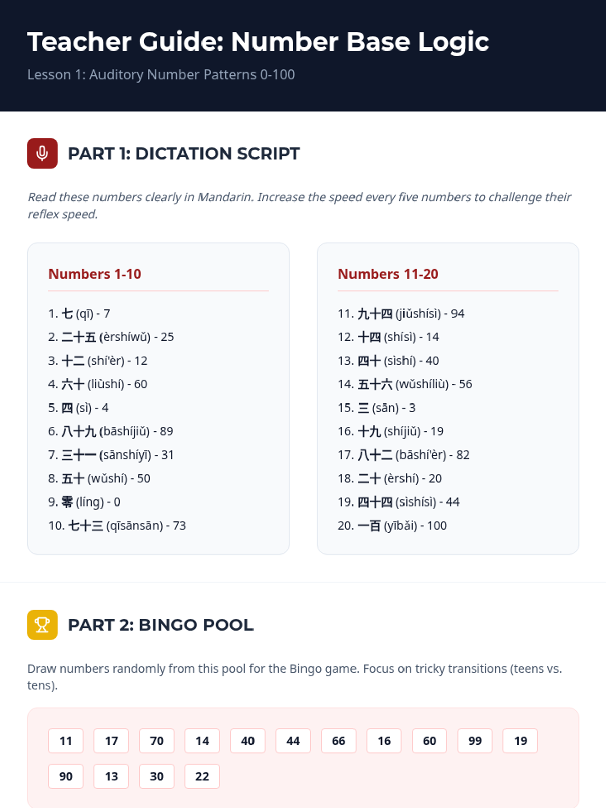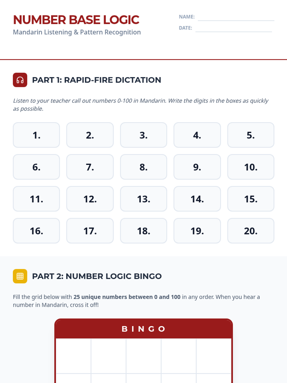 This sequence focuses on the auditory recognition of numerical patterns in Mandarin Chinese, essential for understanding prices, phone numbers, dates, and time. Students leverage the logical structure of Mandarin counting to progress from basic digits to complex date and time formatting.