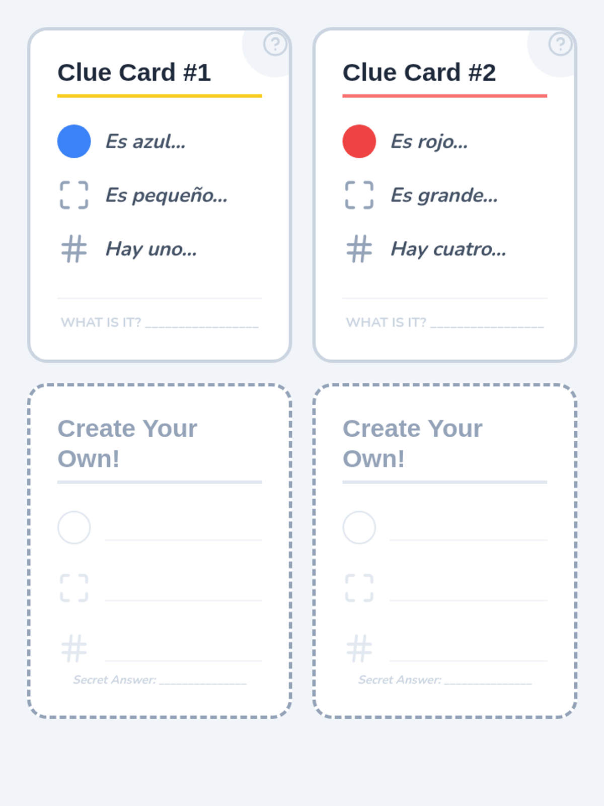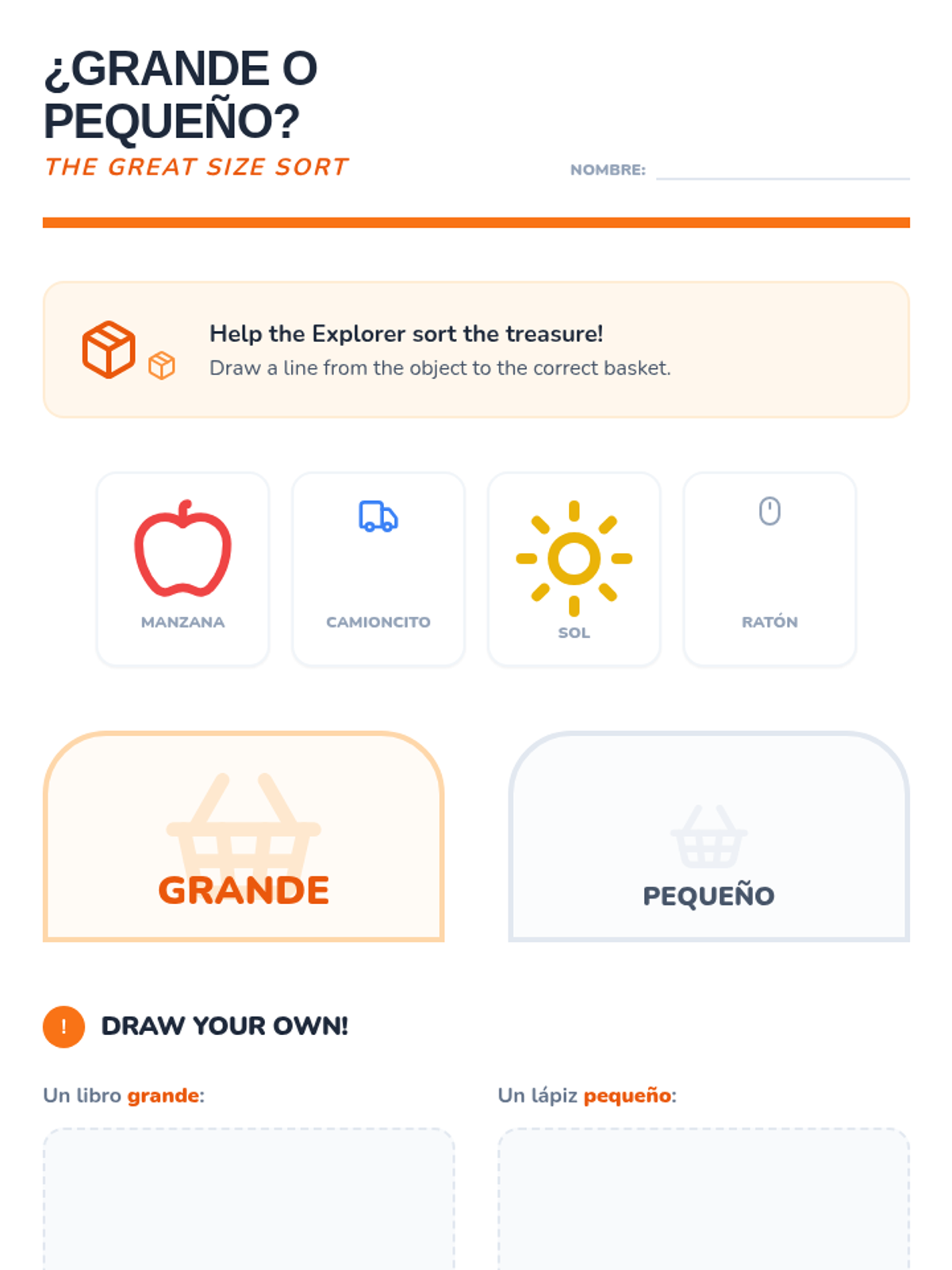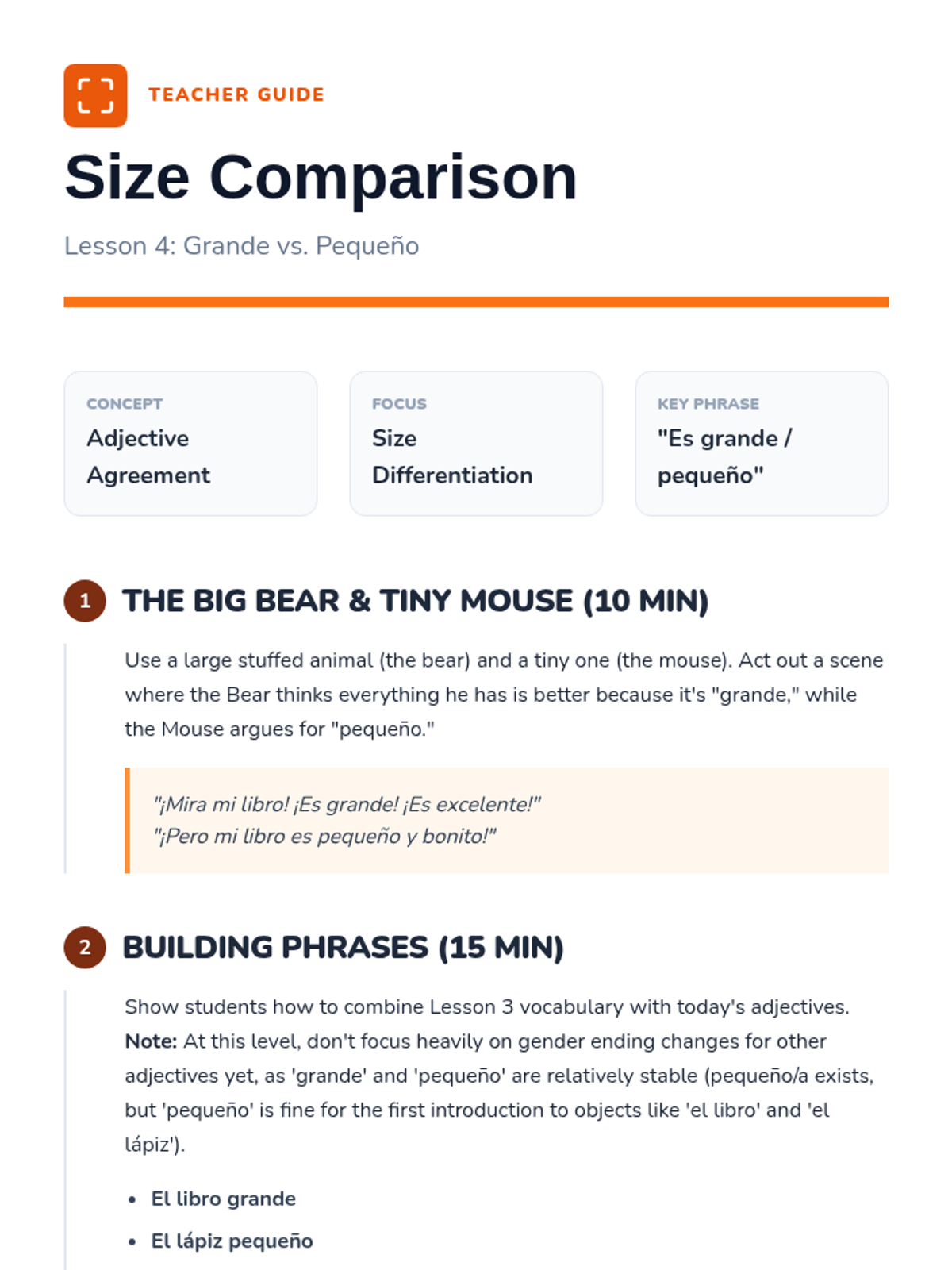 A 5-lesson introductory Spanish sequence for 2nd graders focusing on colors, numbers, classroom objects, and size adjectives. Students progress from simple identification to synthesizing descriptive phrases for a 'Mystery Box' challenge.