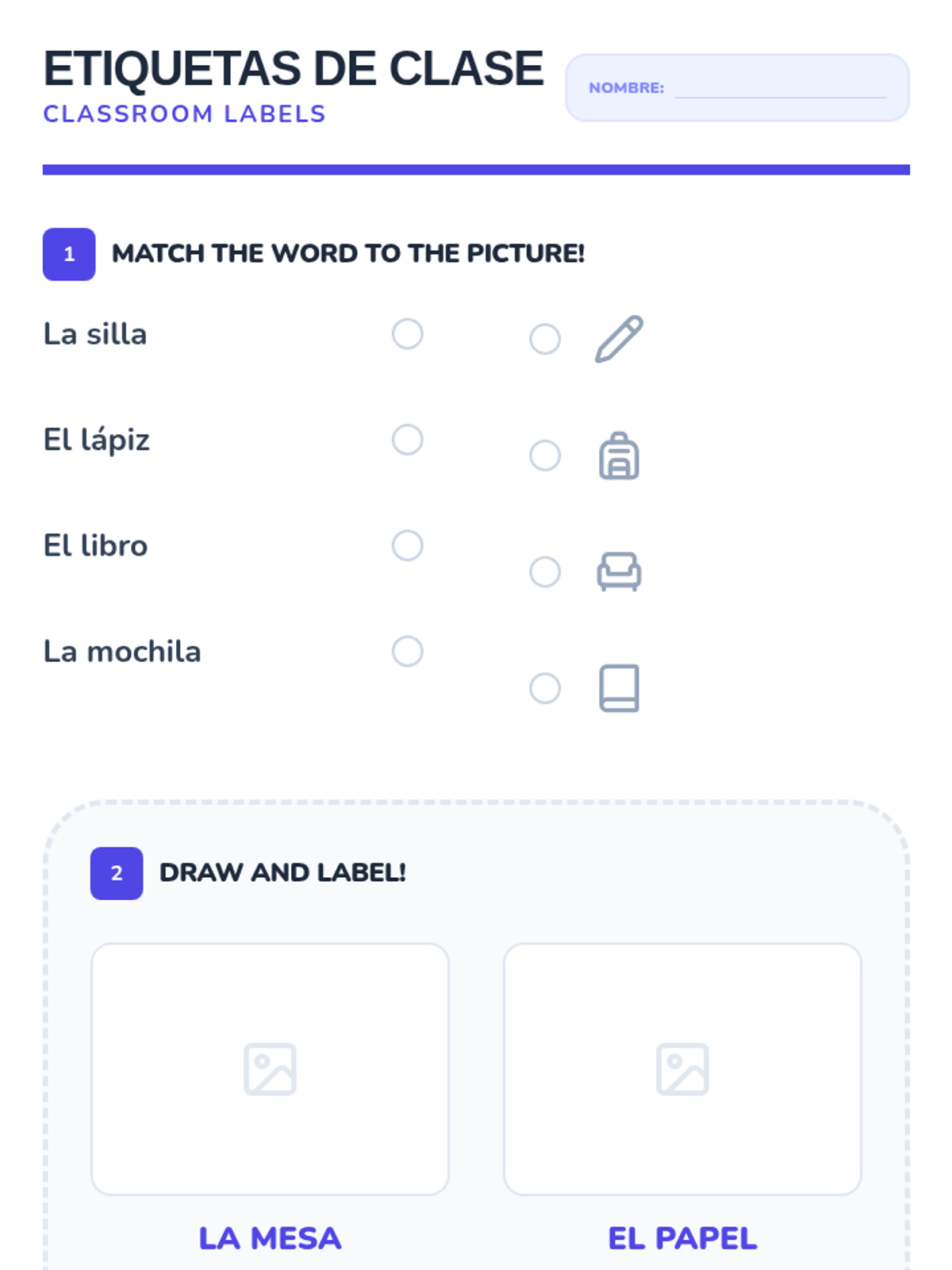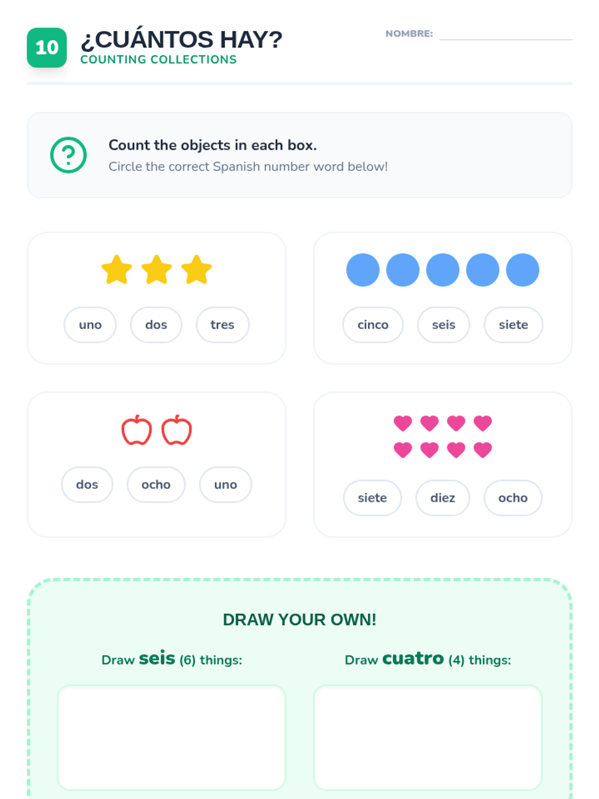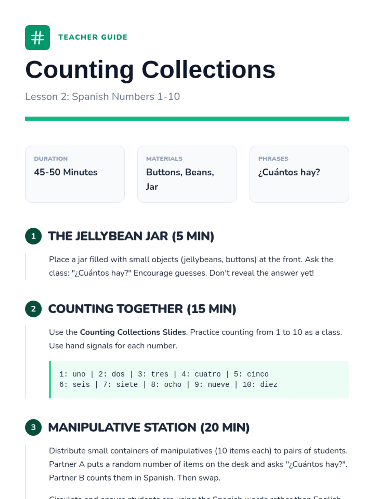 A 5-lesson introductory Spanish sequence for 2nd graders focusing on colors, numbers, classroom objects, and size adjectives. Students progress from simple identification to synthesizing descriptive phrases for a 'Mystery Box' challenge.
