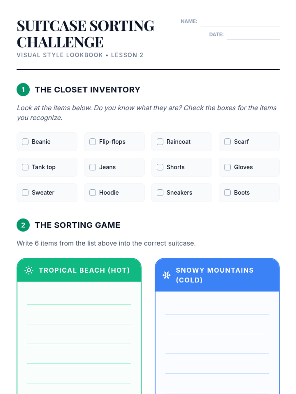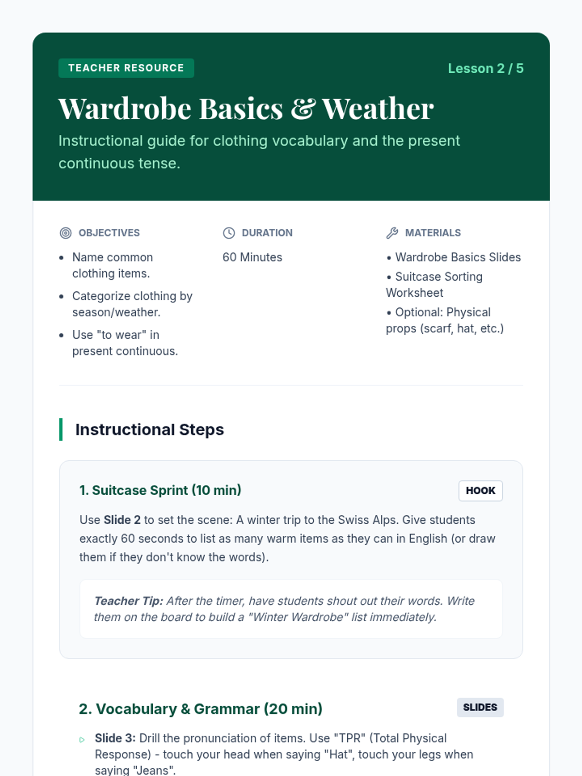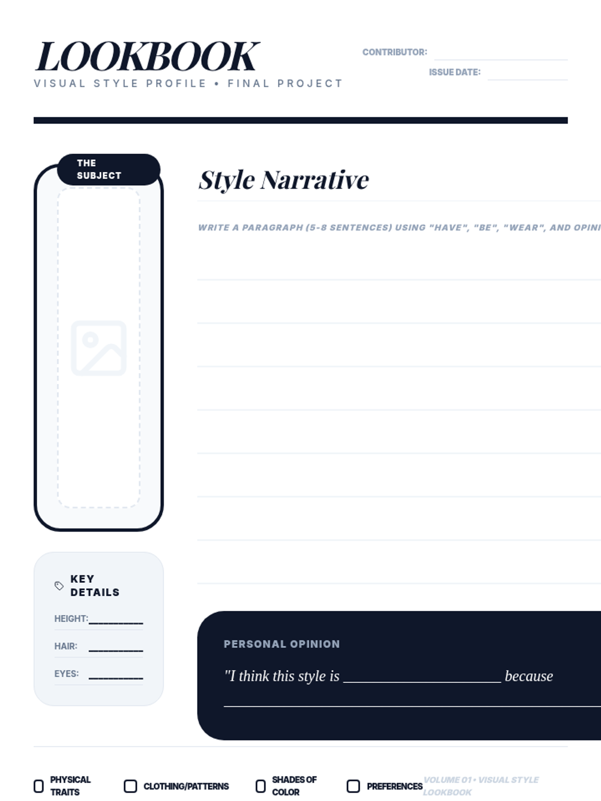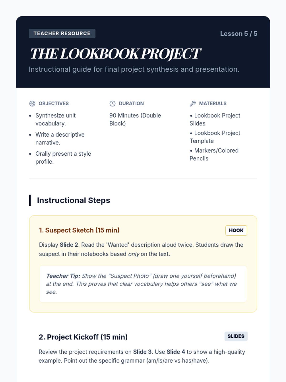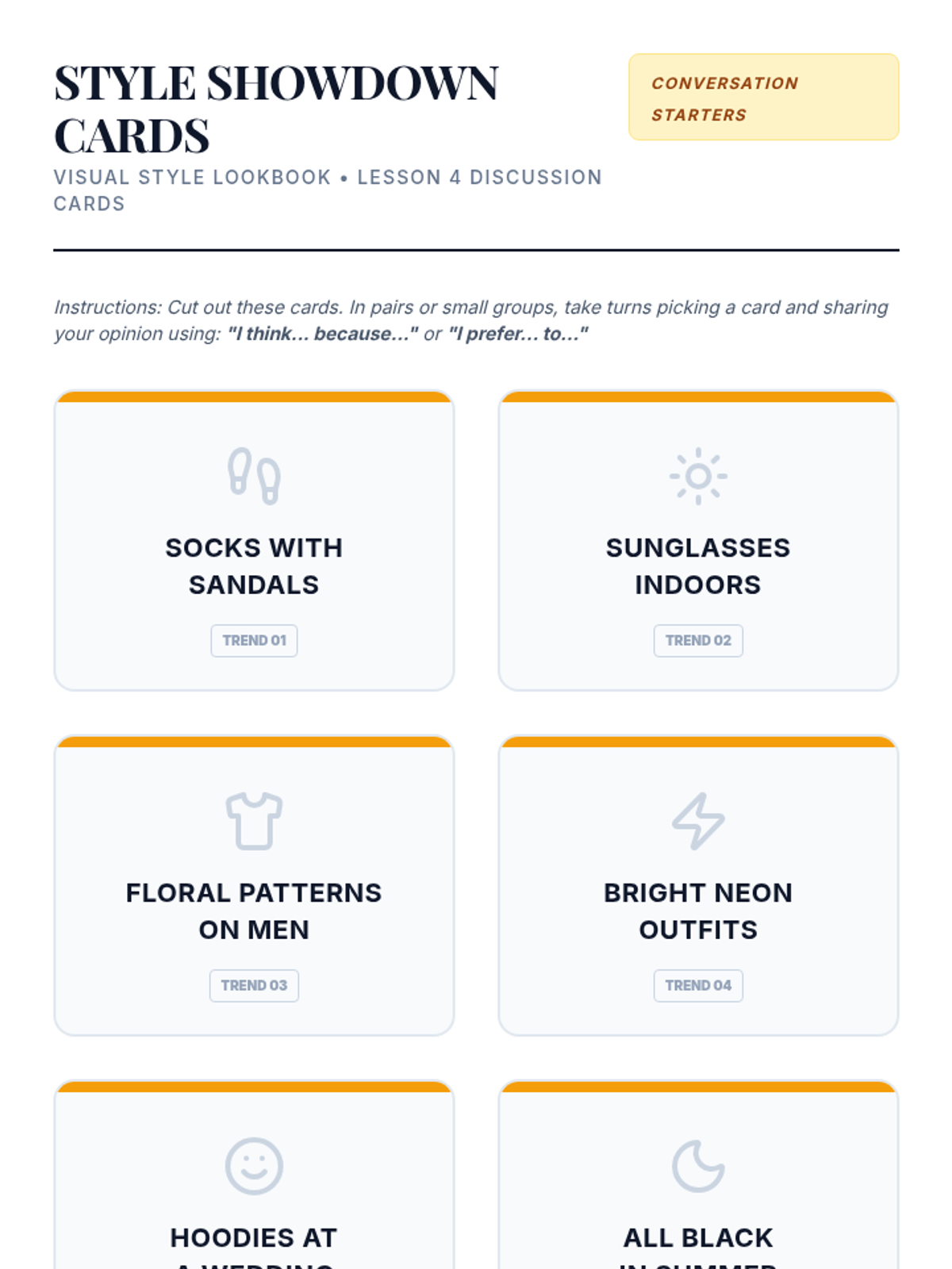 A 5-lesson sequence for 9th-grade Beginner English students focused on visual description, clothing, and personal style. Students progress from basic colors and patterns to expressing personal fashion preferences and creating a comprehensive style profile.