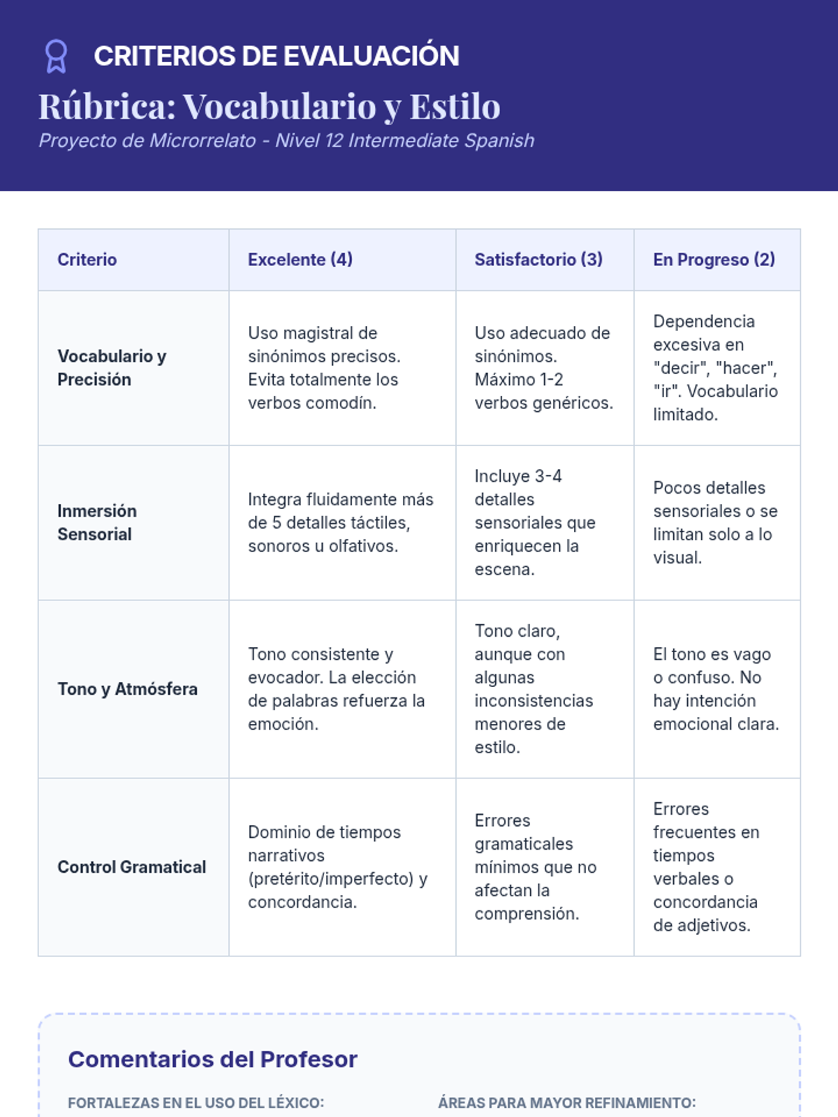 A 12th-grade Spanish sequence focused on refining narrative voice through synonym expansion, sensory details, and emotional nuance to move beyond basic functional communication.
