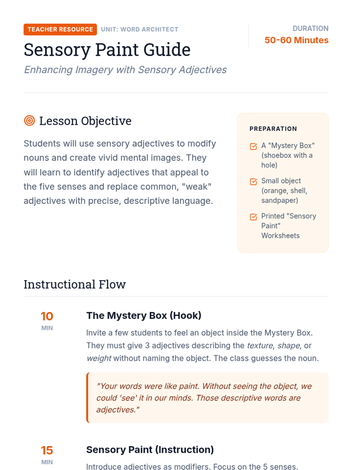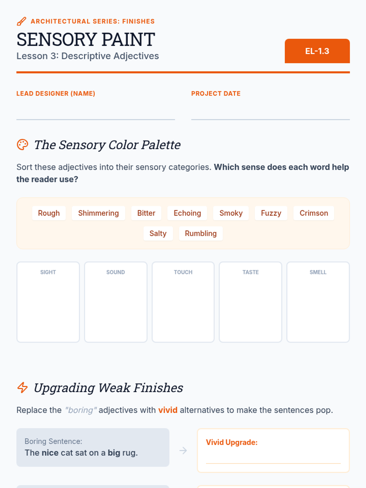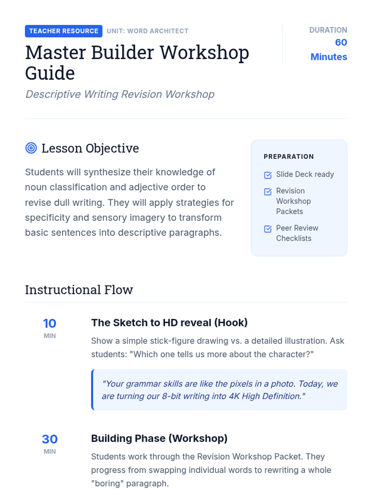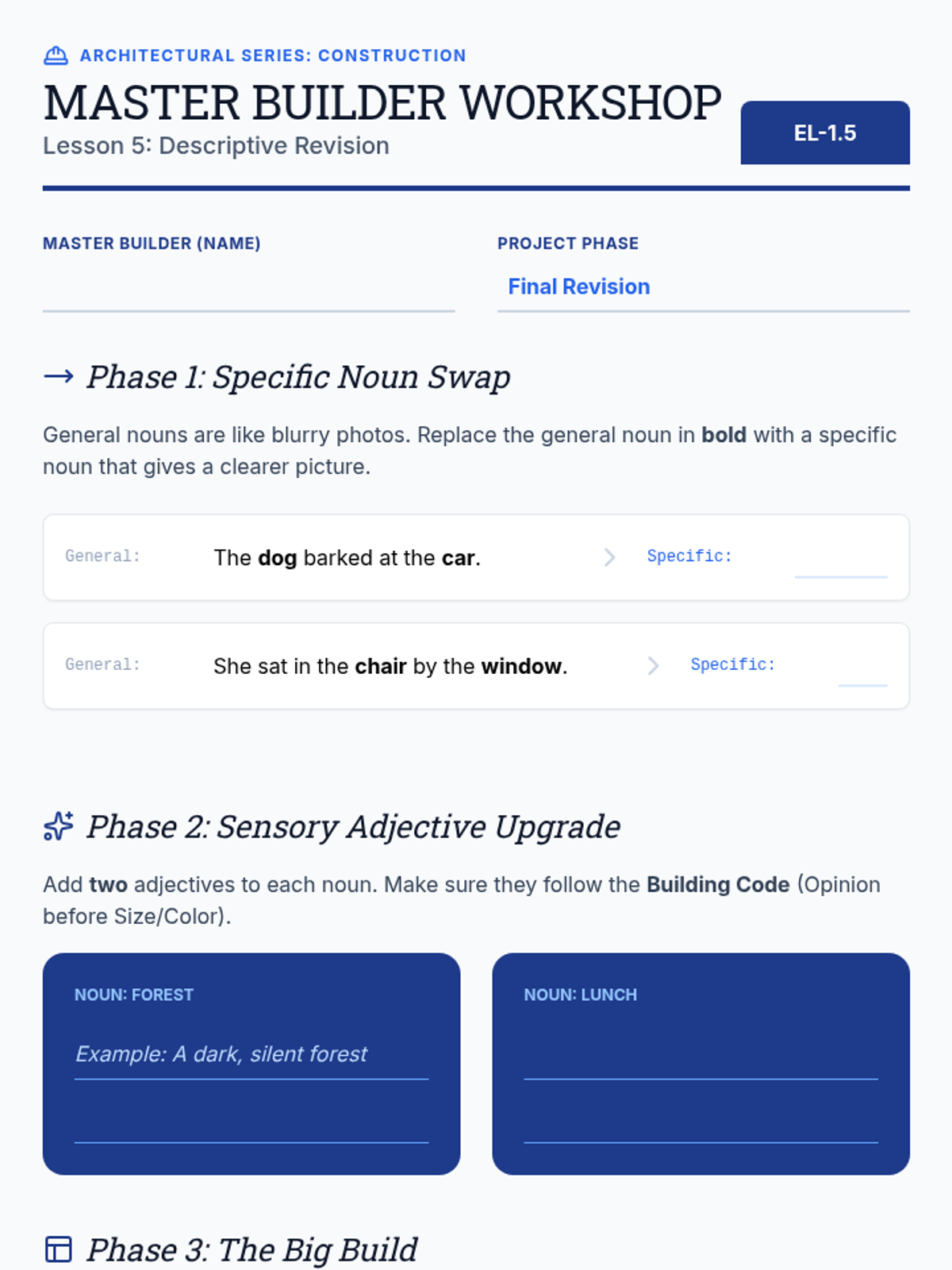 A comprehensive 4th-grade ELA unit focusing on noun classification and descriptive adjective usage to enhance student writing. Students move from basic identification to strategic application of precise nouns and ordered adjectives.