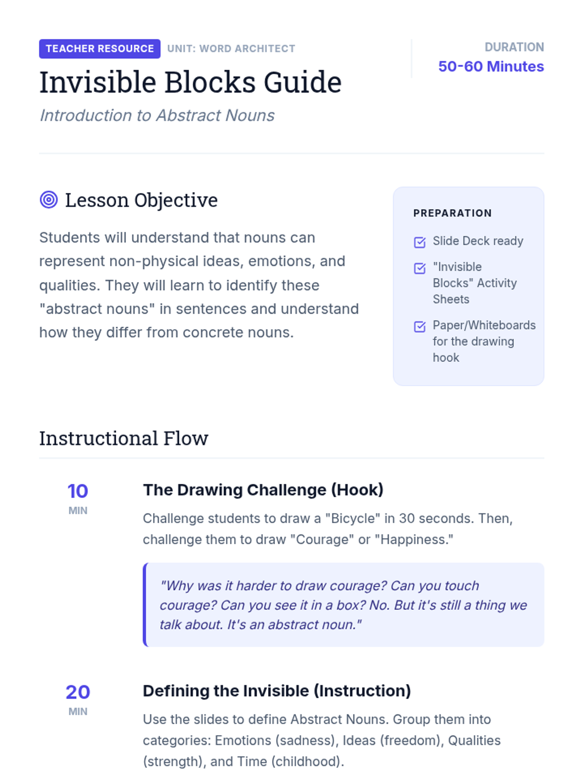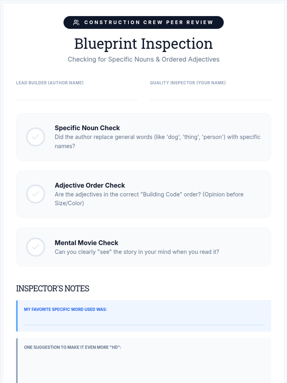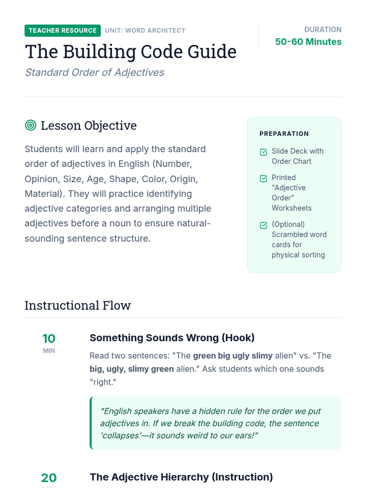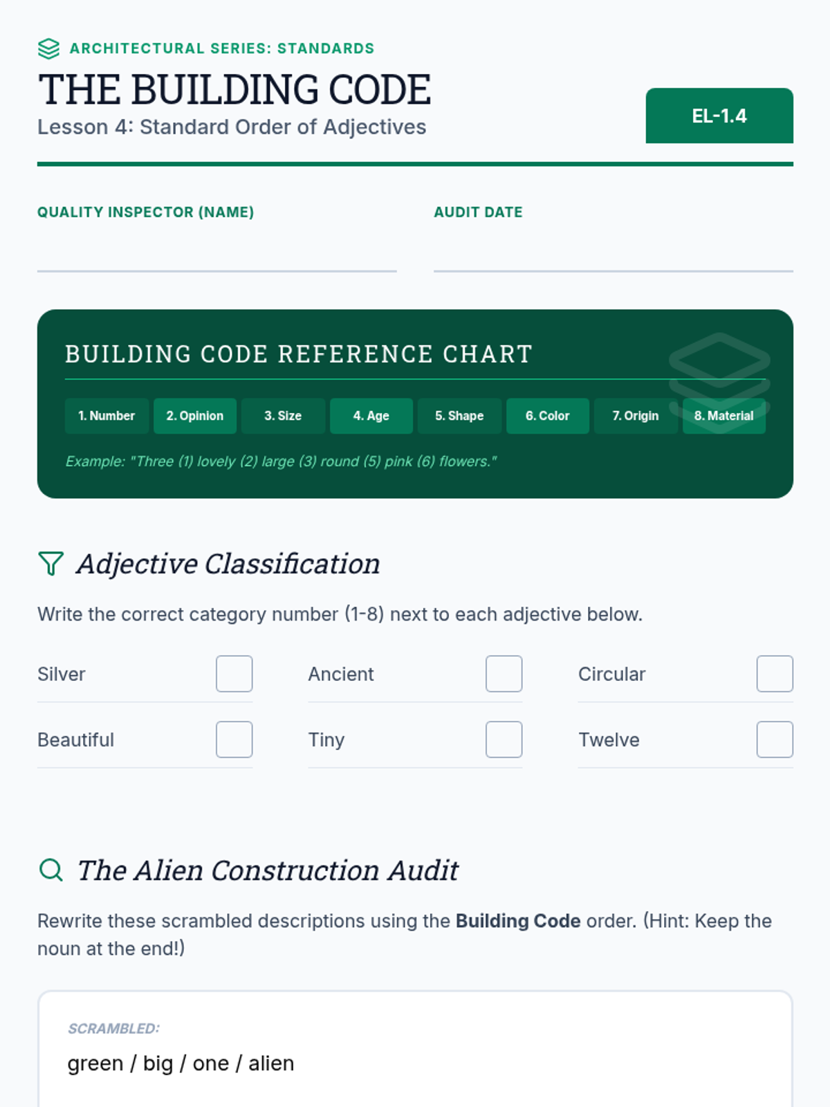 A comprehensive 4th-grade ELA unit focusing on noun classification and descriptive adjective usage to enhance student writing. Students move from basic identification to strategic application of precise nouns and ordered adjectives.