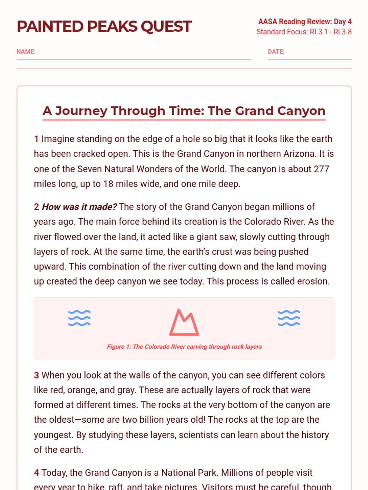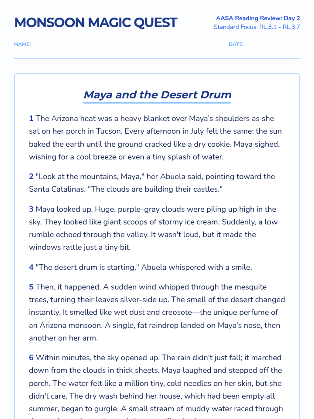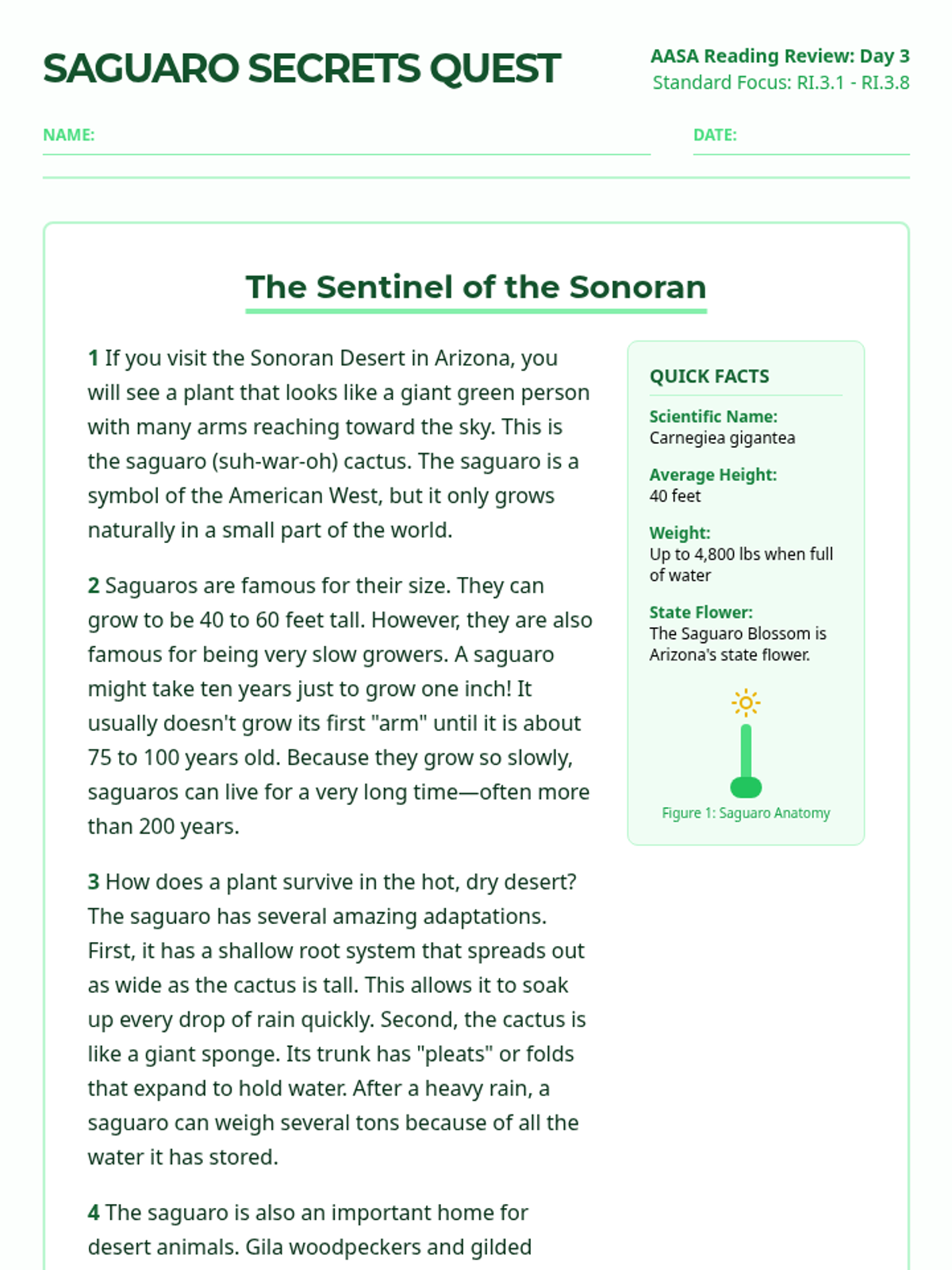 A 4-day AASA-style reading review sequence for 3rd grade, covering Literature and Informational standards with Arizona-themed passages and various question types.