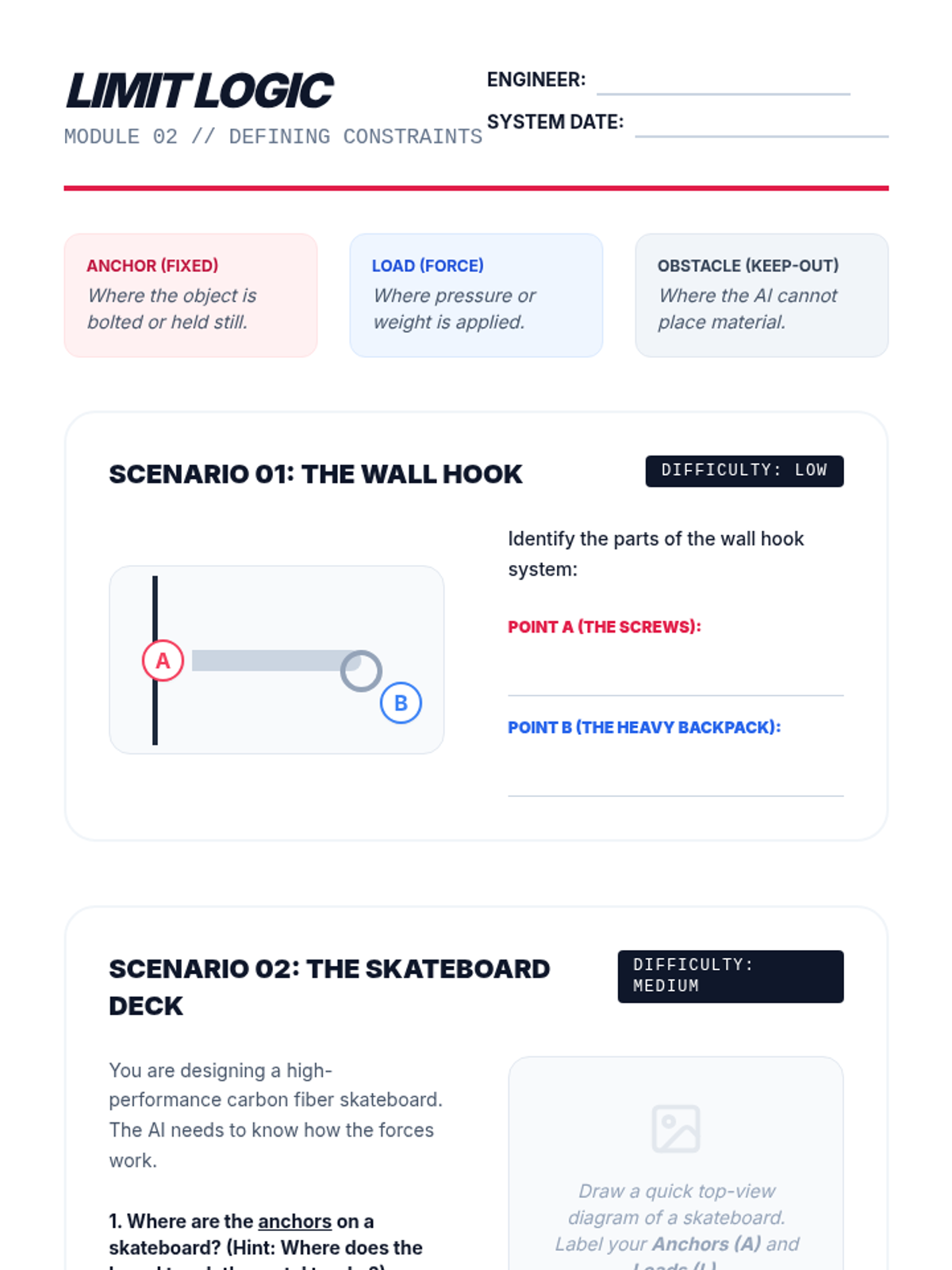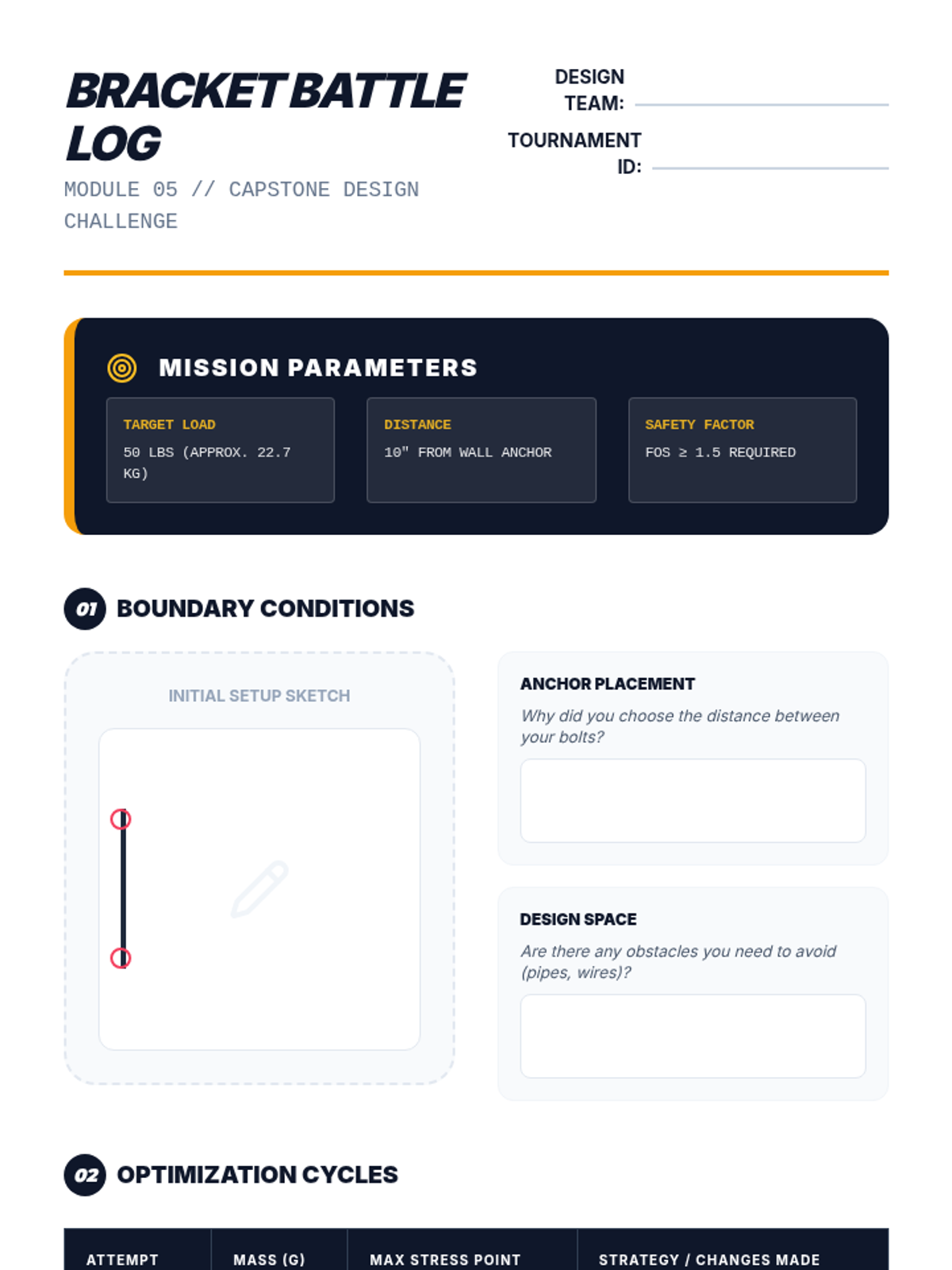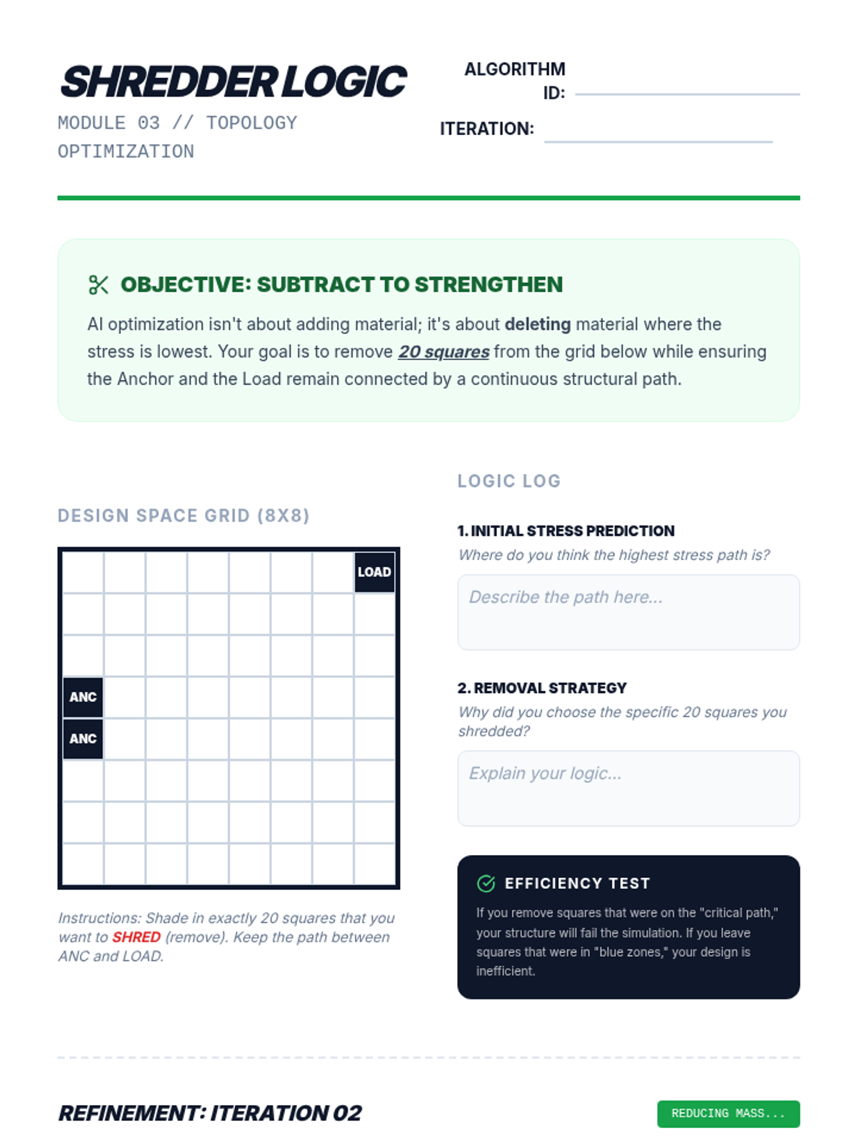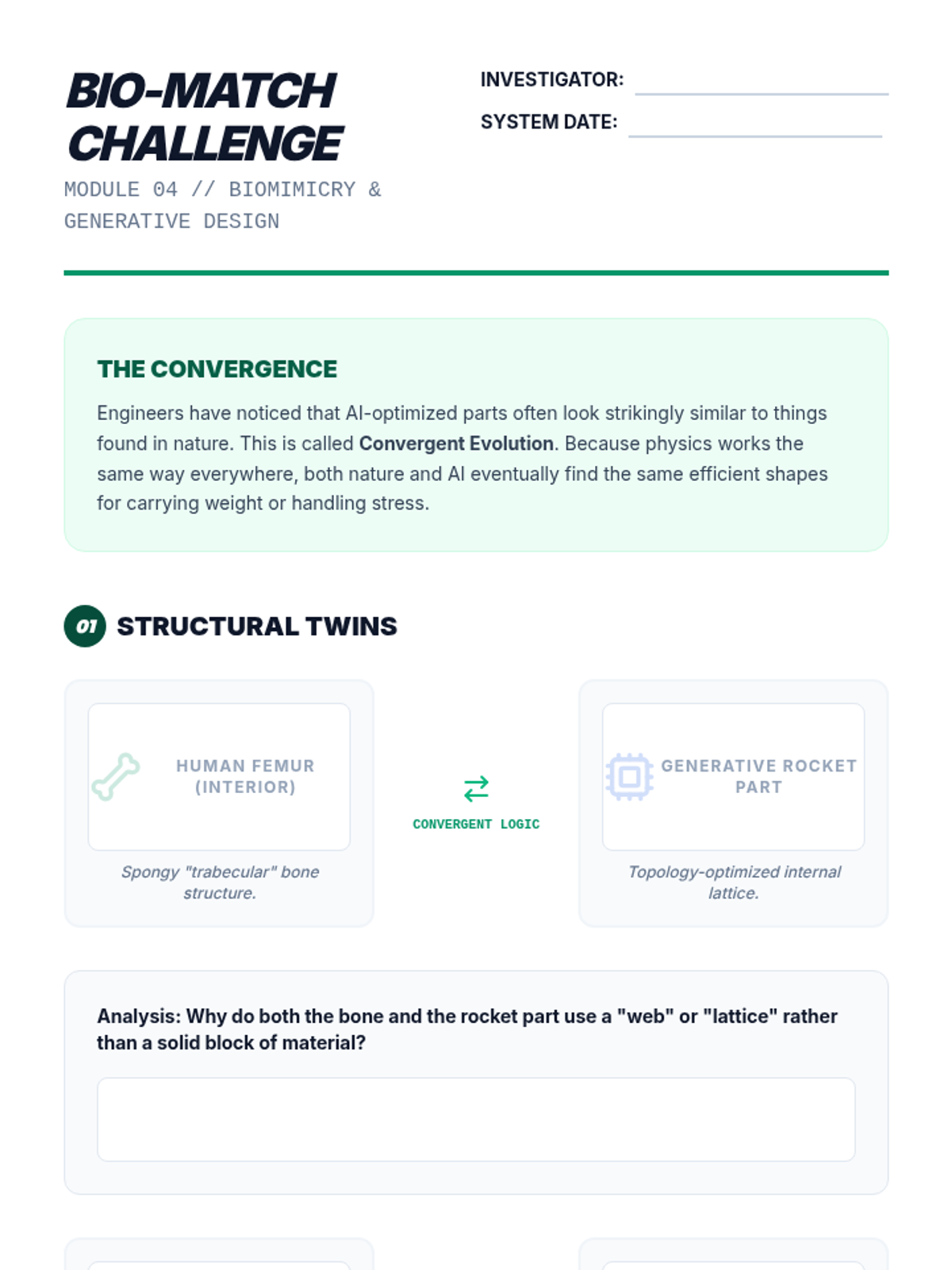 A 5-lesson sequence exploring how AI and simulation are revolutionizing engineering through generative design, topology optimization, and biomimicry. Students learn to use computers as co-designers to create lighter, stronger structures.