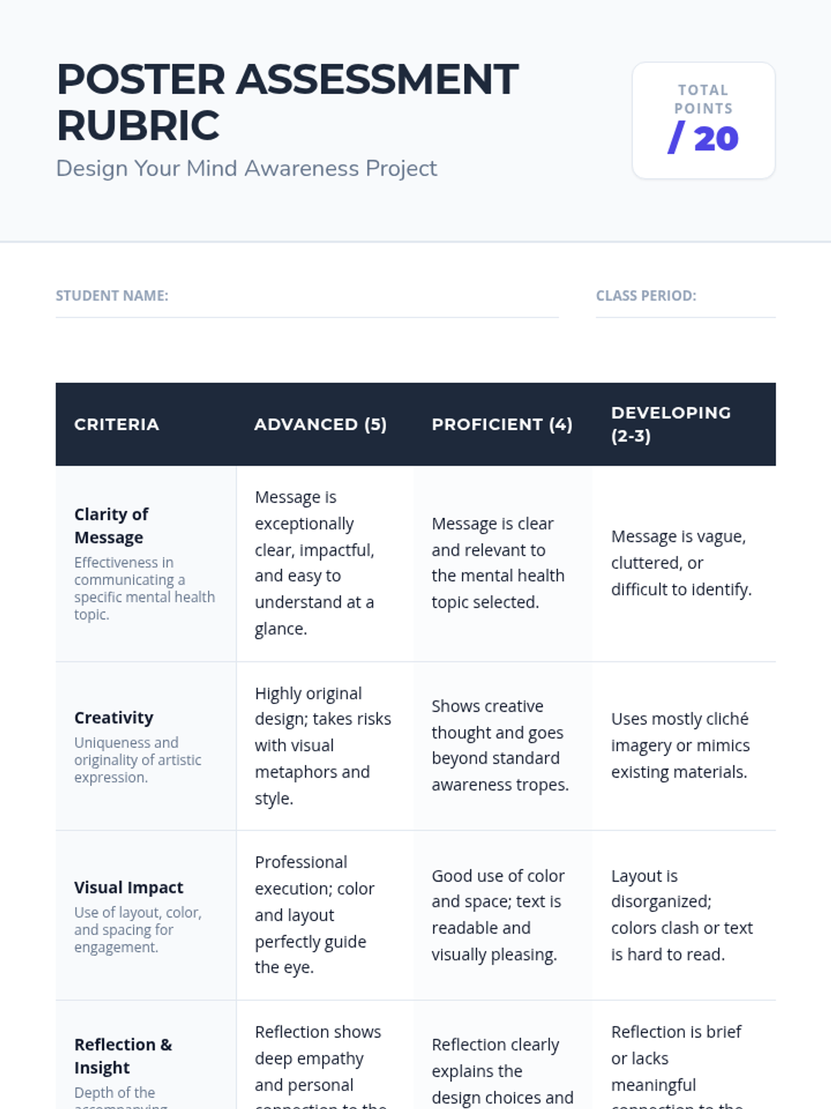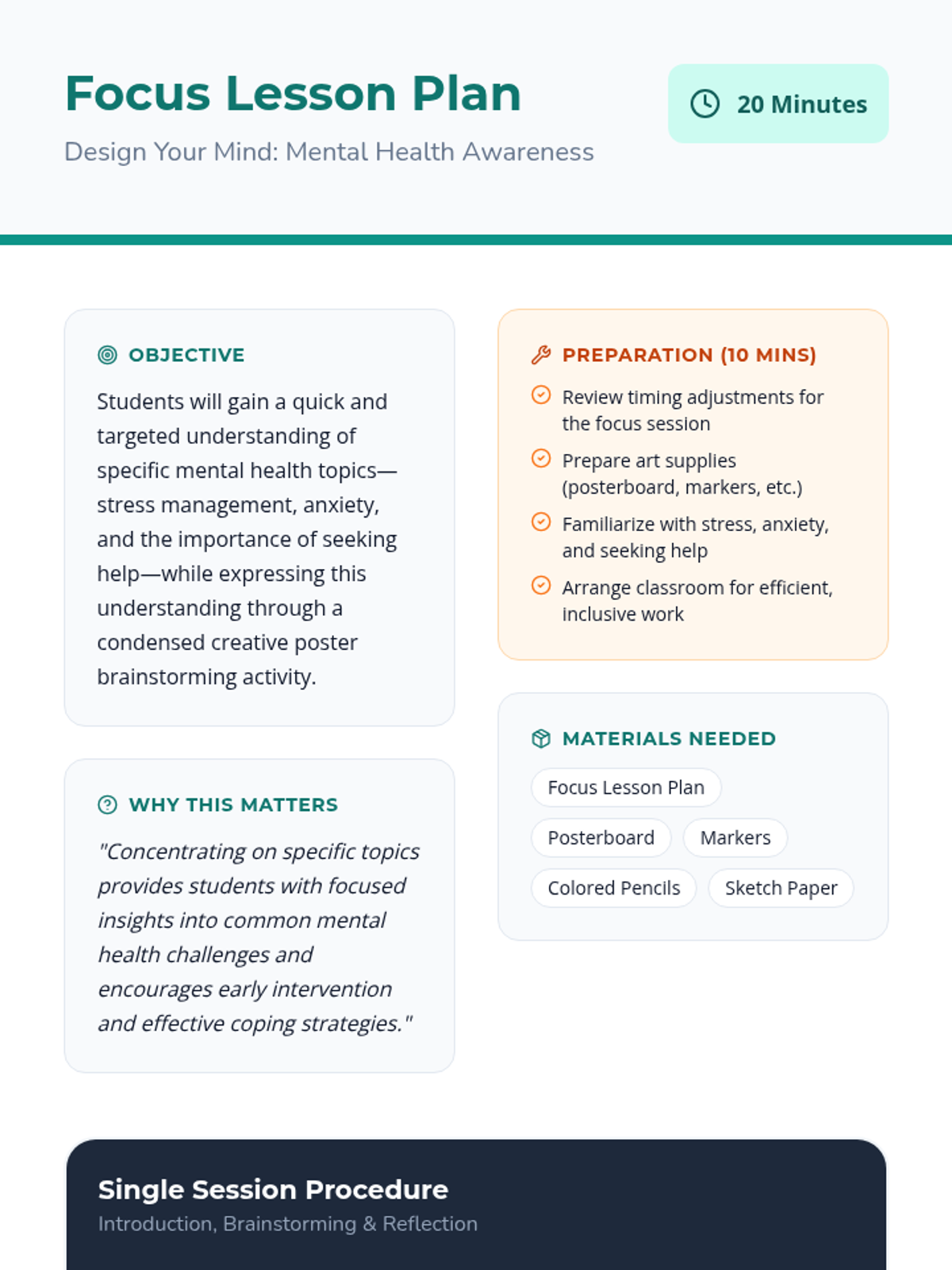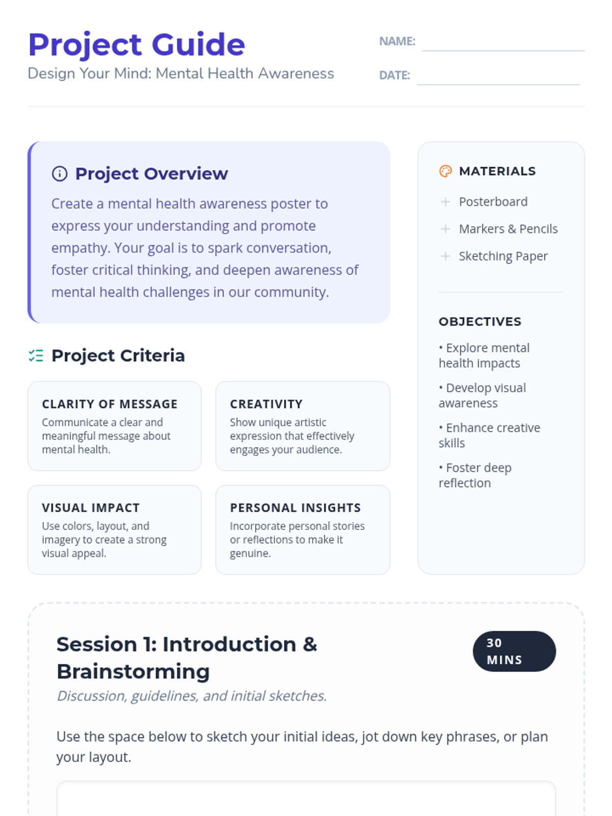 A two-session creative project sequence where students explore mental health topics, design awareness posters, and reflect on the impact of advocacy through art.