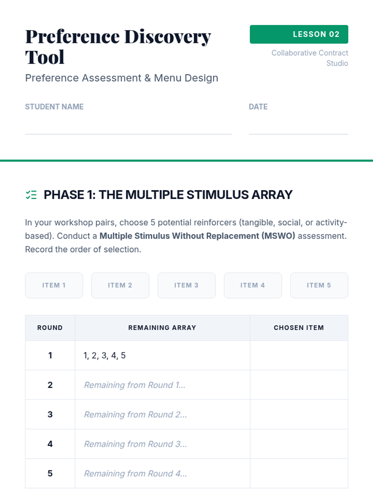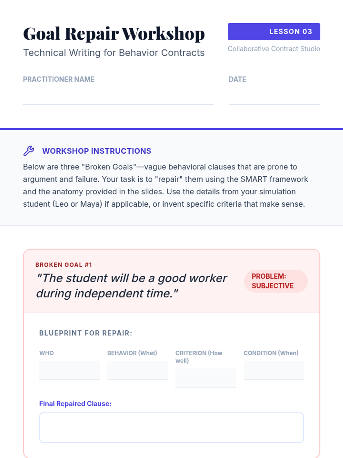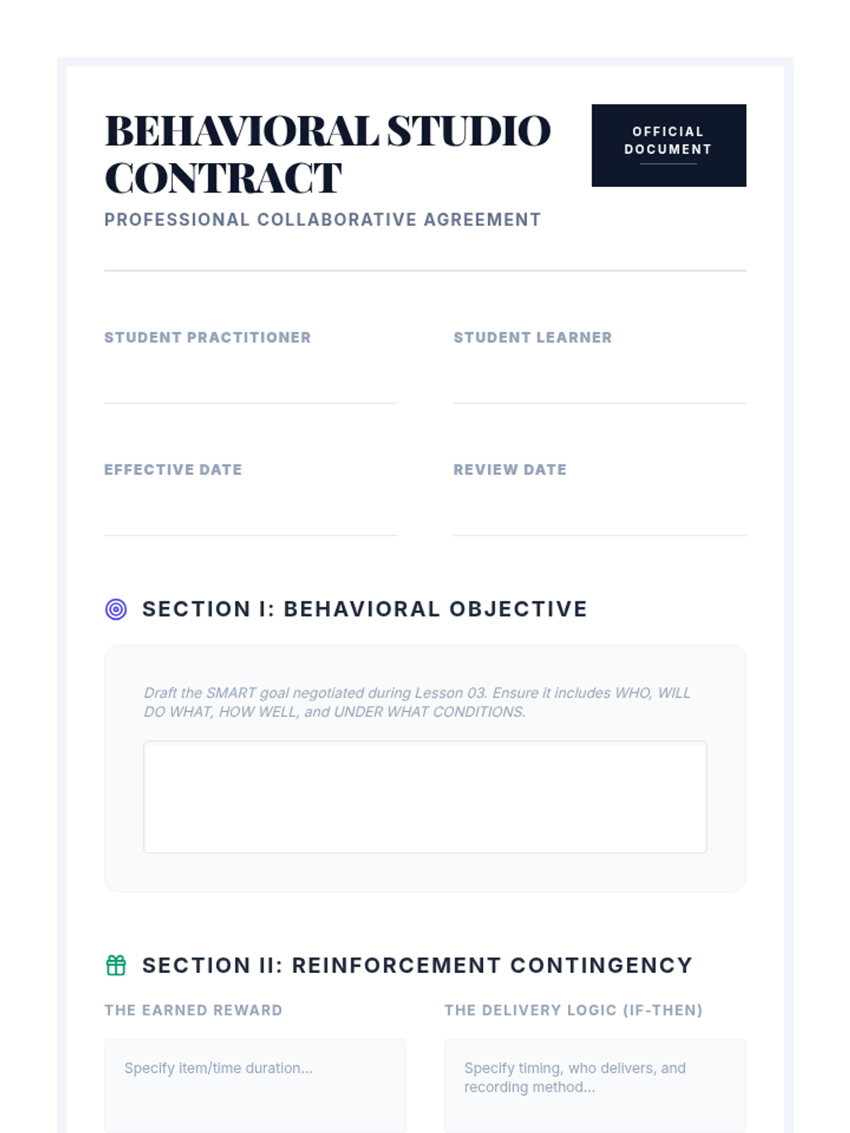 This sequence guides undergraduate students through the technical and interpersonal process of creating collaborative behavior contracts. Students move from initial negotiation and reinforcer selection to drafting SMART goals and defining precise reinforcement contingencies, culminating in a professional-grade document.