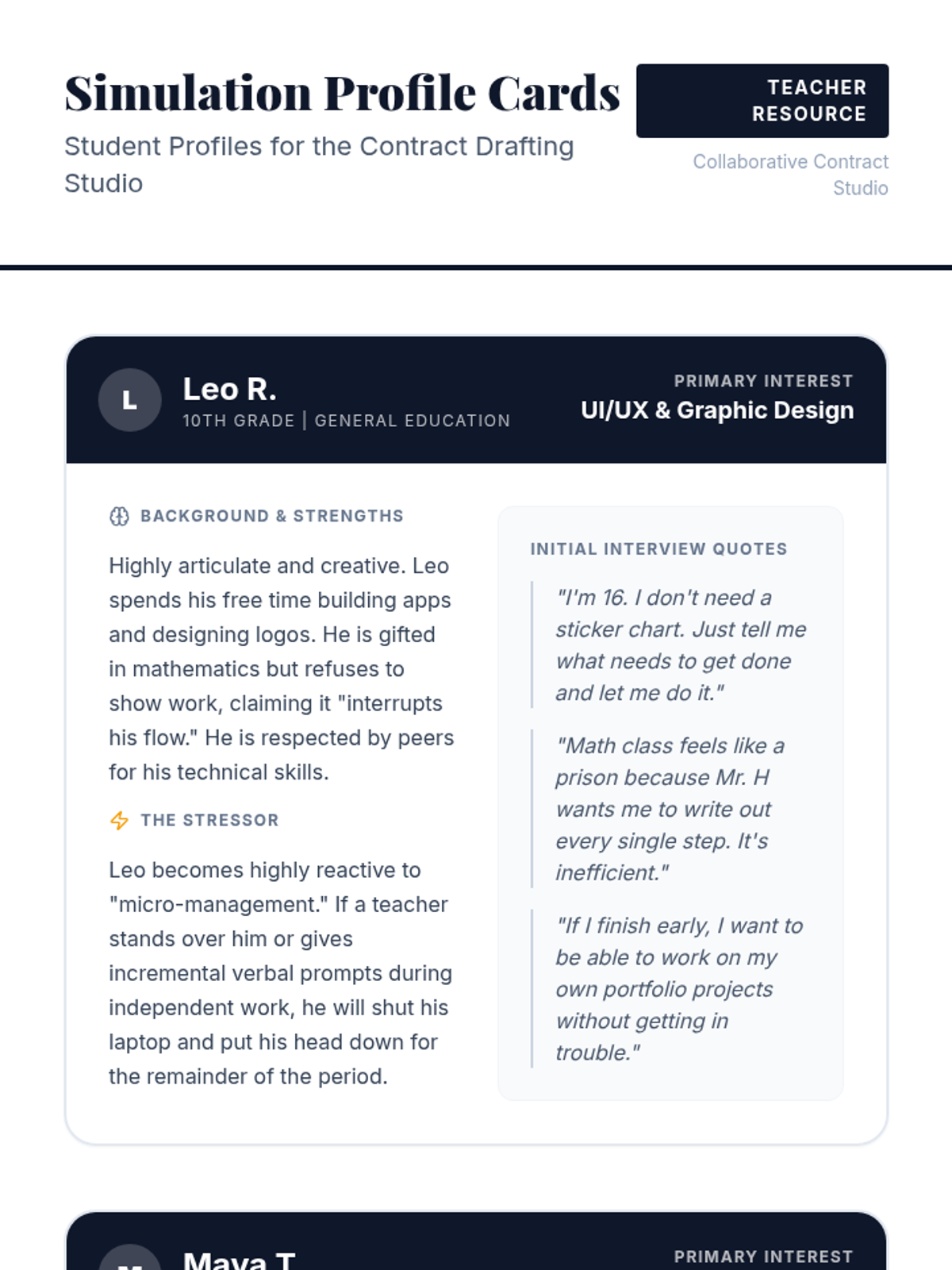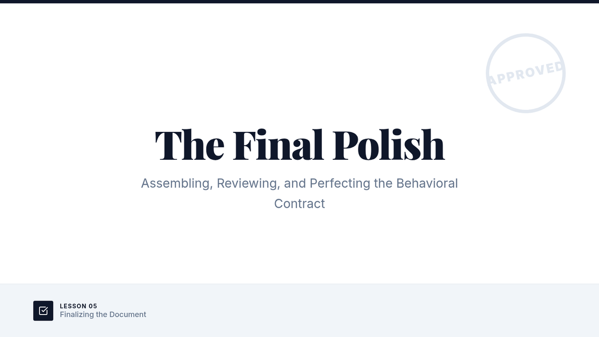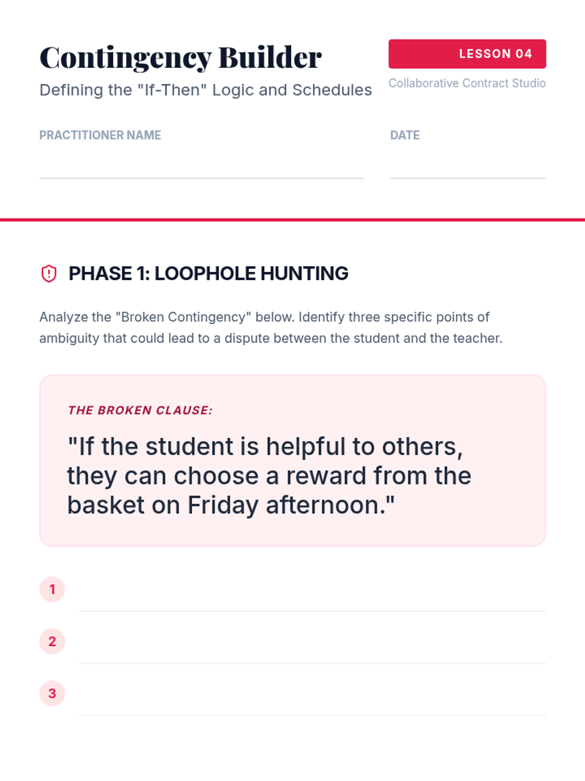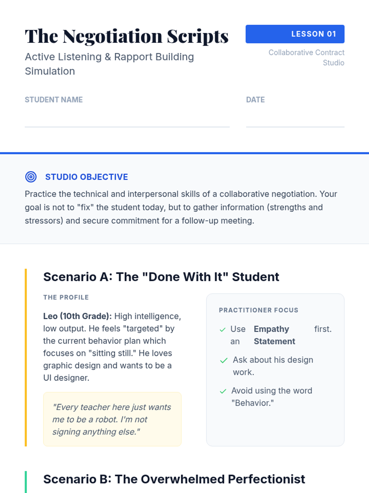 This sequence guides undergraduate students through the technical and interpersonal process of creating collaborative behavior contracts. Students move from initial negotiation and reinforcer selection to drafting SMART goals and defining precise reinforcement contingencies, culminating in a professional-grade document.