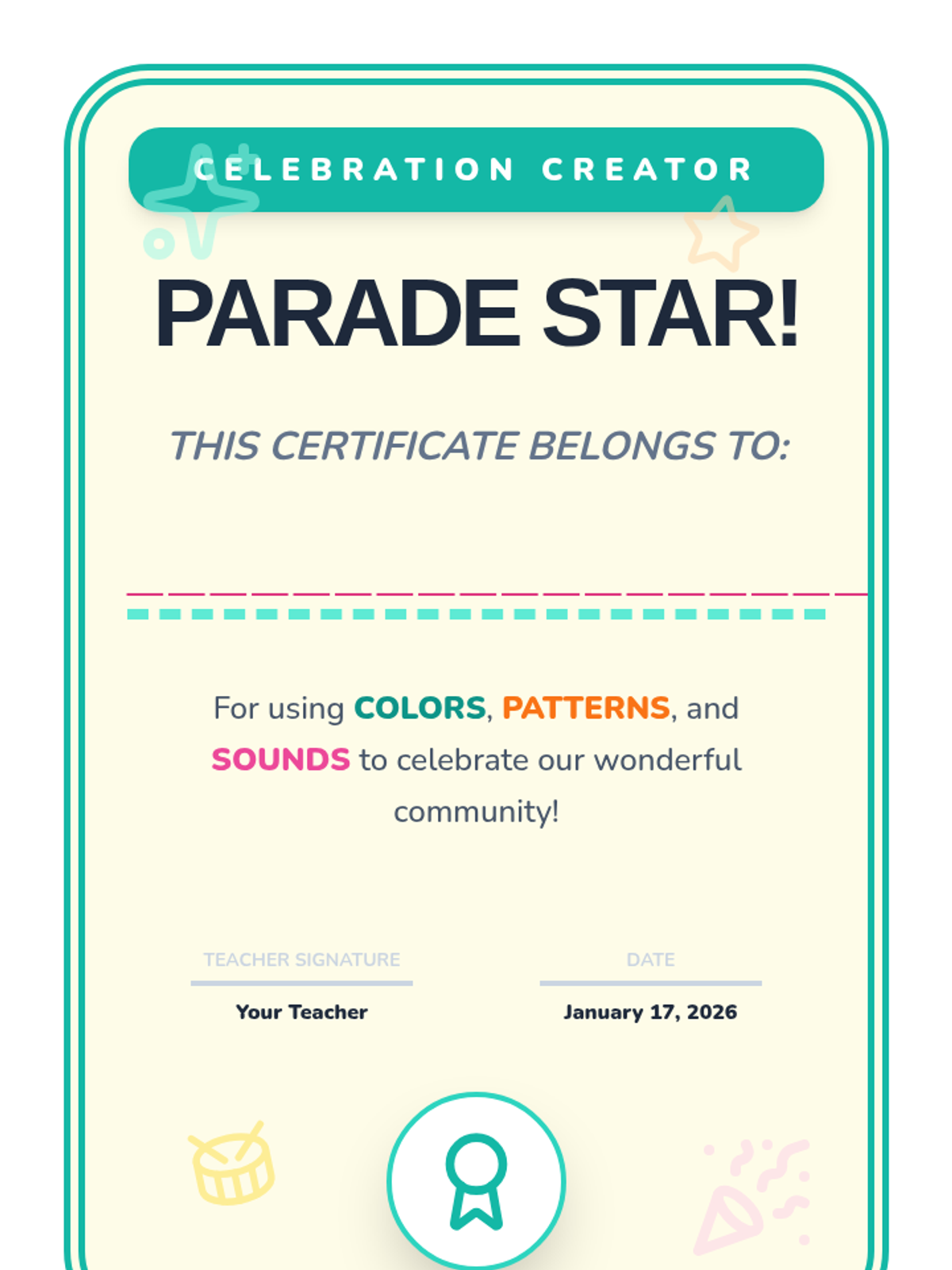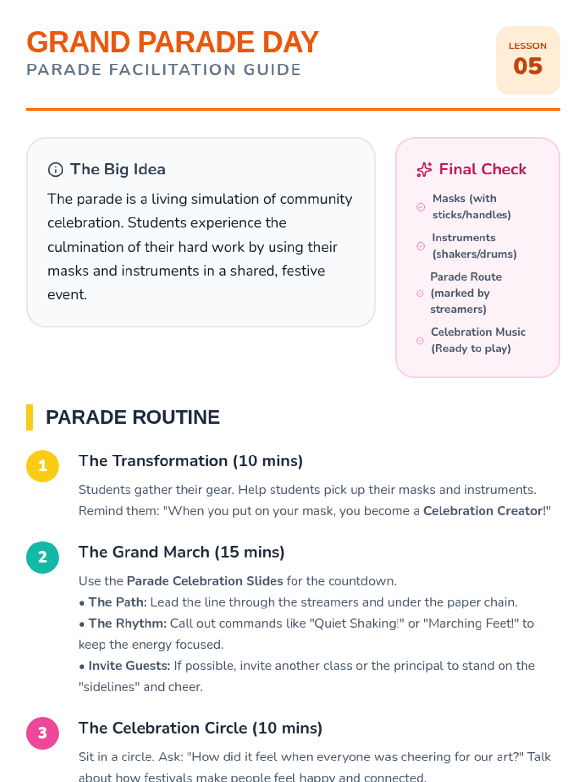 An immersive exploration of how communities use art, music, and performance to celebrate together, culminating in a festive classroom parade. students learn about cultural festivals, create their own masks and instruments, and transform their learning space.