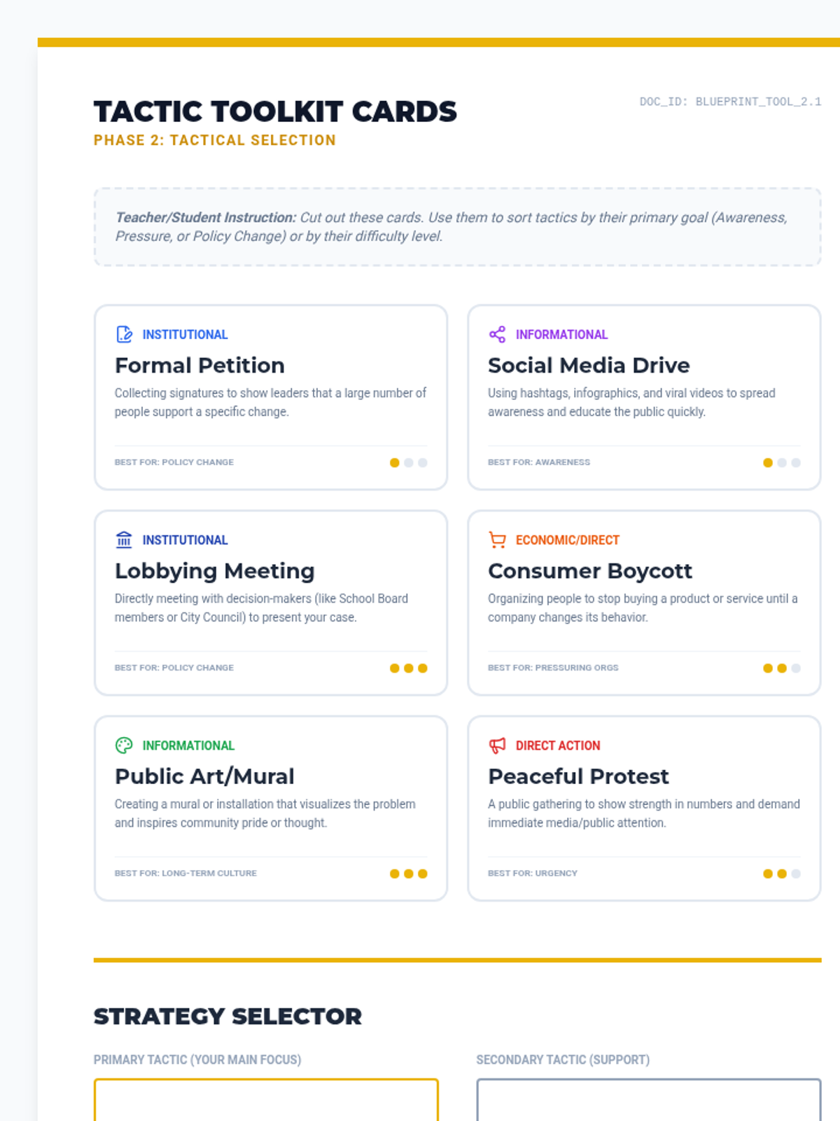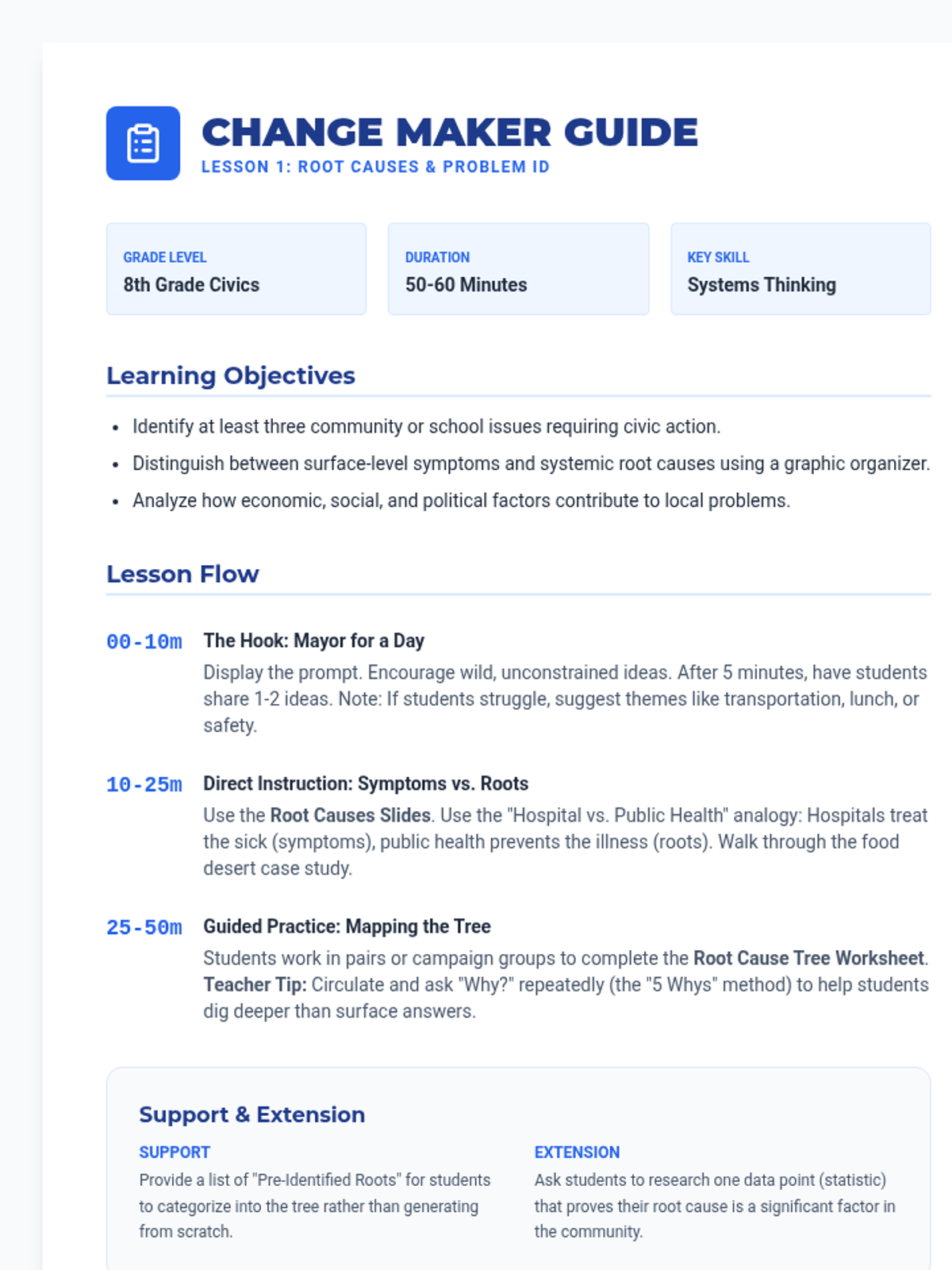 A project-based unit where 8th-grade students transition from analyzing social movements to designing their own advocacy campaigns. Students identify community issues, analyze root causes, select strategic tactics, build coalitions, and pitch their action plans.