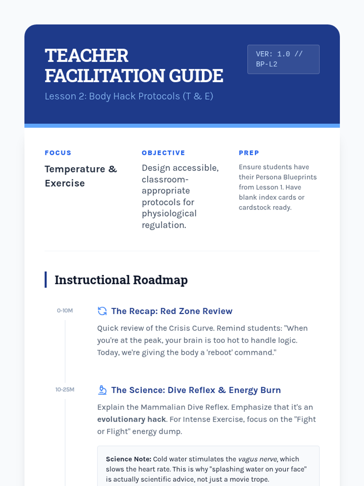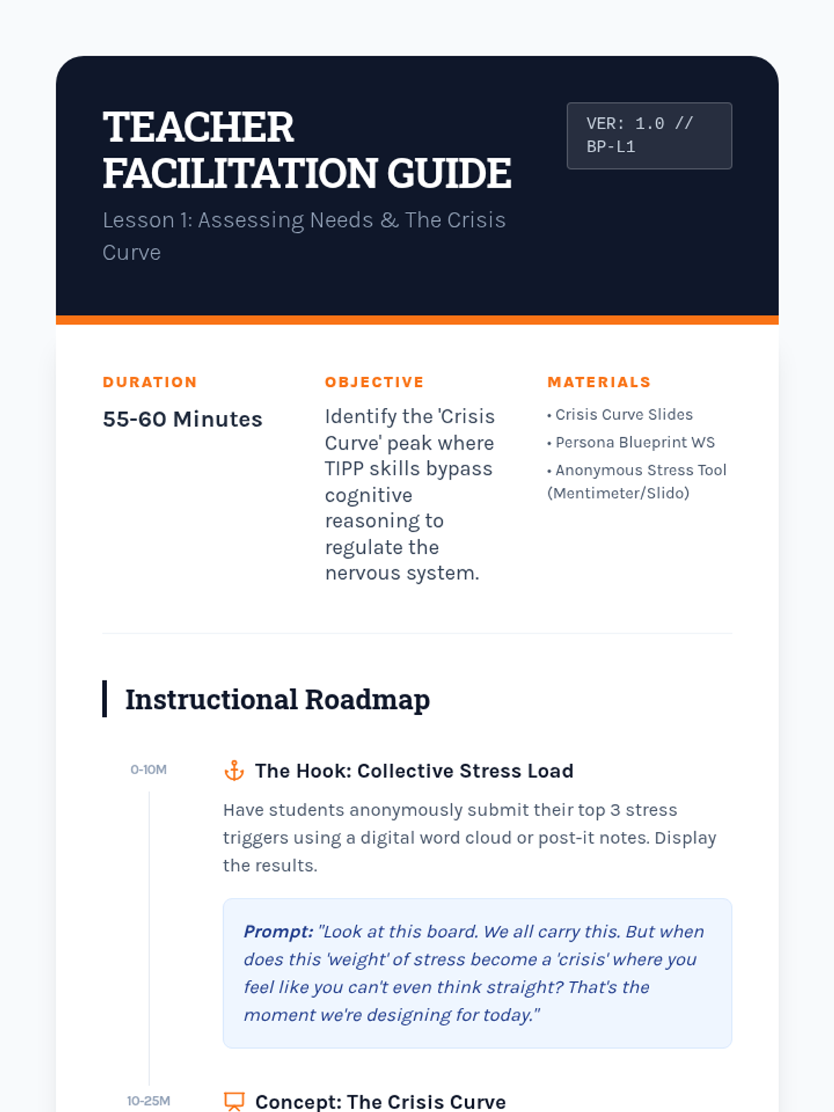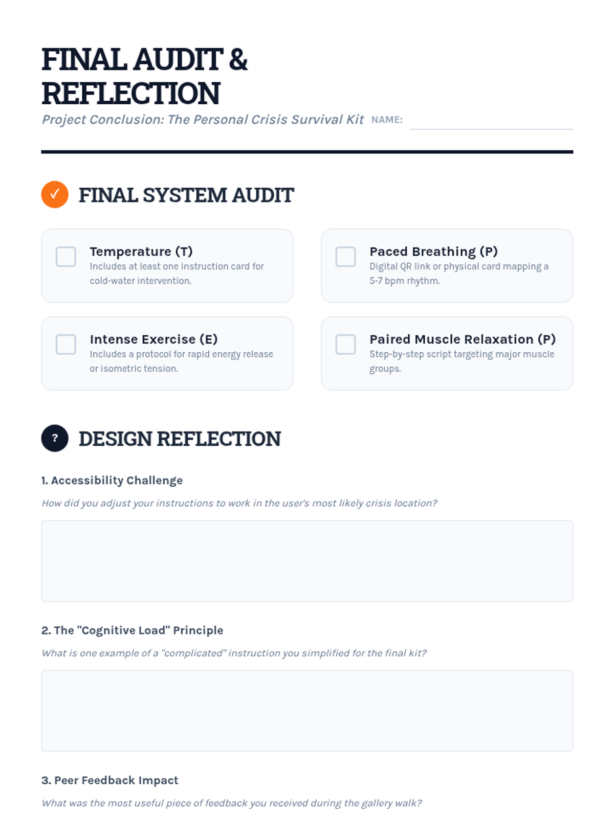 A project-based sequence where 10th-grade students design a personal 'Crisis Survival Kit' while mastering TIPP skills (Temperature, Intense Exercise, Paced Breathing, and Paired Muscle Relaxation). Students act as instructional designers, translating psychological concepts into practical, accessible resources for themselves and their peers.
