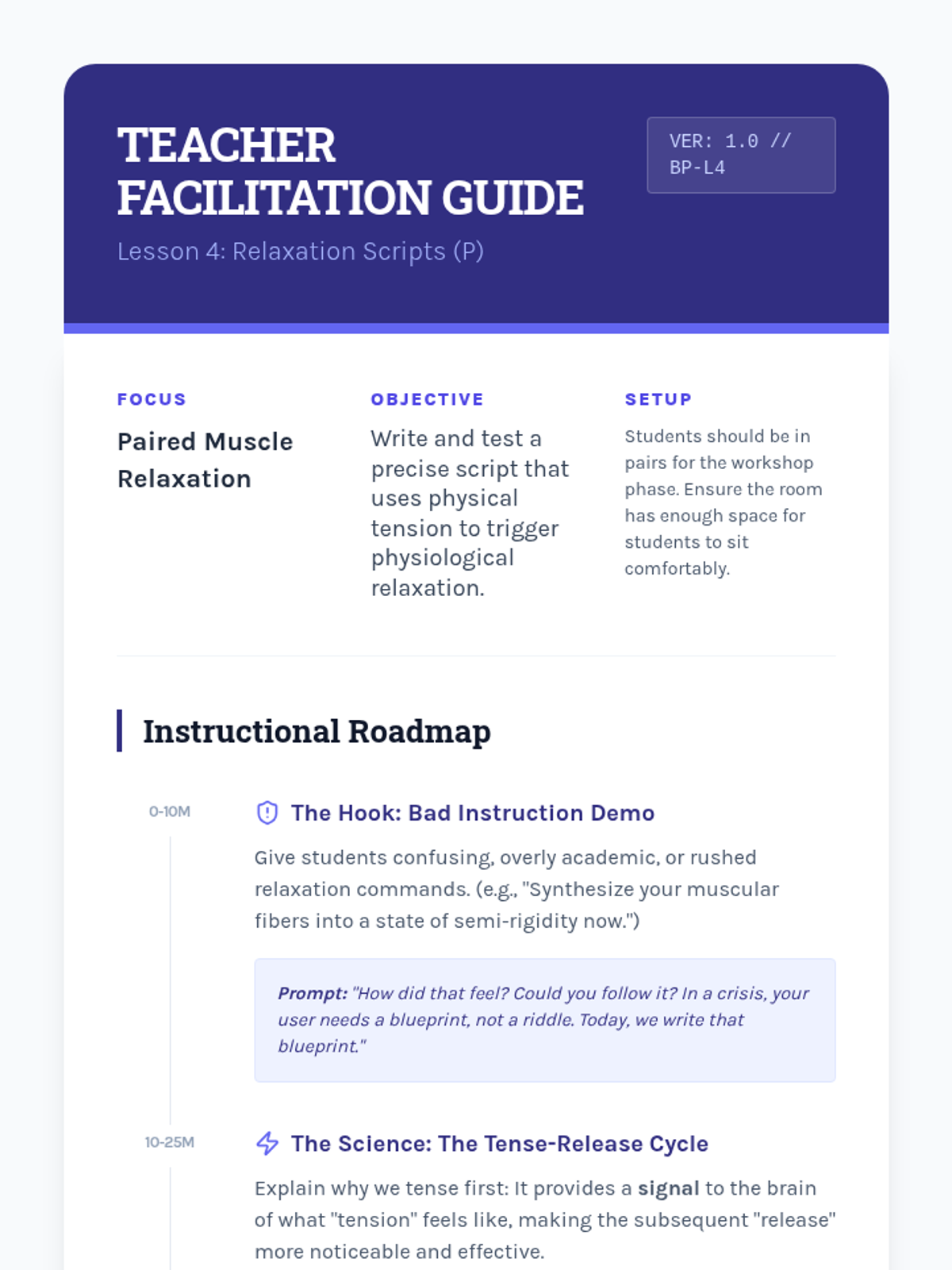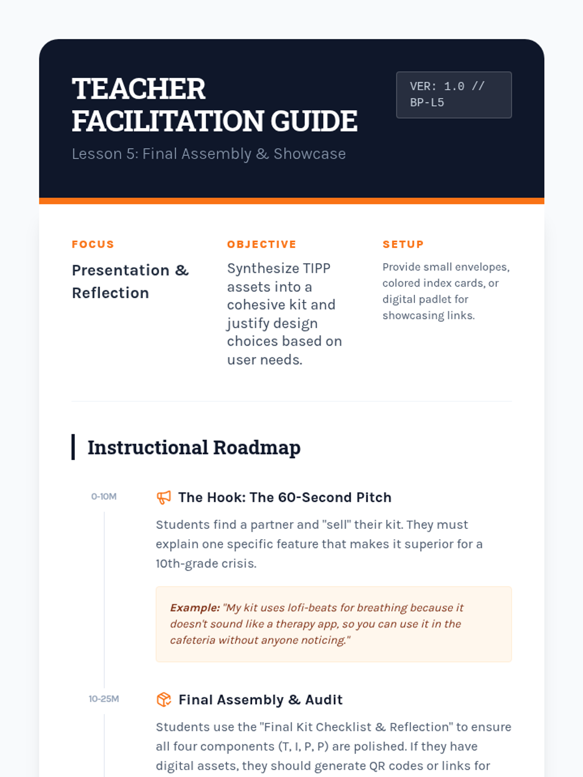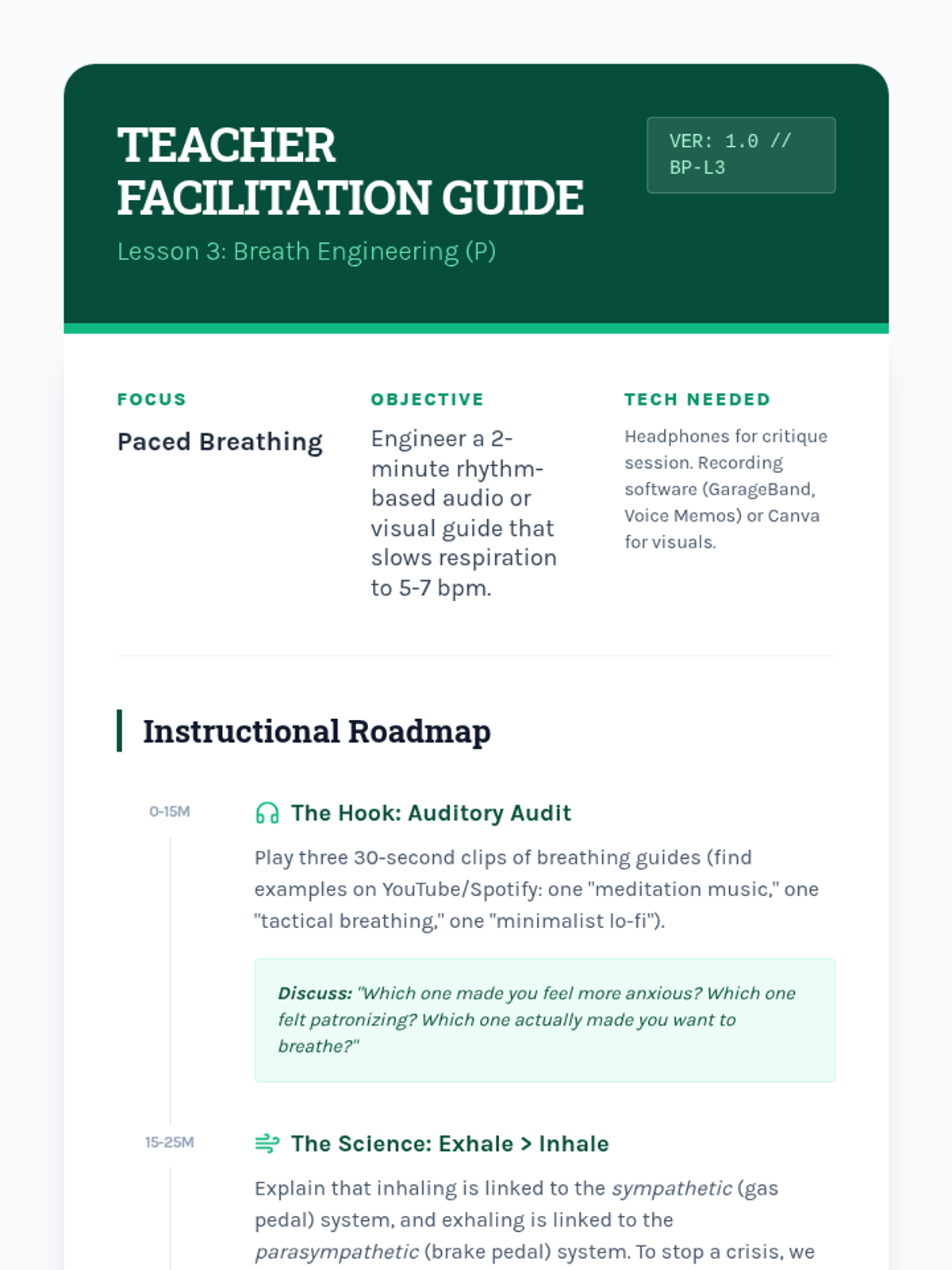 A project-based sequence where 10th-grade students design a personal 'Crisis Survival Kit' while mastering TIPP skills (Temperature, Intense Exercise, Paced Breathing, and Paired Muscle Relaxation). Students act as instructional designers, translating psychological concepts into practical, accessible resources for themselves and their peers.