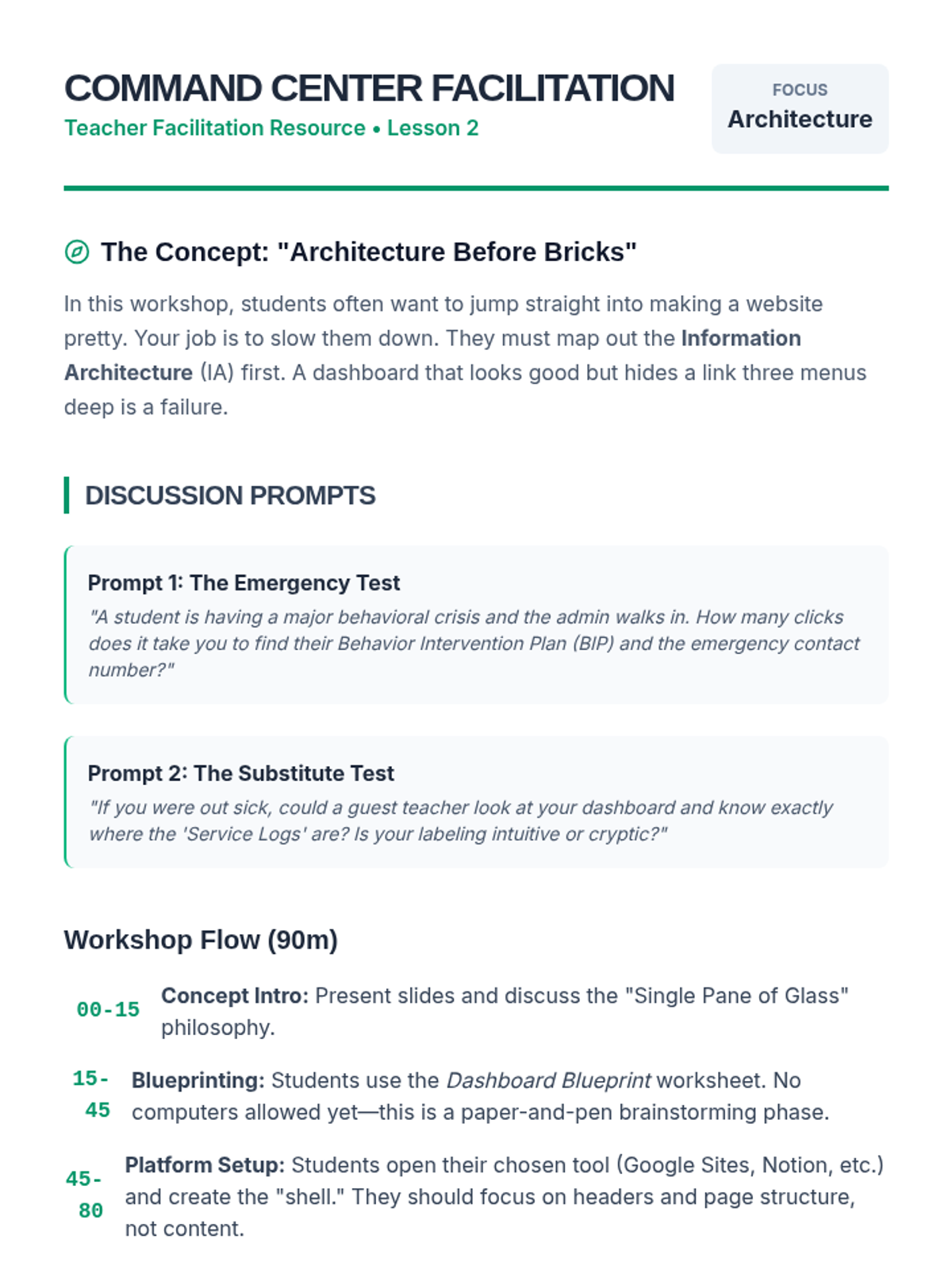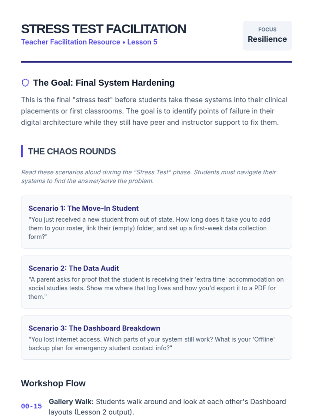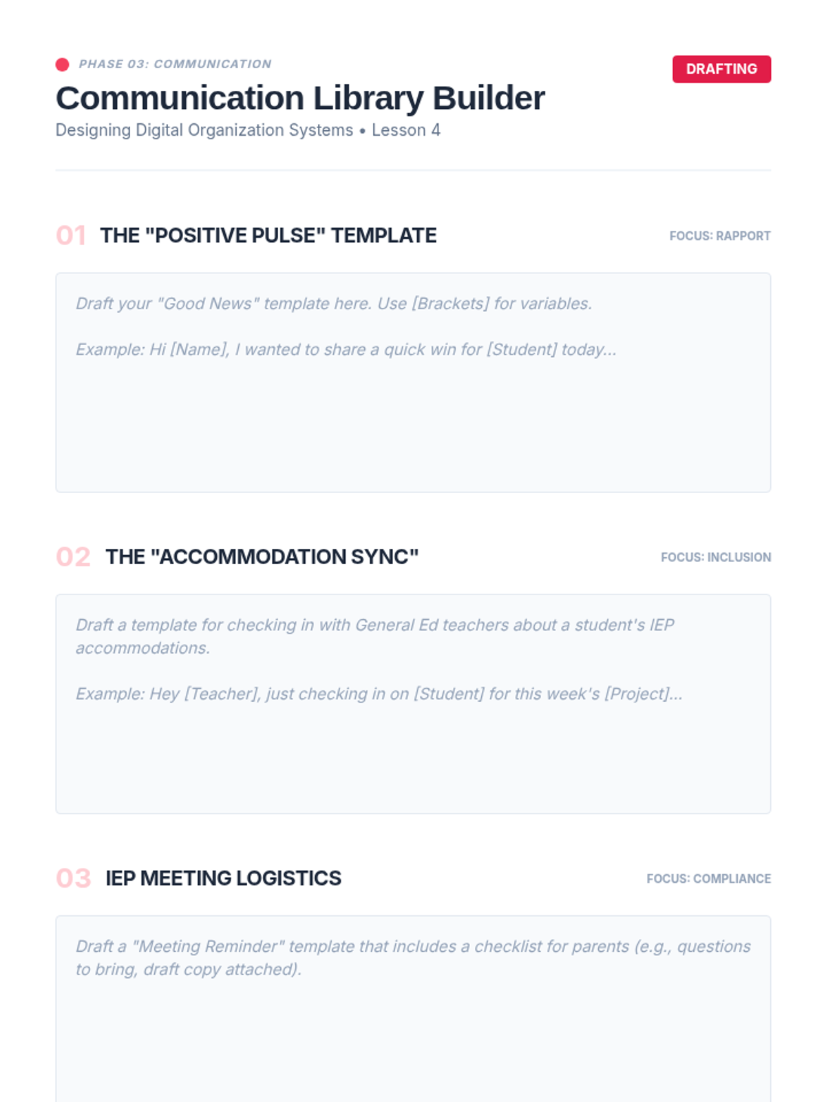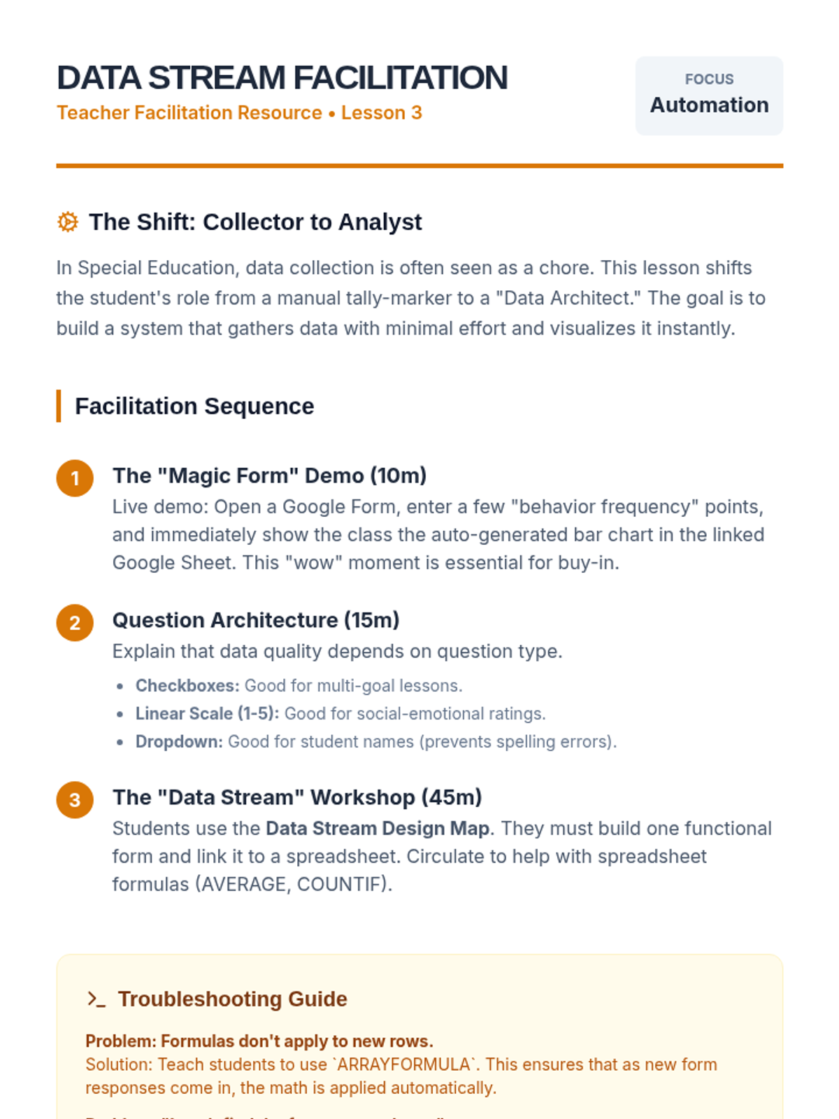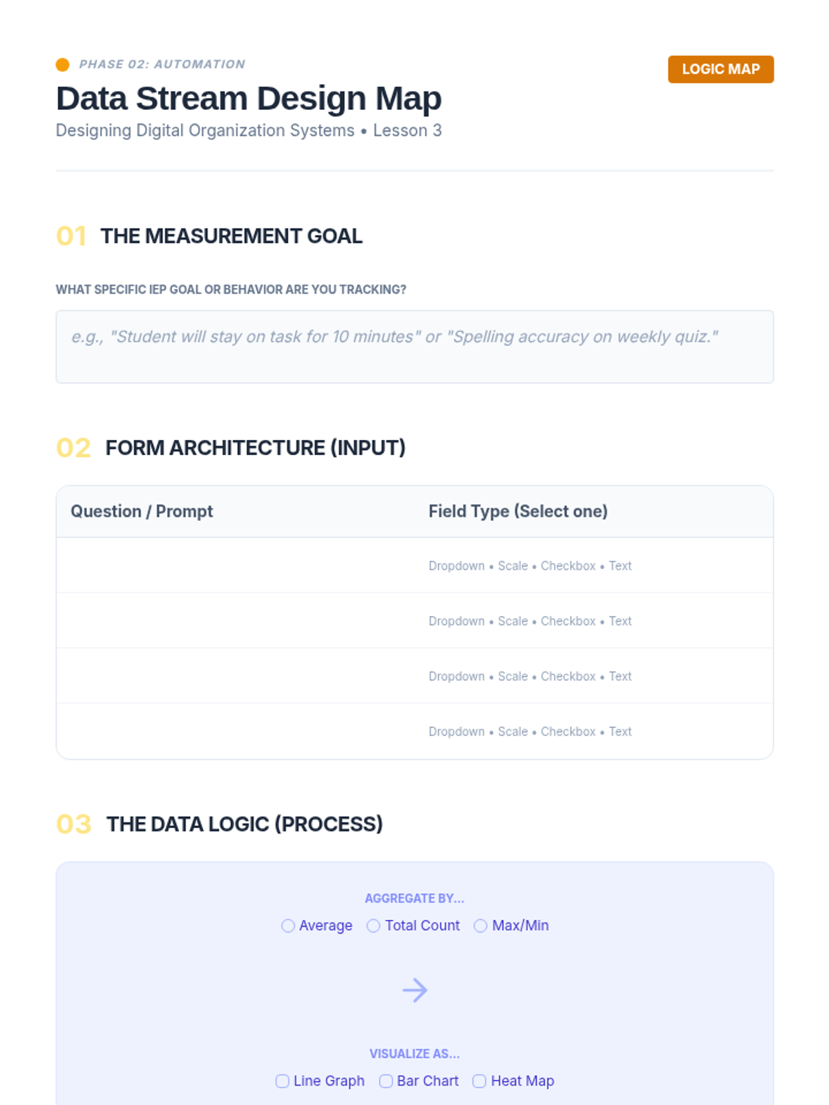A project-based sequence for preservice special education teachers to design a digital organizational ecosystem. Students learn to evaluate tools, build central dashboards, automate data collection, and streamline communications to reduce administrative burden.