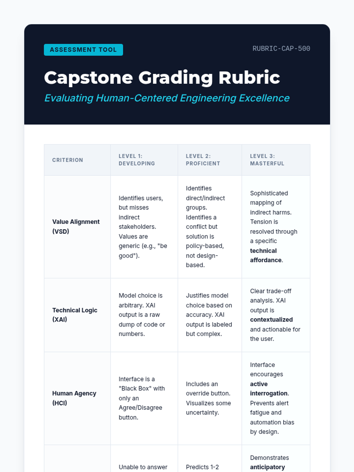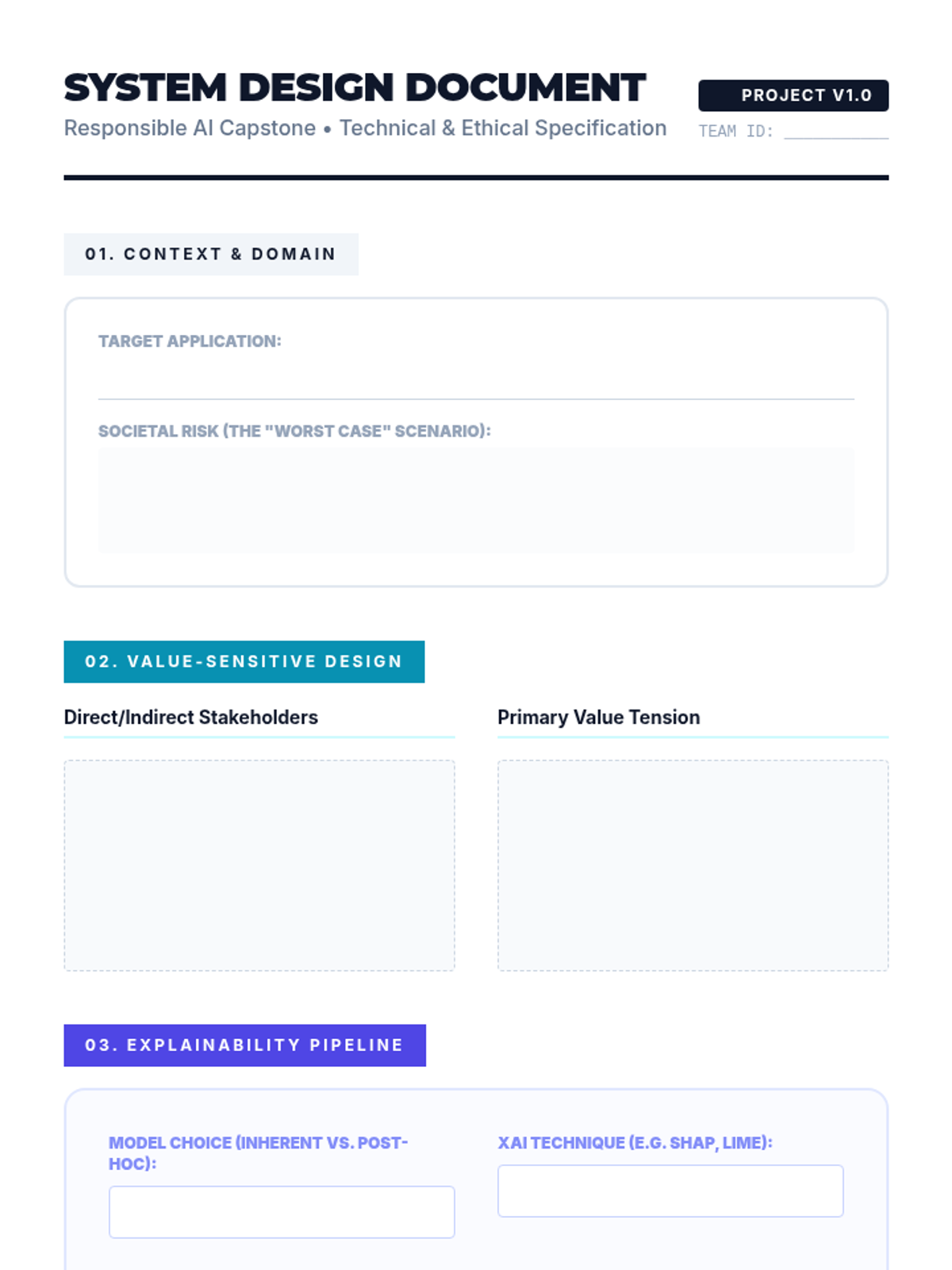 A graduate-level engineering sequence focused on the intersection of technical AI implementation and ethical design. Students explore Value-Sensitive Design, technical Explainable AI (XAI) methods like SHAP and LIME, and the human factors of AI agency and transparency.