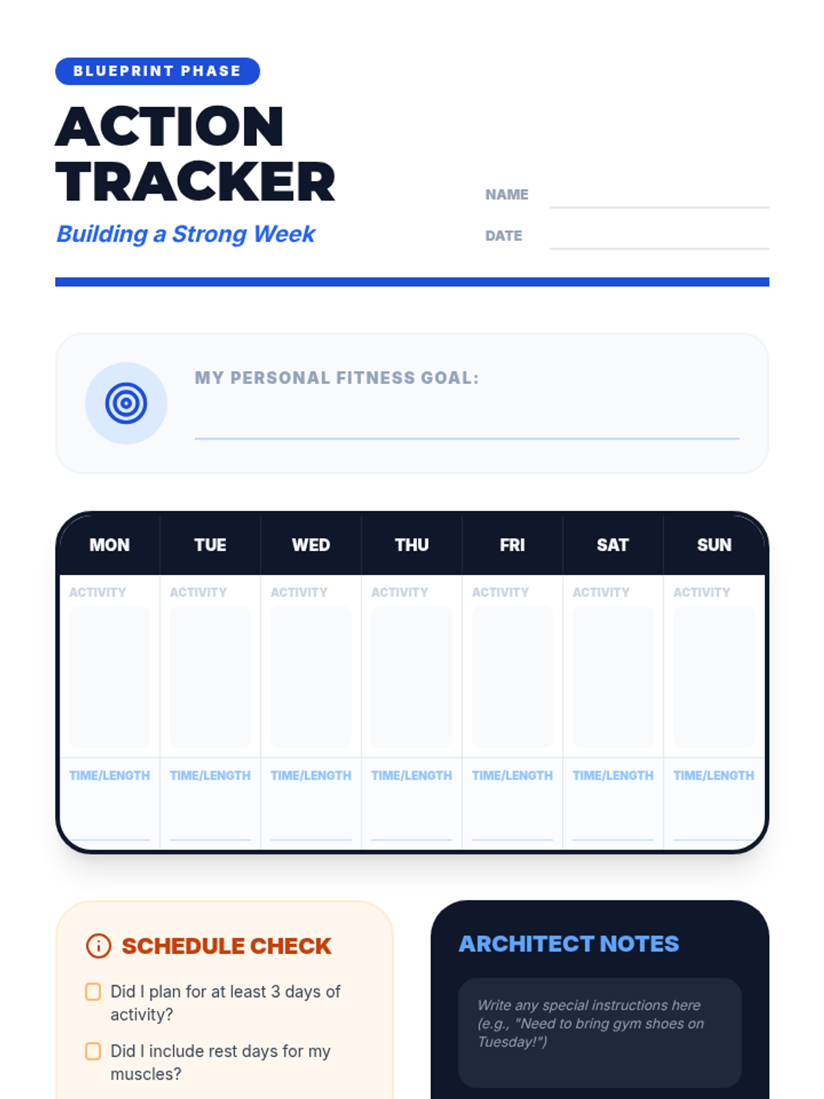 A project-based unit where 3rd-grade students design personal fitness action plans by matching activities to goals, creating custom fitness 'menus', and scheduling their routines.