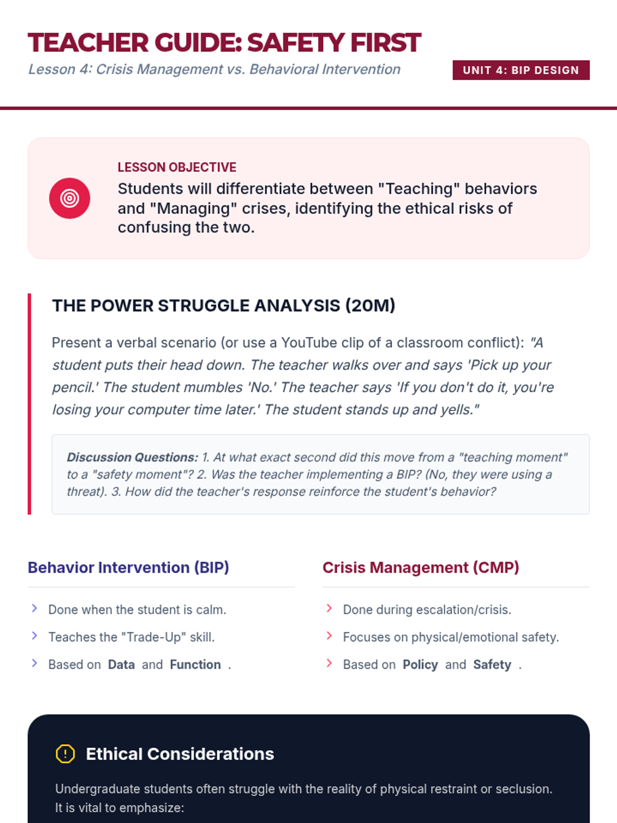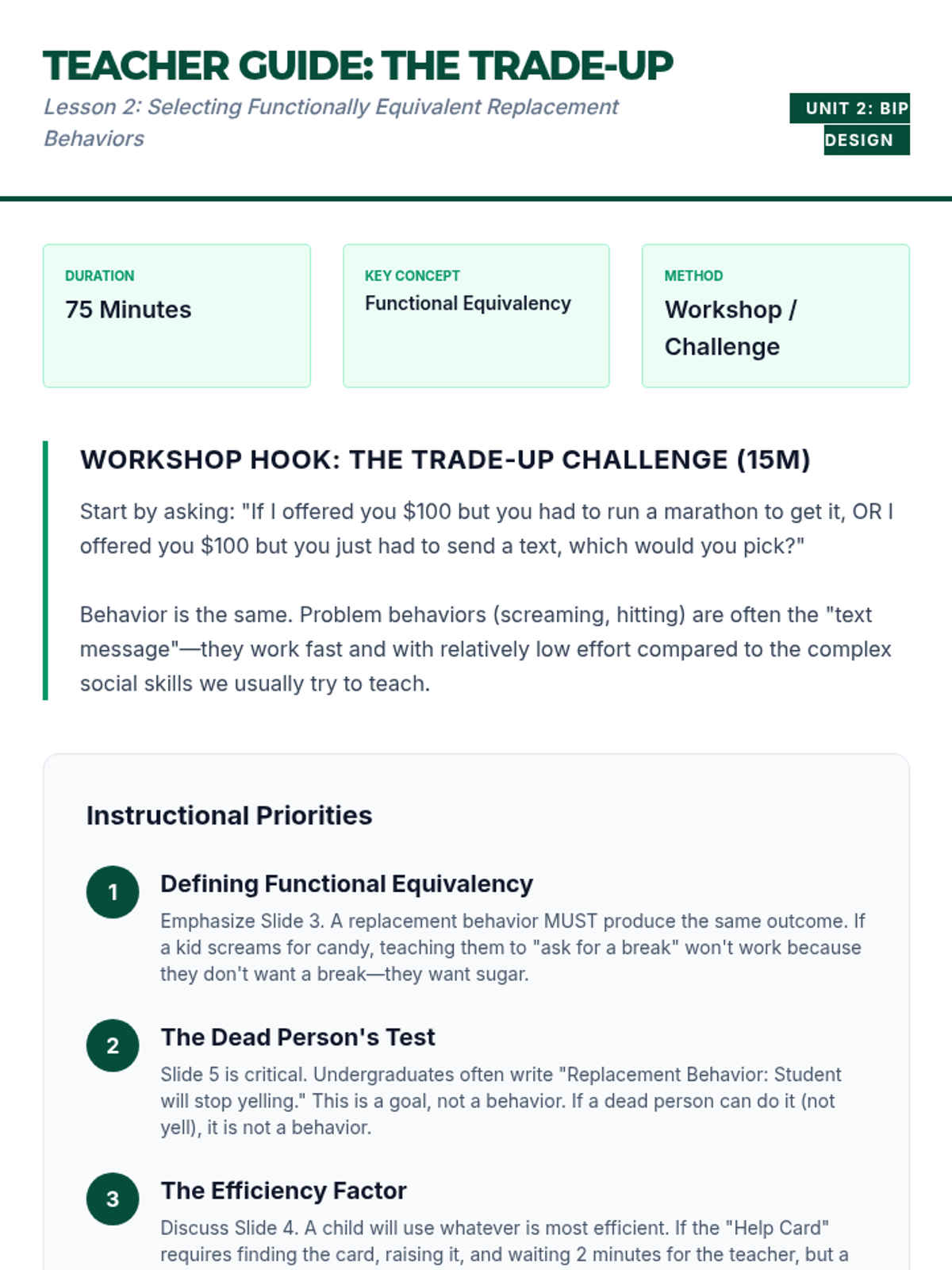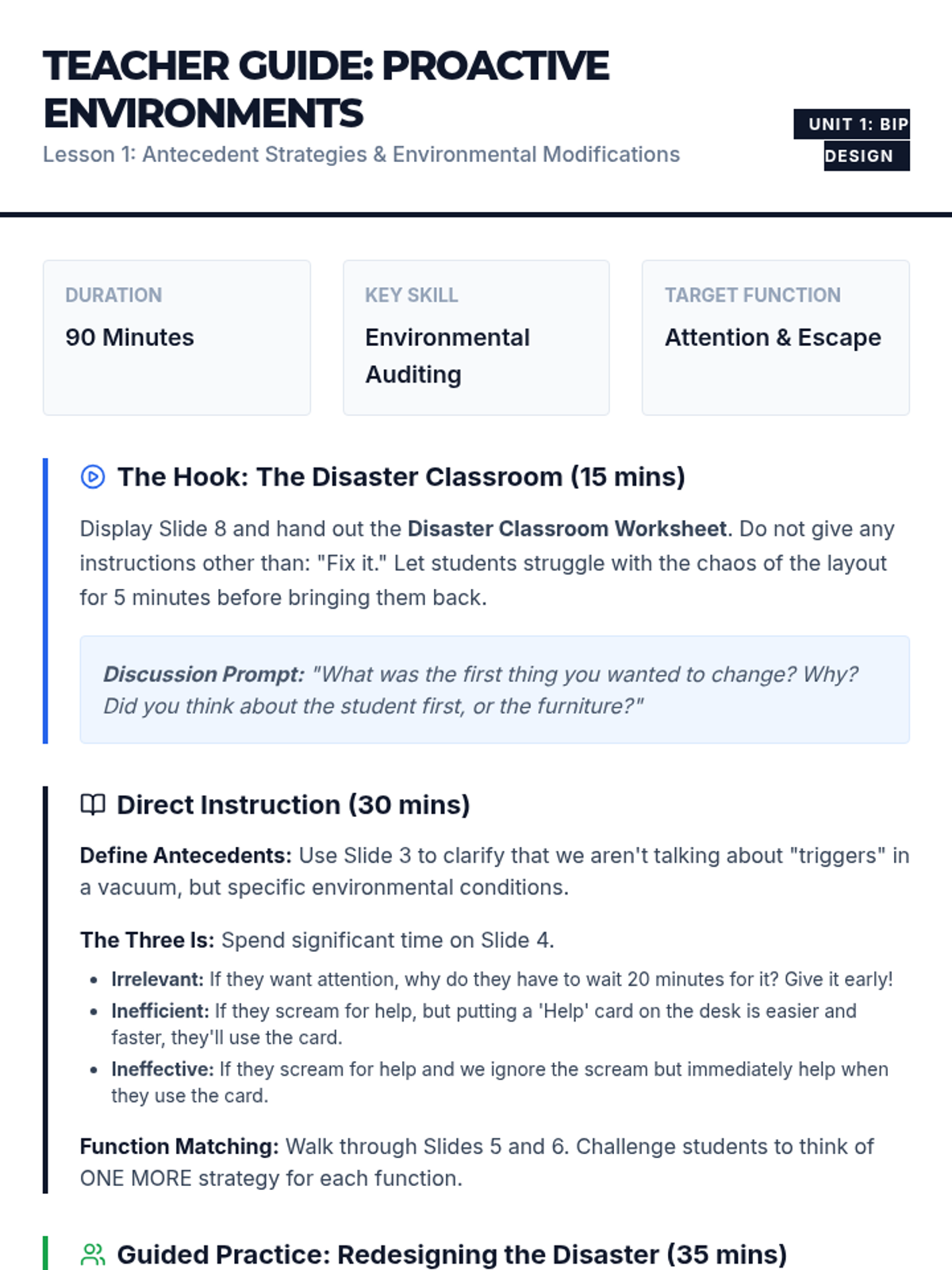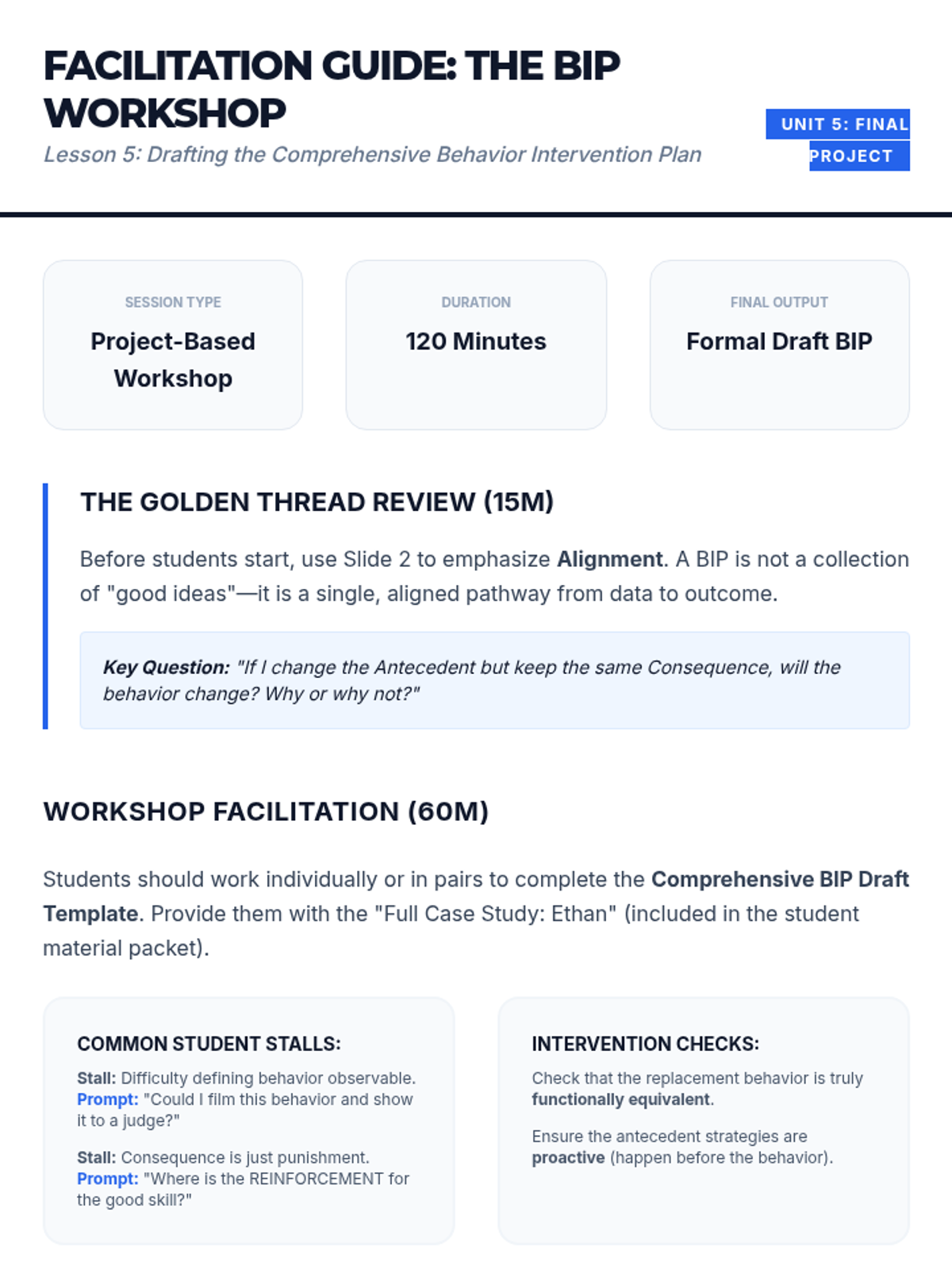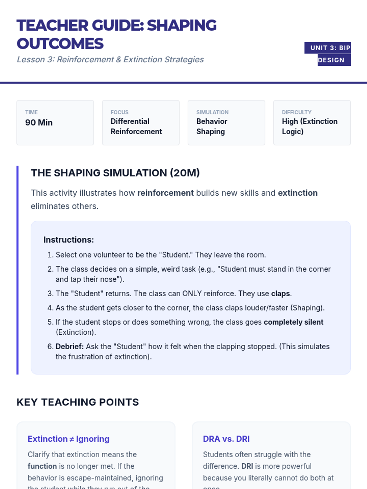 A comprehensive guide for undergraduate students to design Behavior Intervention Plans (BIPs). Students progress from environmental modifications and antecedent strategies to identifying replacement behaviors, consequence management, and final BIP construction based on functional behavior assessment data.