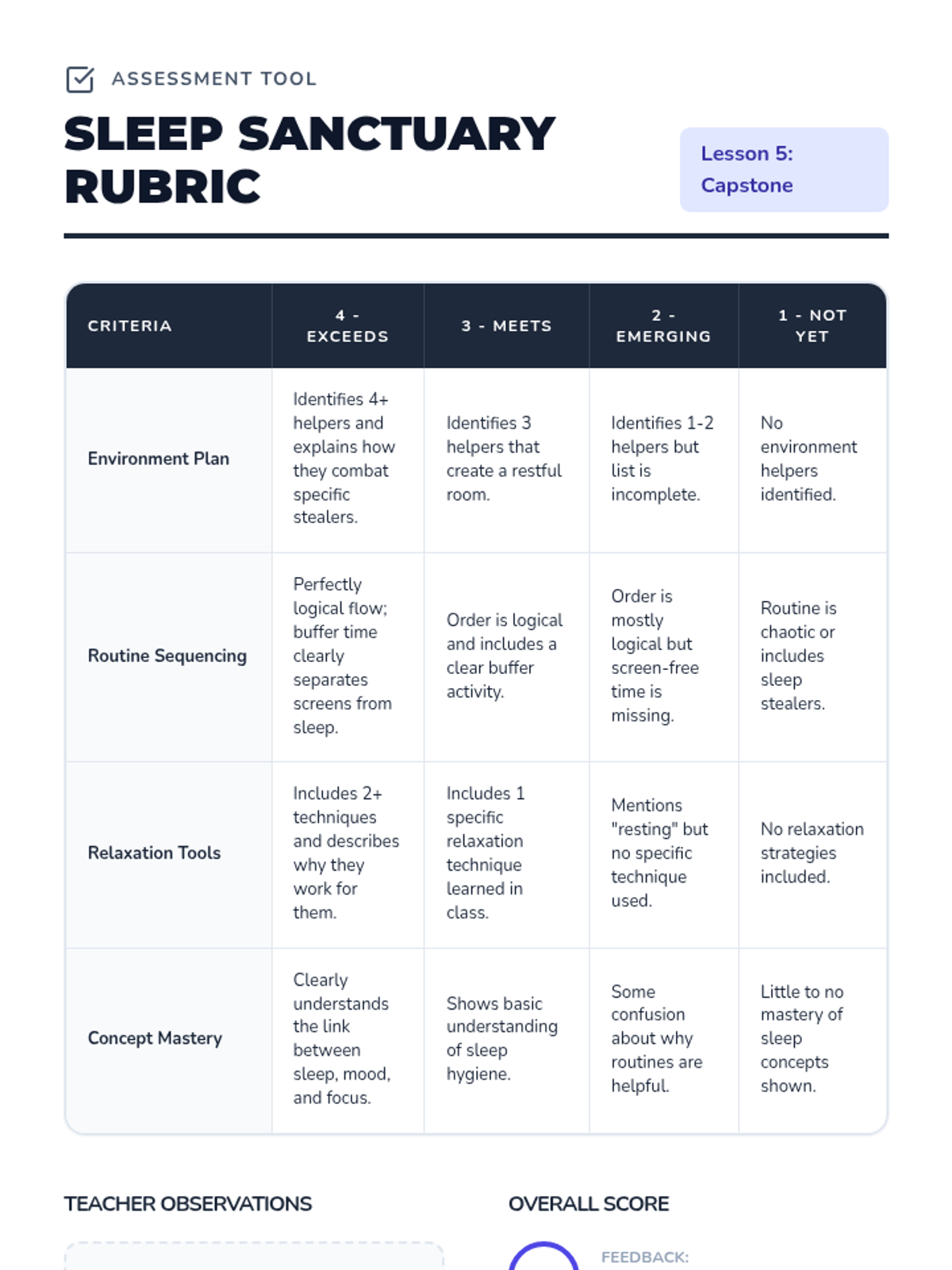 A project-based unit where 3rd graders explore sleep hygiene, the impact of screens, and relaxation techniques to design their own personalized bedtime routines for better mood and school success.