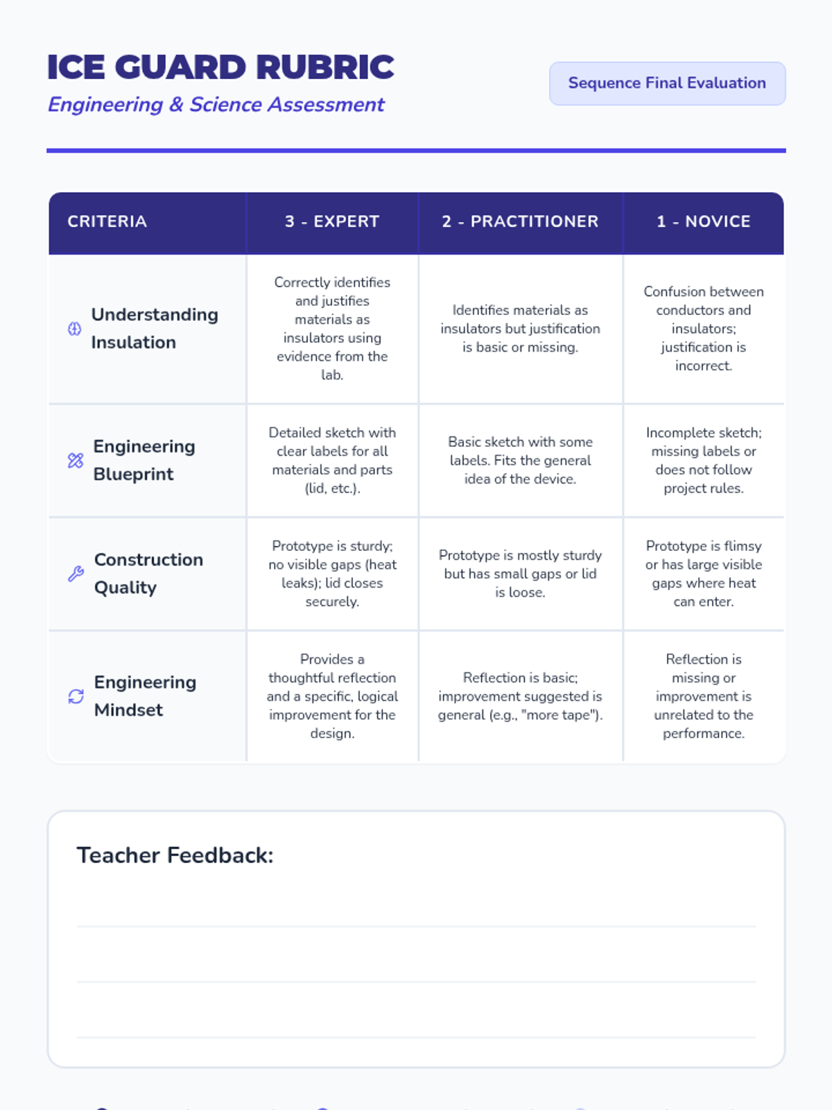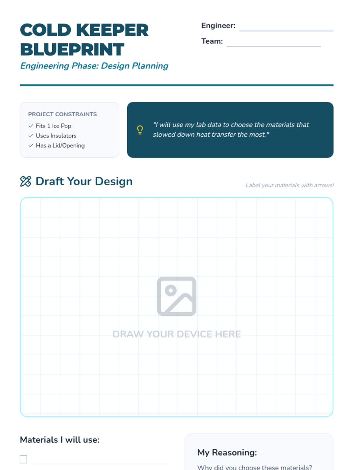 A 2nd-grade engineering sequence where students explore heat transfer and insulation to design a device that prevents an ice pop from melting. Students test materials, create blueprints, and build prototypes for their 'Cold Keeper' invention.