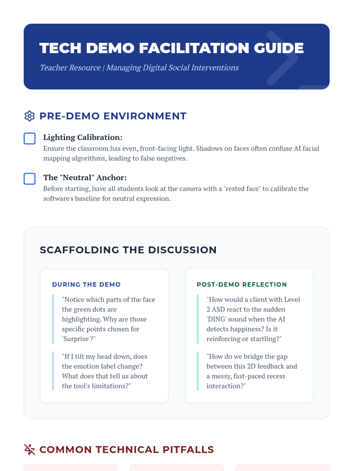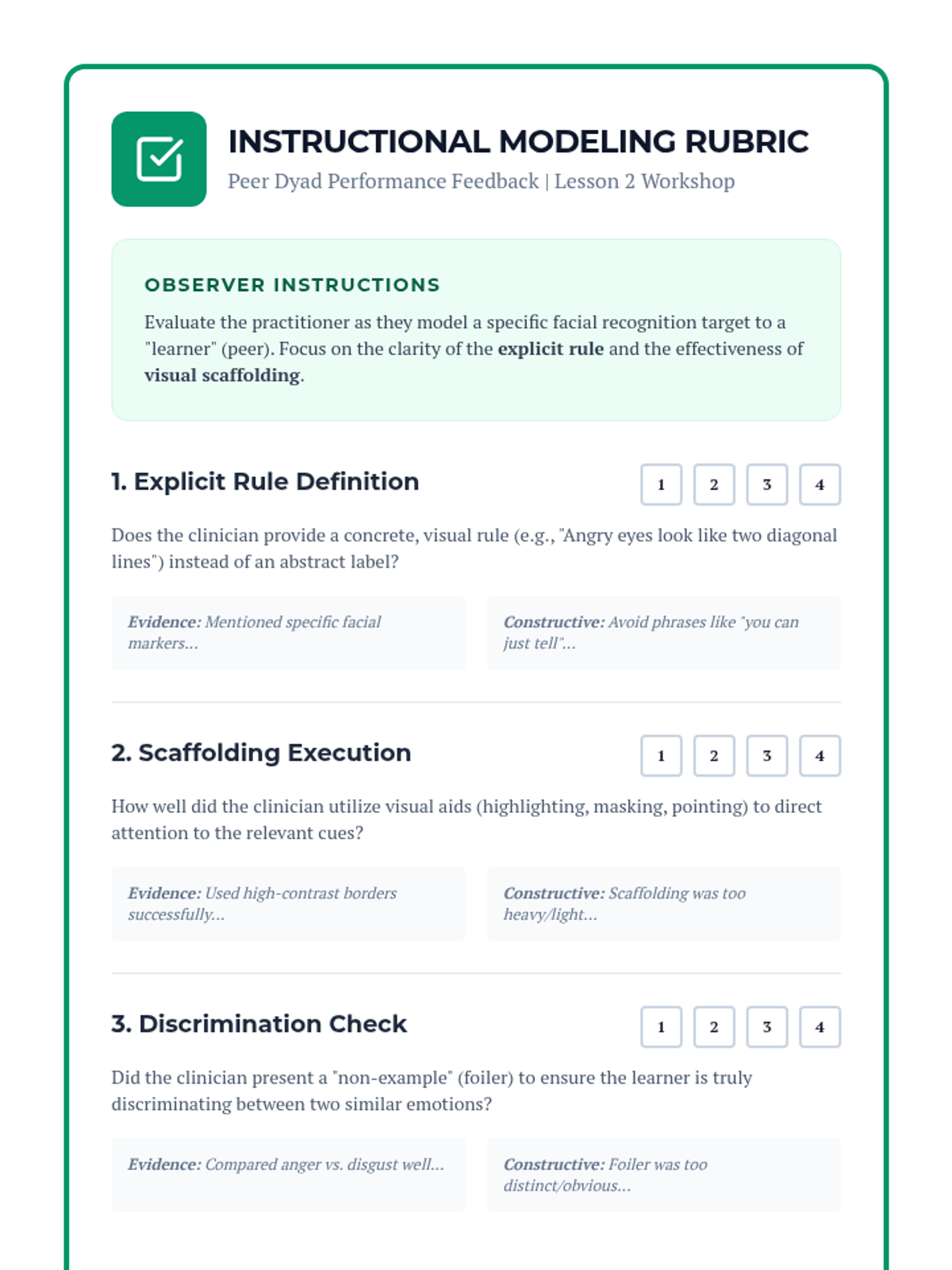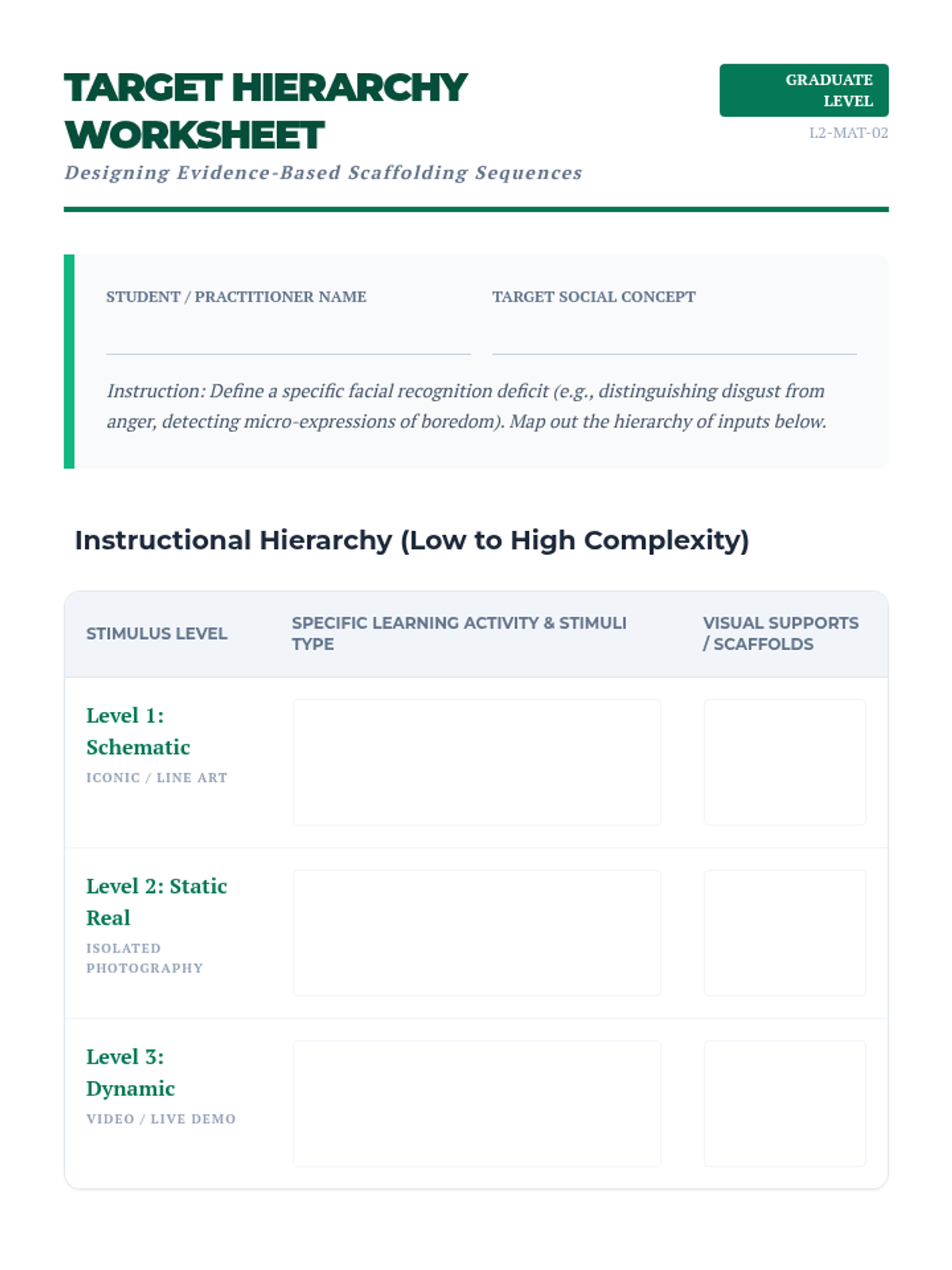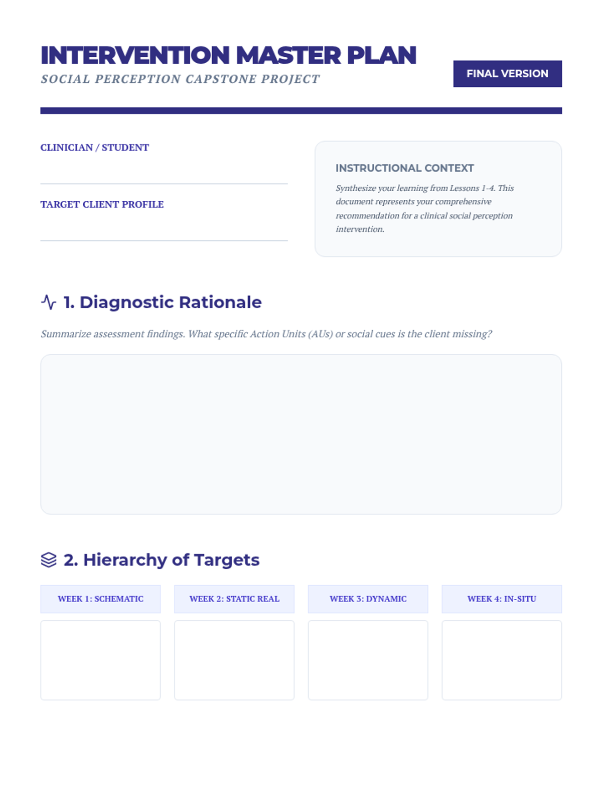 A comprehensive graduate-level sequence focused on designing evidence-based interventions for facial expression recognition. Students transition from diagnostic assessment to instructional scaffolding and technology integration, culminating in a professional intervention plan.