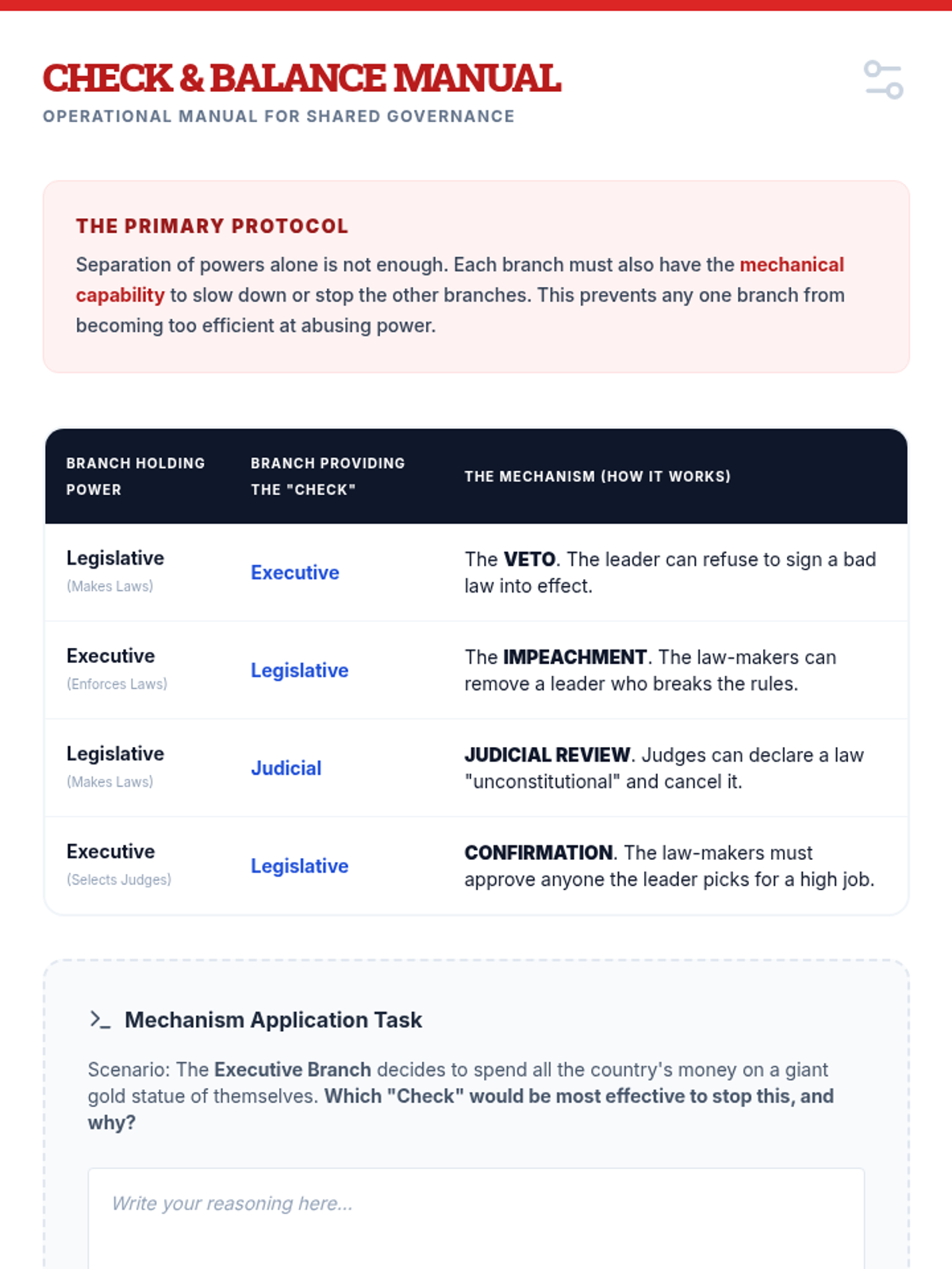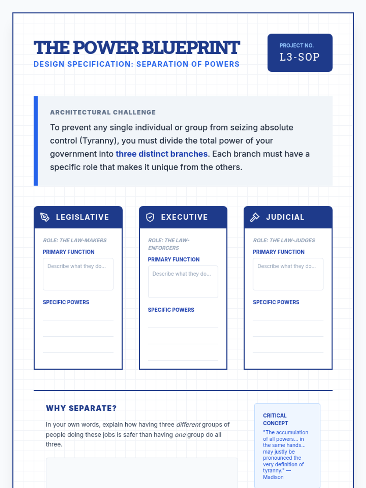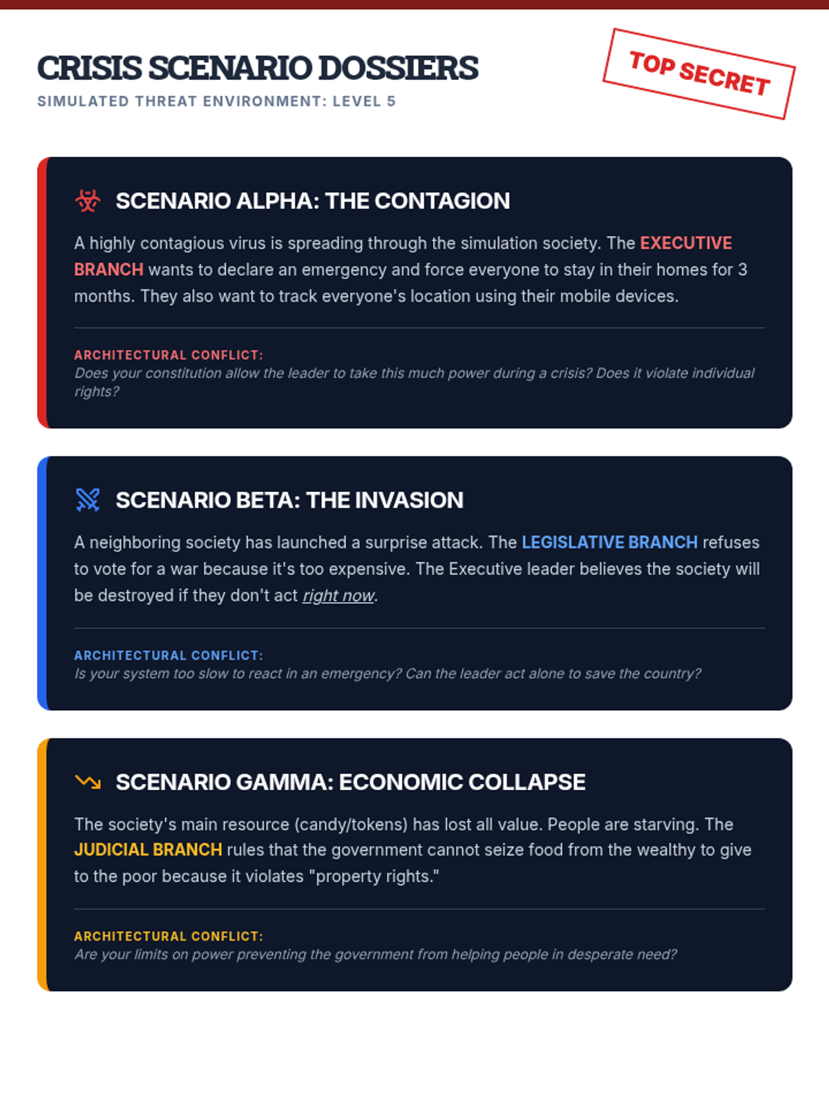 In this immersive simulation sequence, students explore the necessity of limiting government power by building a constitution for a new society. Starting from a 'state of nature' scenario, students experience the chaos of anarchy and the dangers of tyranny first-hand, eventually drafting and stress-testing their own systems of limited government.
