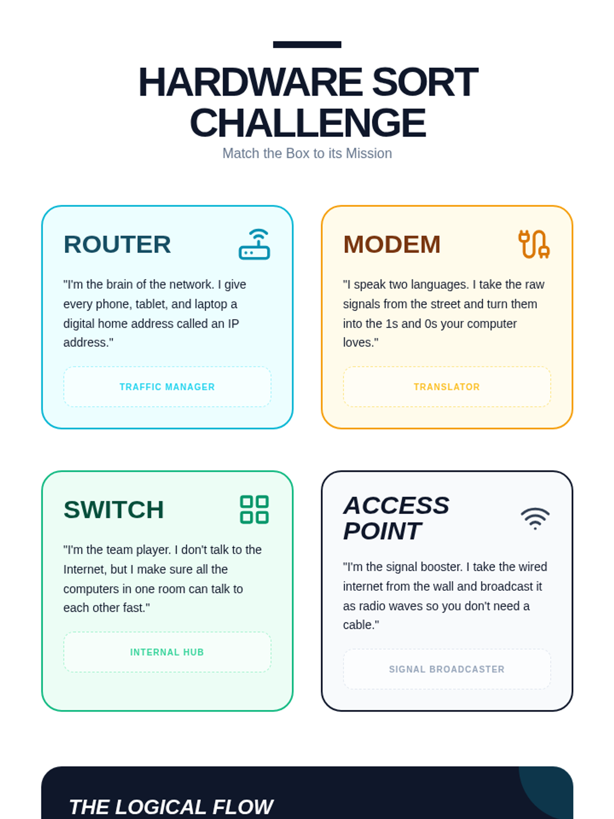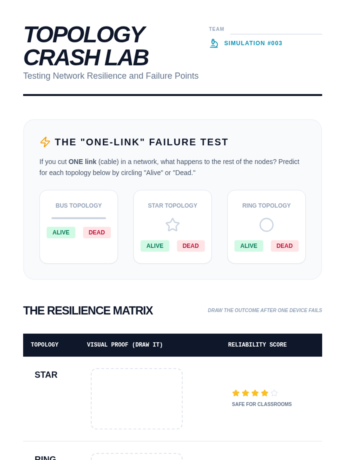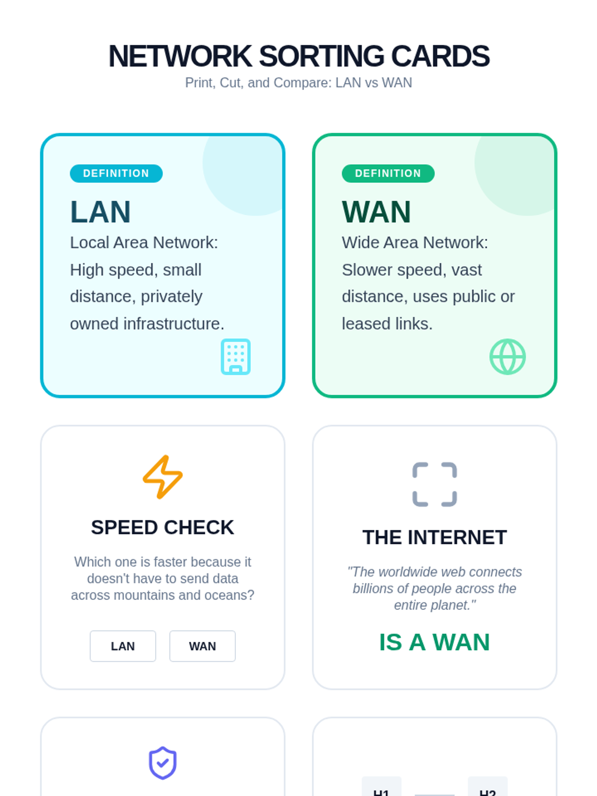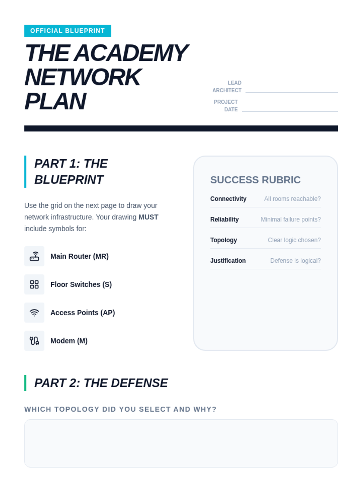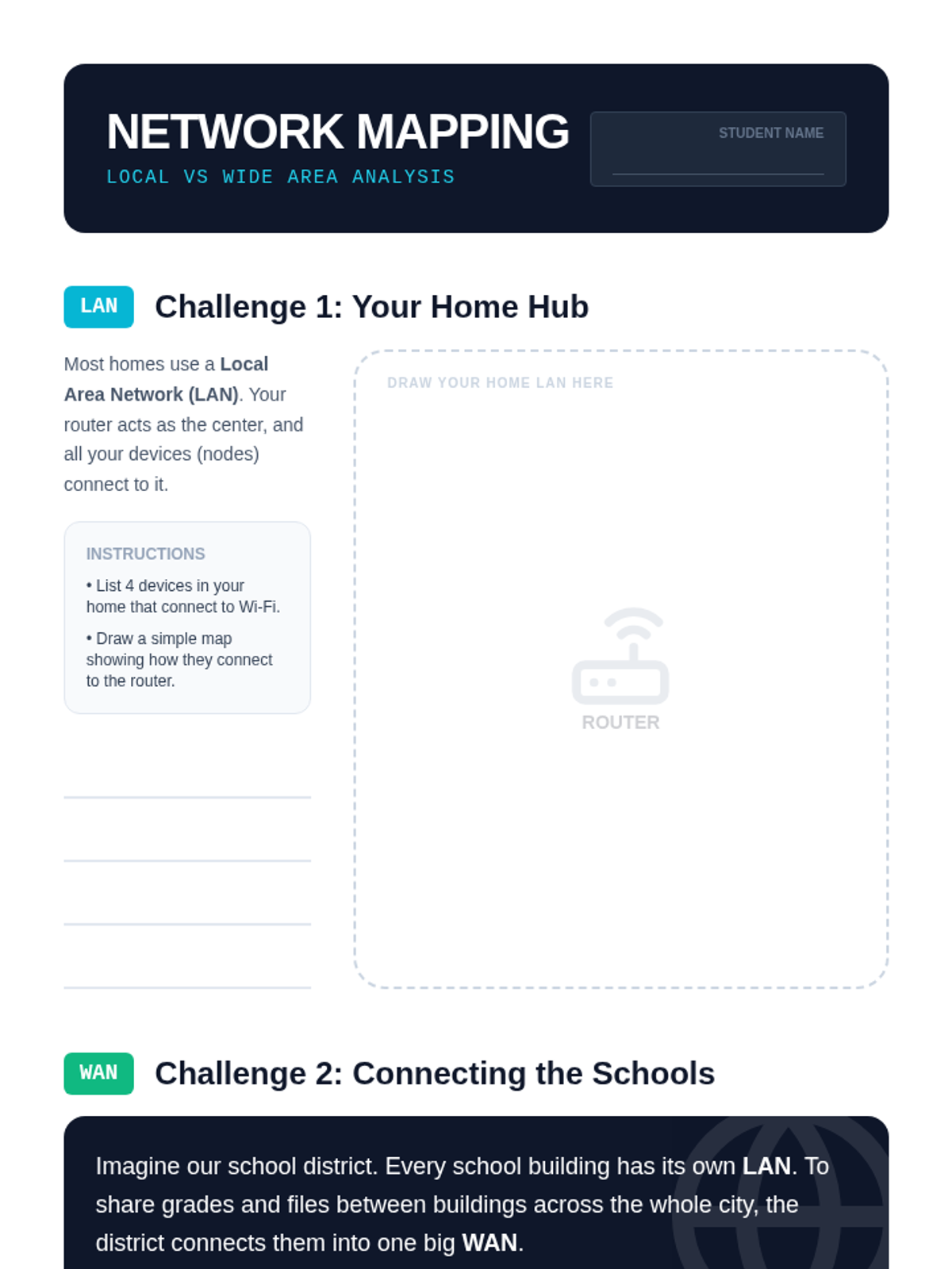 A comprehensive 6th-grade unit on computer network structures, covering nodes, links, LAN/WAN differences, topologies, and hardware components, concluding with a real-world design challenge.