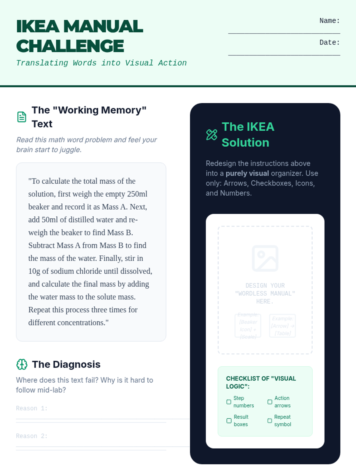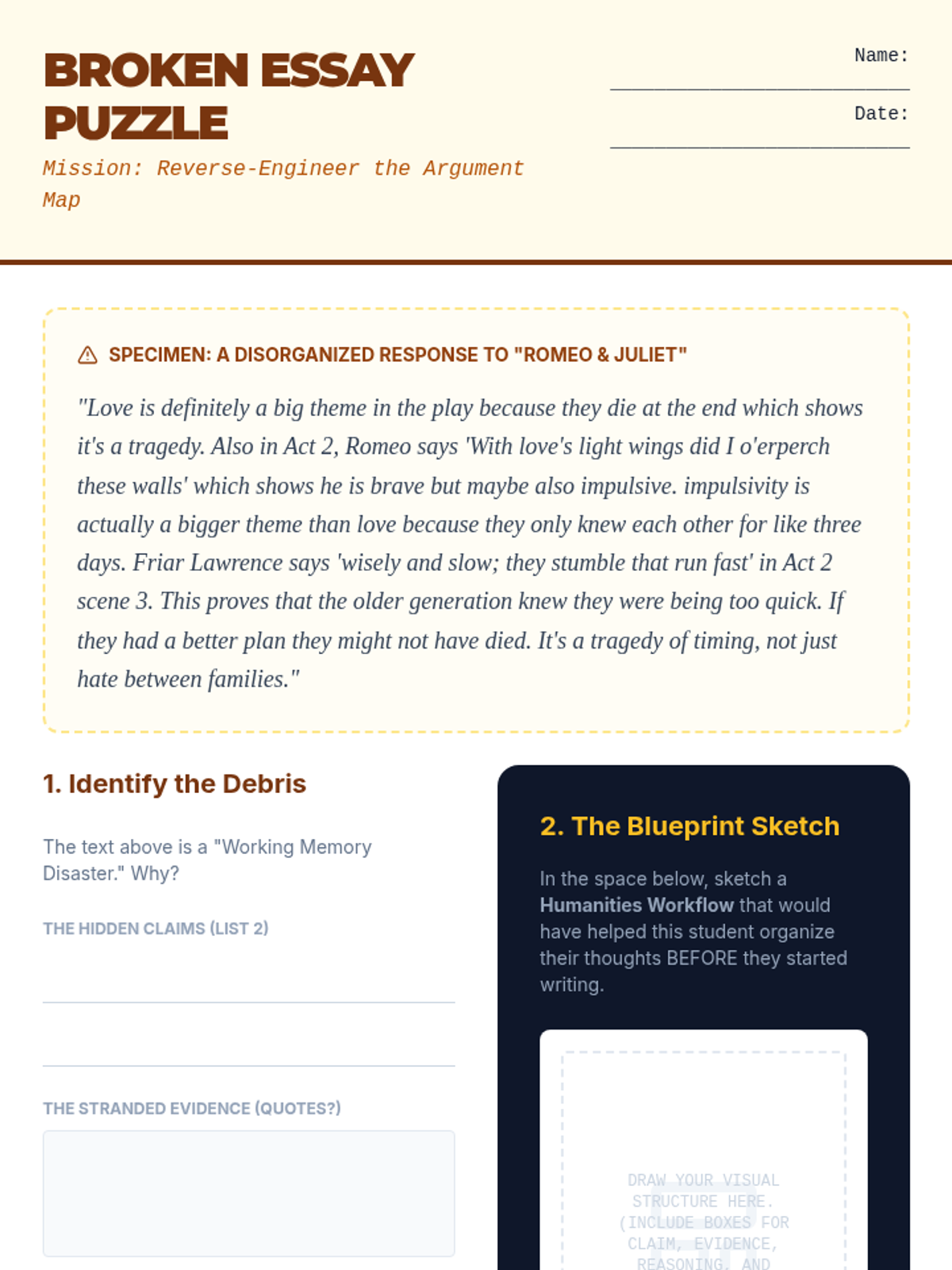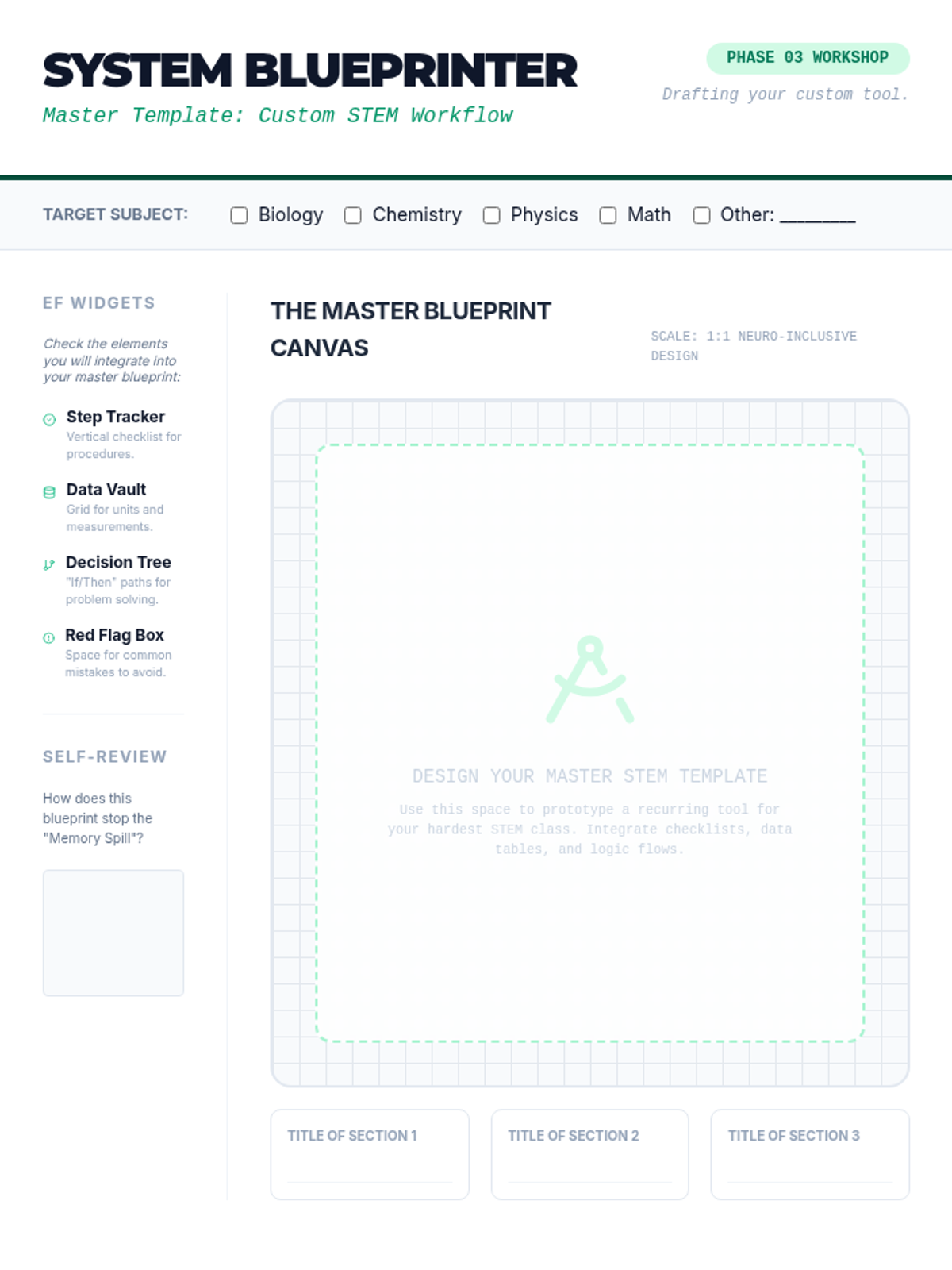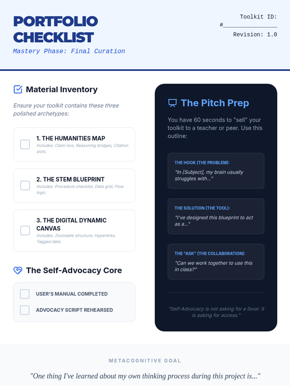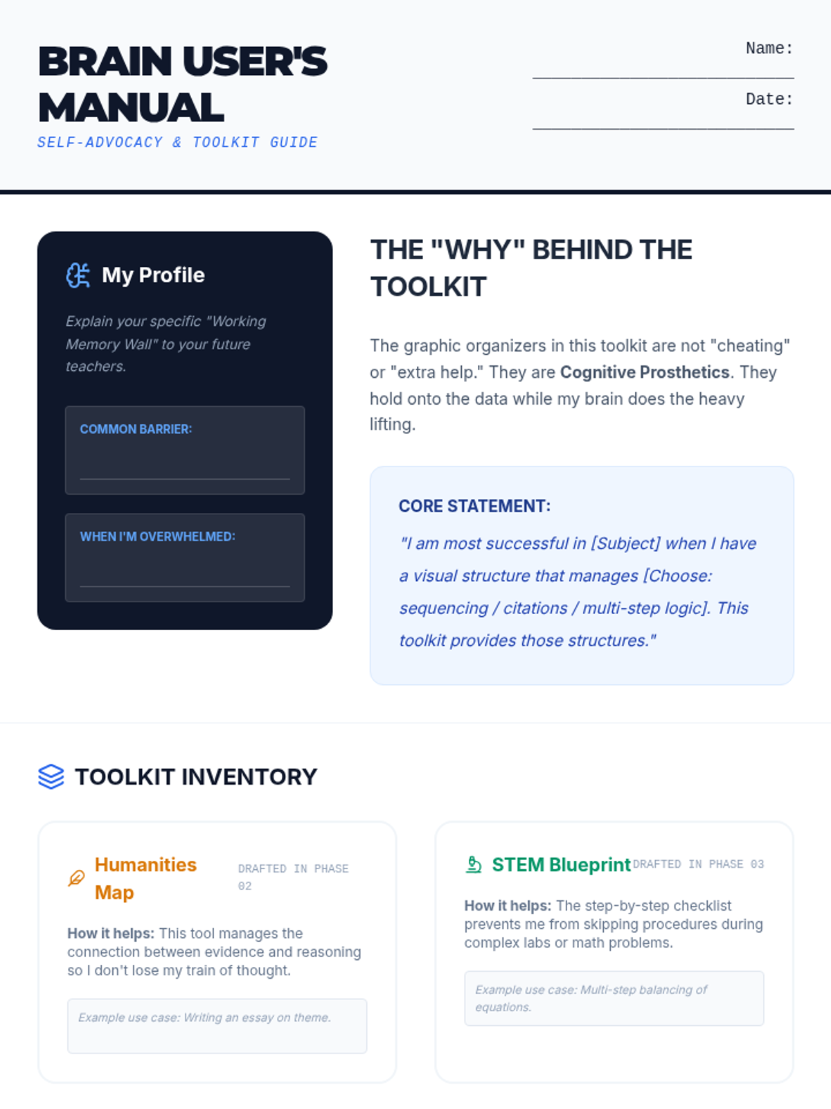 A project-based sequence for 10th-grade students to design personalized graphic organizers, focusing on working memory support and self-advocacy. Students transition from critiquing generic templates to creating a custom 'toolkit' for STEM and Humanities subjects.