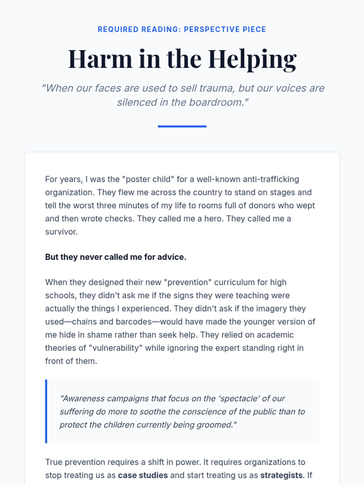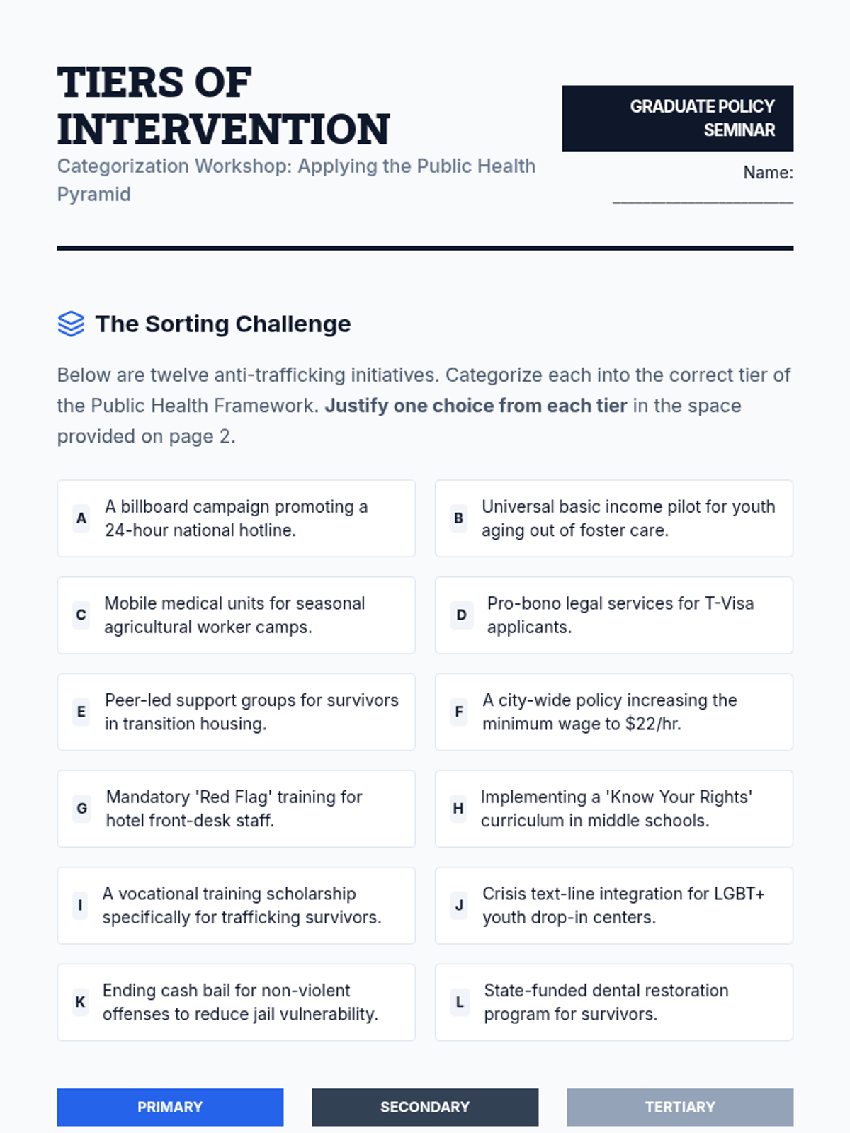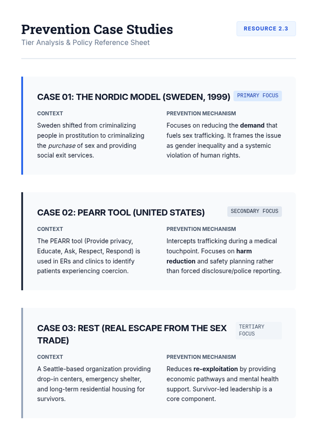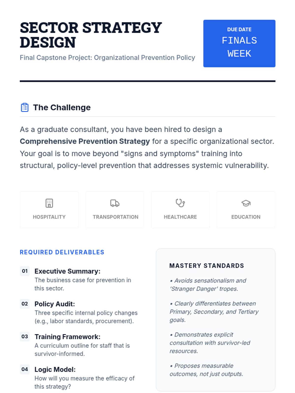 A graduate-level sequence focused on moving from performative awareness to evidence-based prevention of human trafficking. Students will critique existing narratives, apply public health frameworks, and design sector-specific prevention strategies based on survivor-informed principles and measurable metrics.