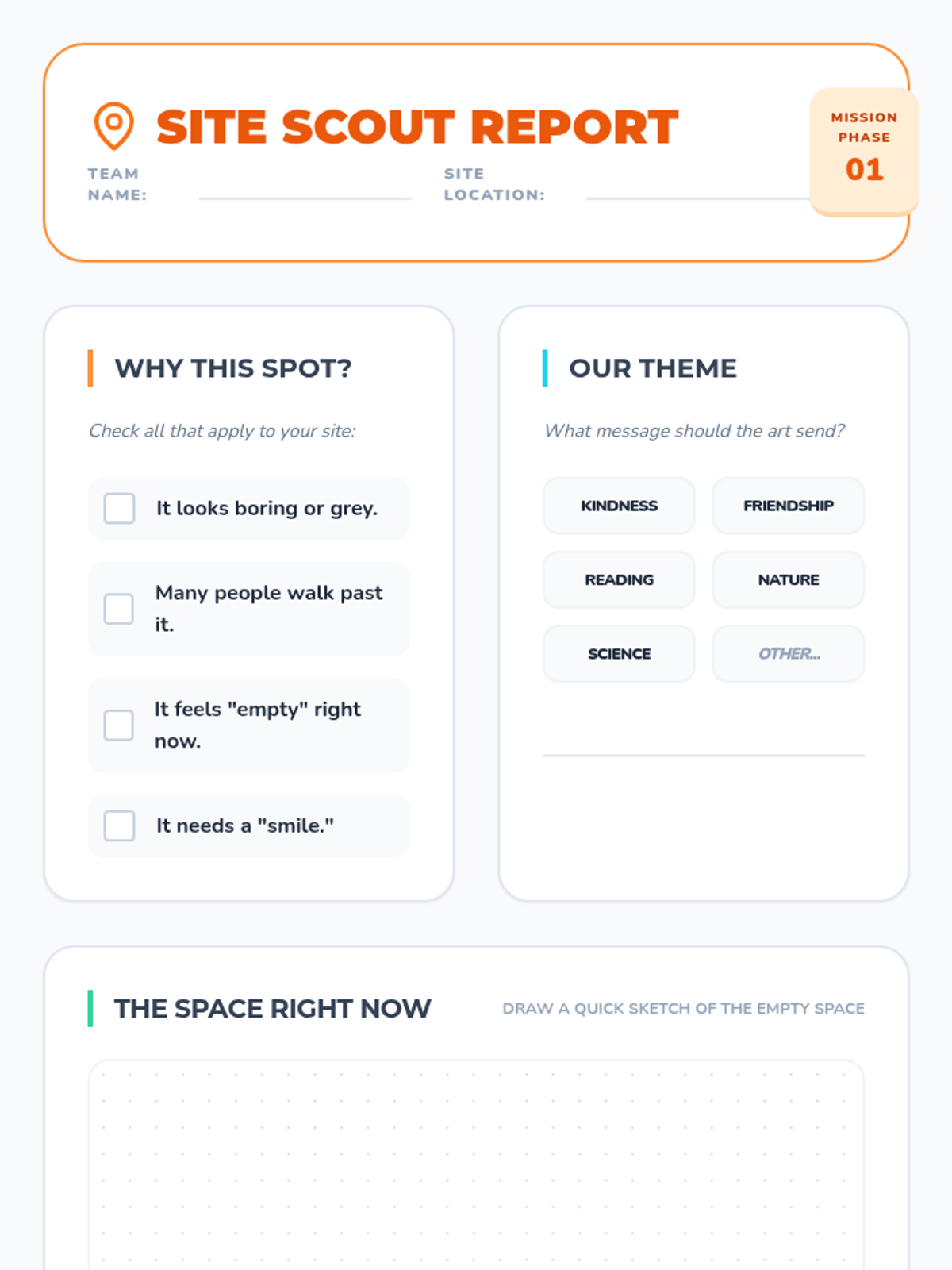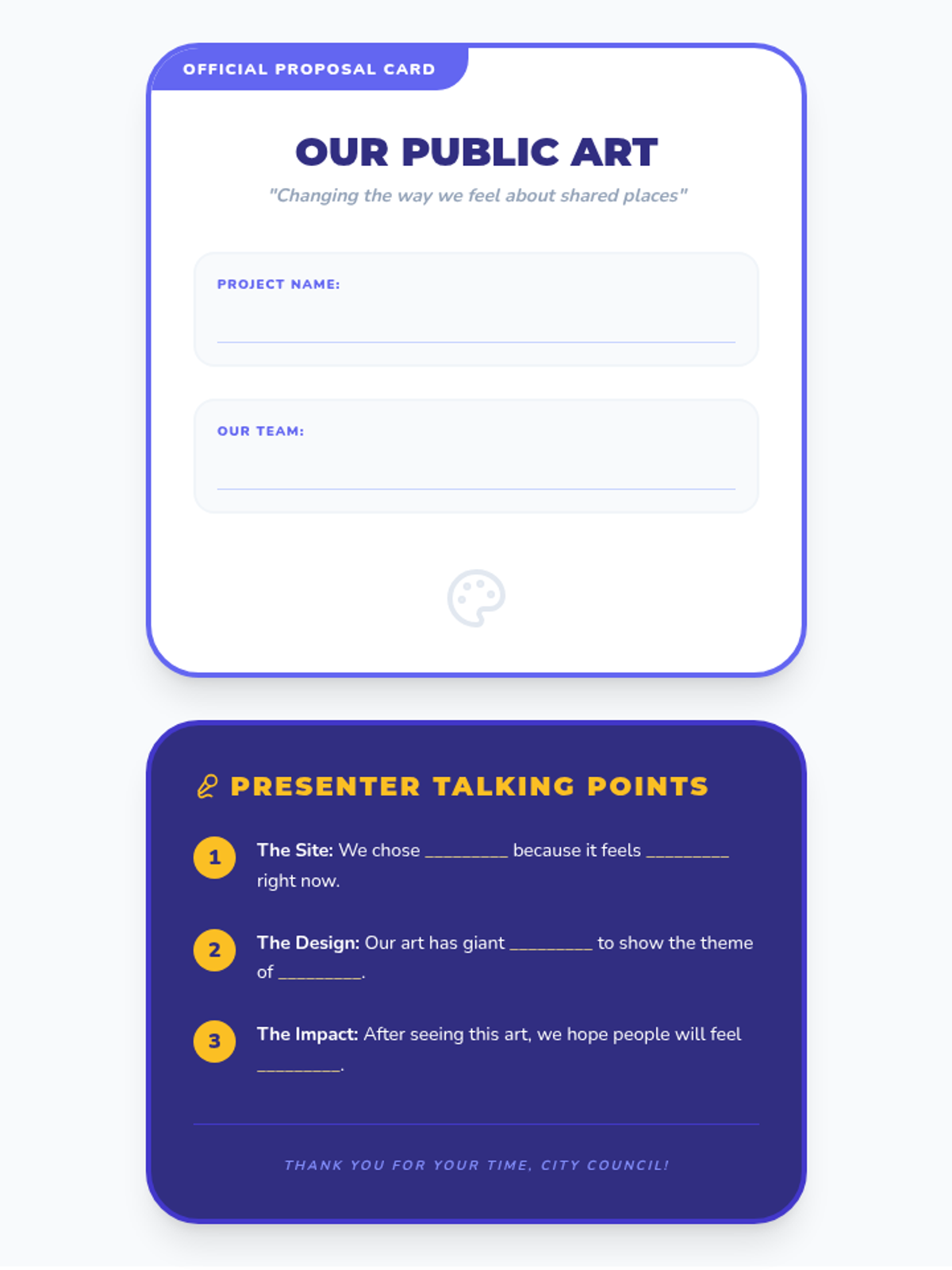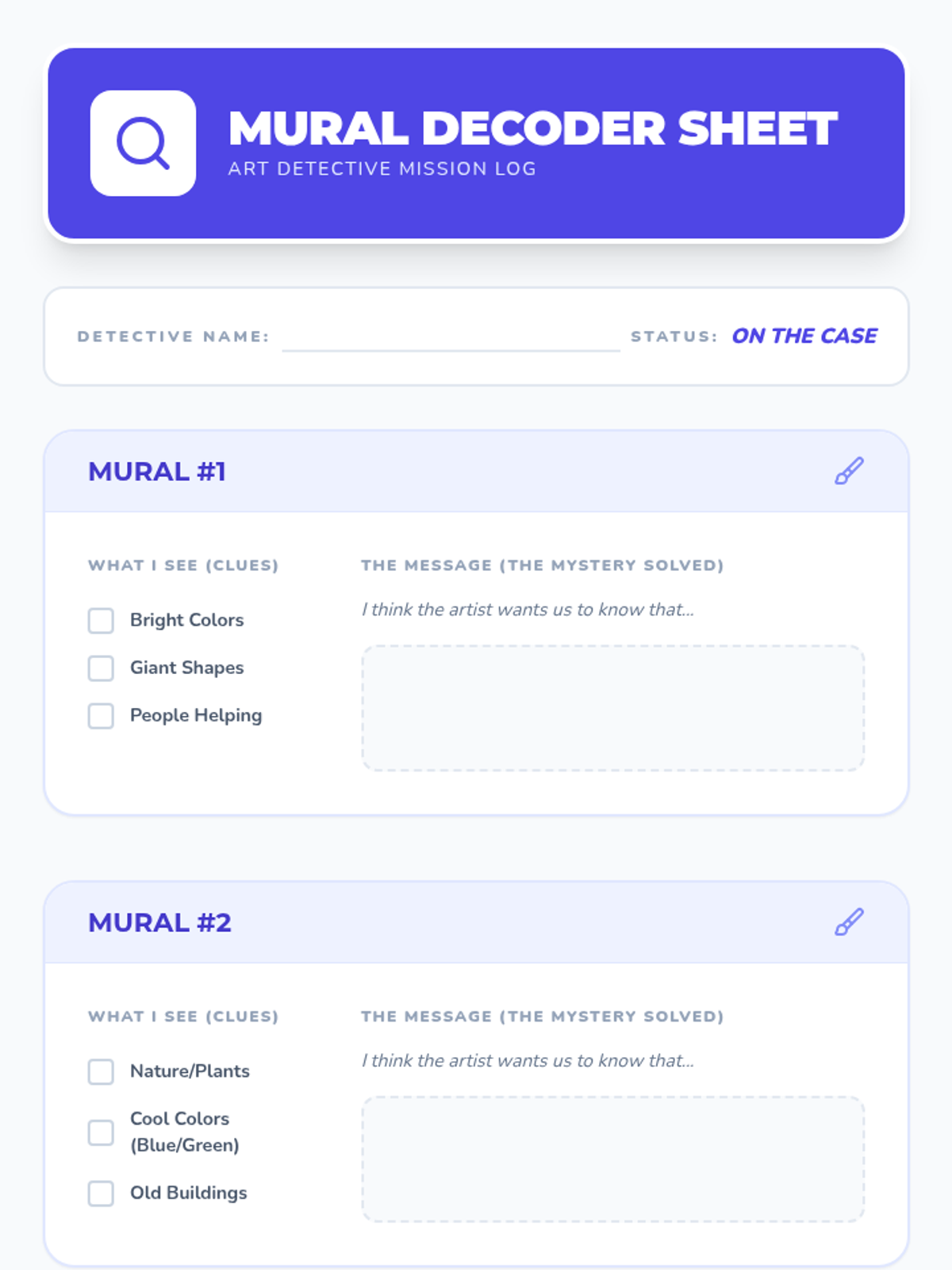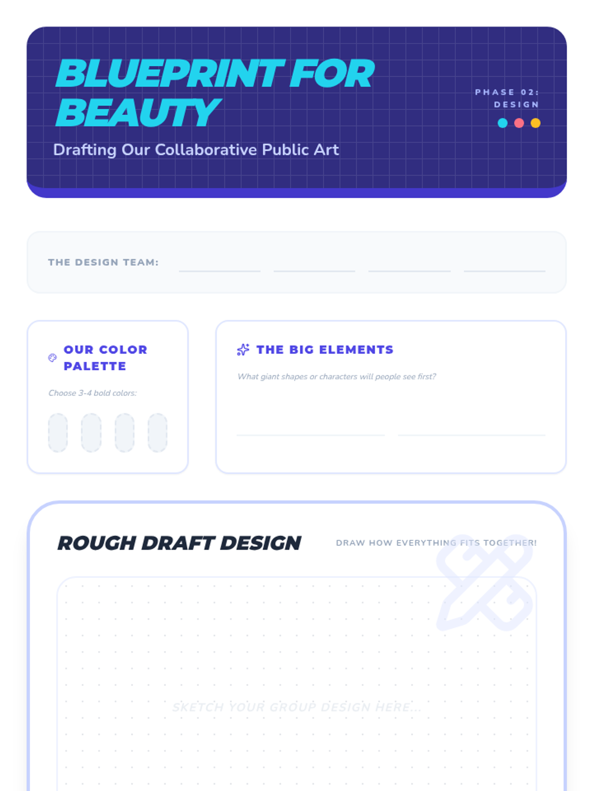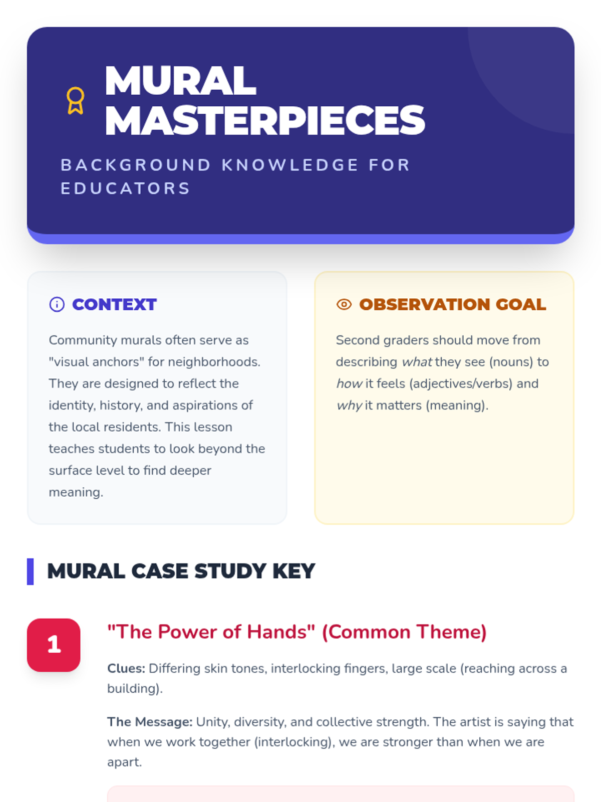 A project-based unit where 2nd-grade students explore the impact of public art, analyze murals, and collaborate to design a piece of public art for their school or local community. Students learn how art can transform shared spaces and communicate messages of hope, history, and unity.