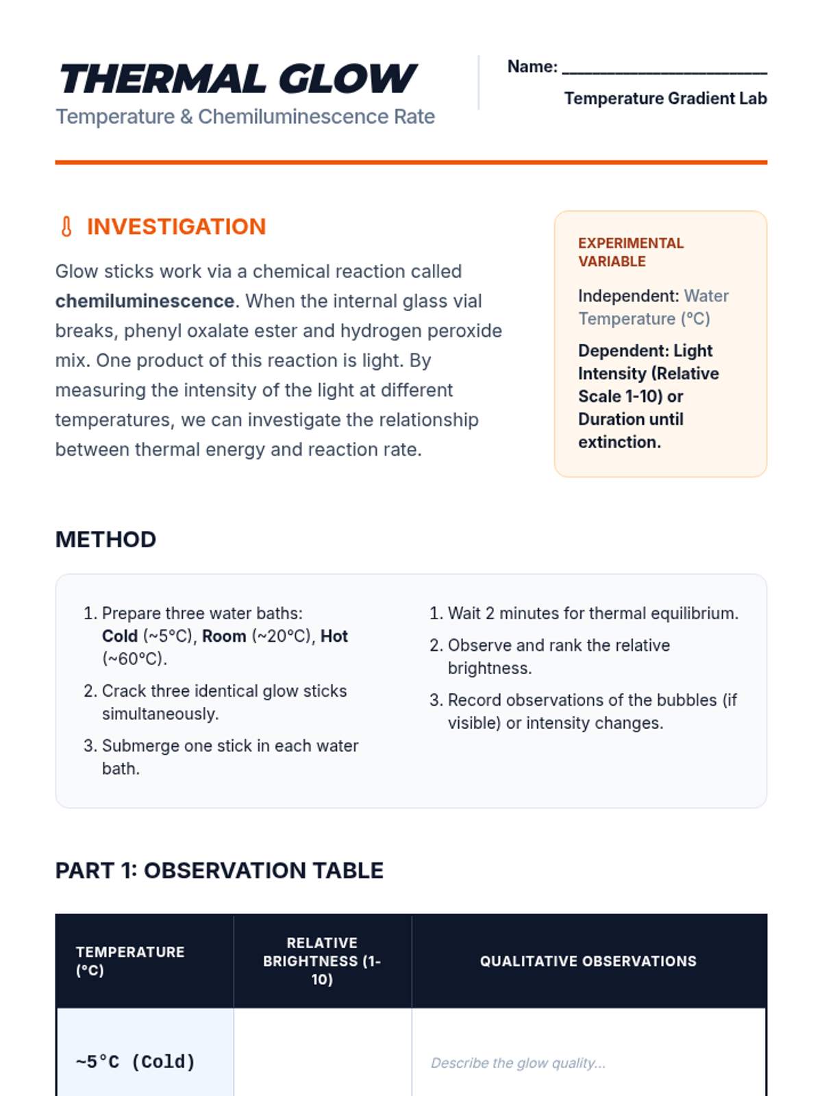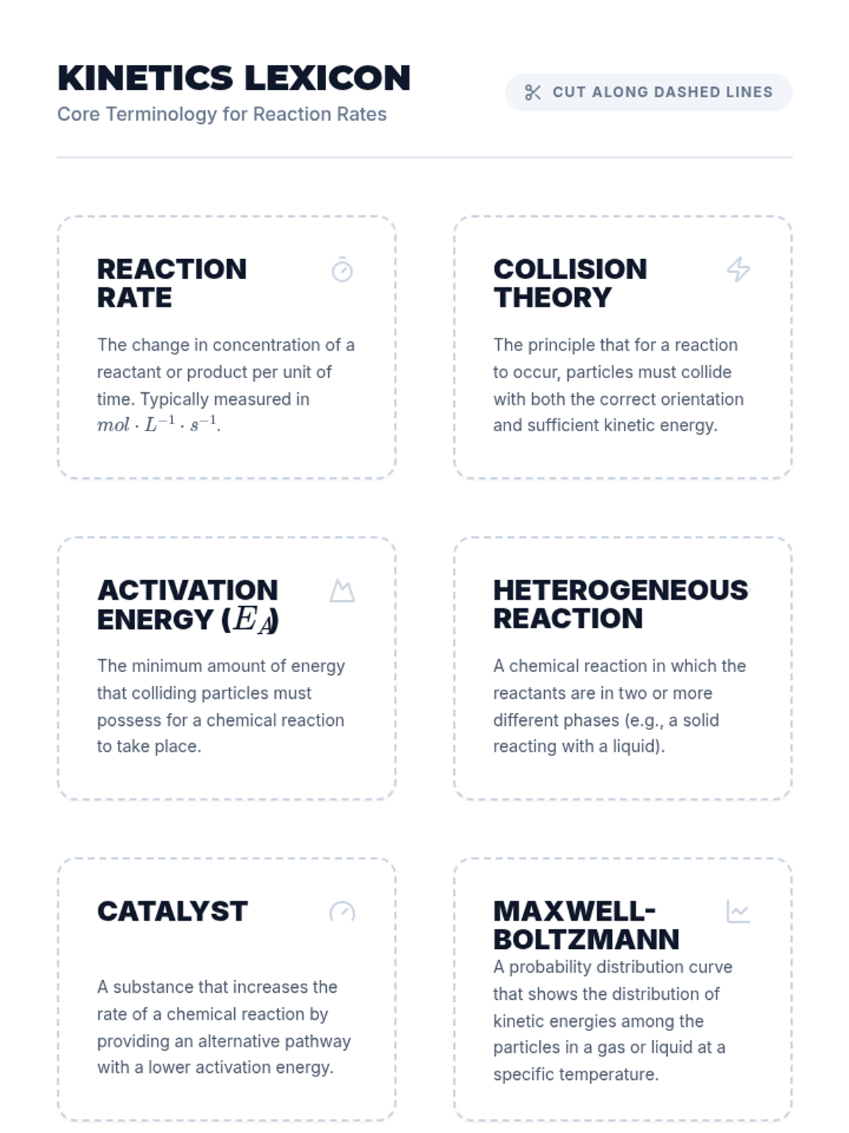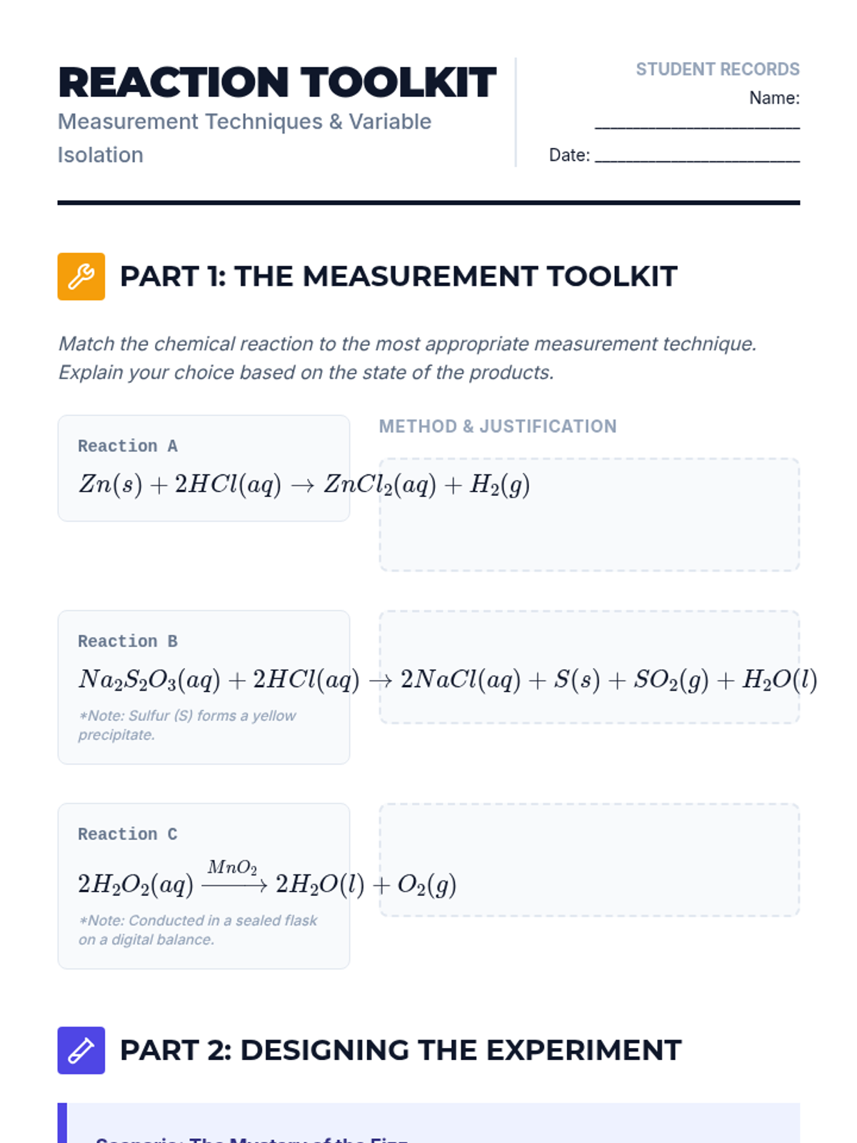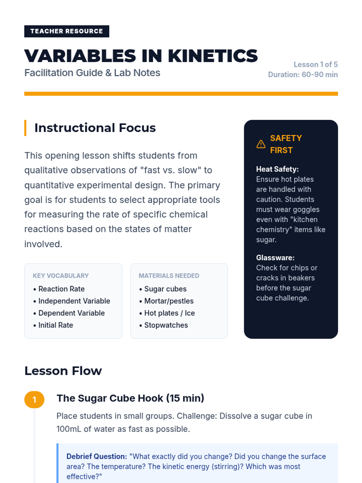 This laboratory-intensive sequence focuses on experimental design and data analysis in chemical kinetics for 12th Grade students. Students investigate factors affecting reaction rates—concentration, surface area, temperature, and catalysts—through quantitative inquiry and a final optimization challenge.