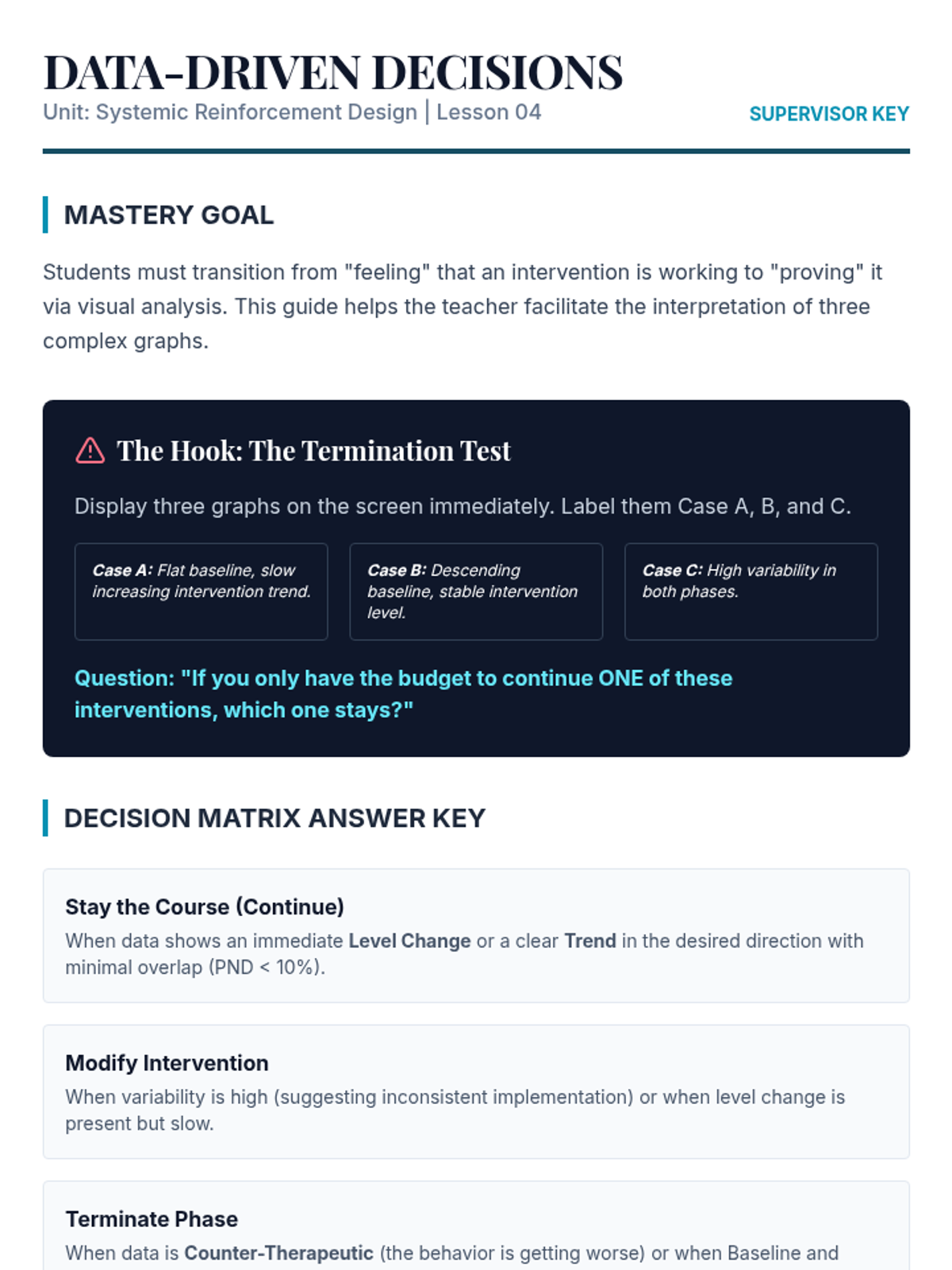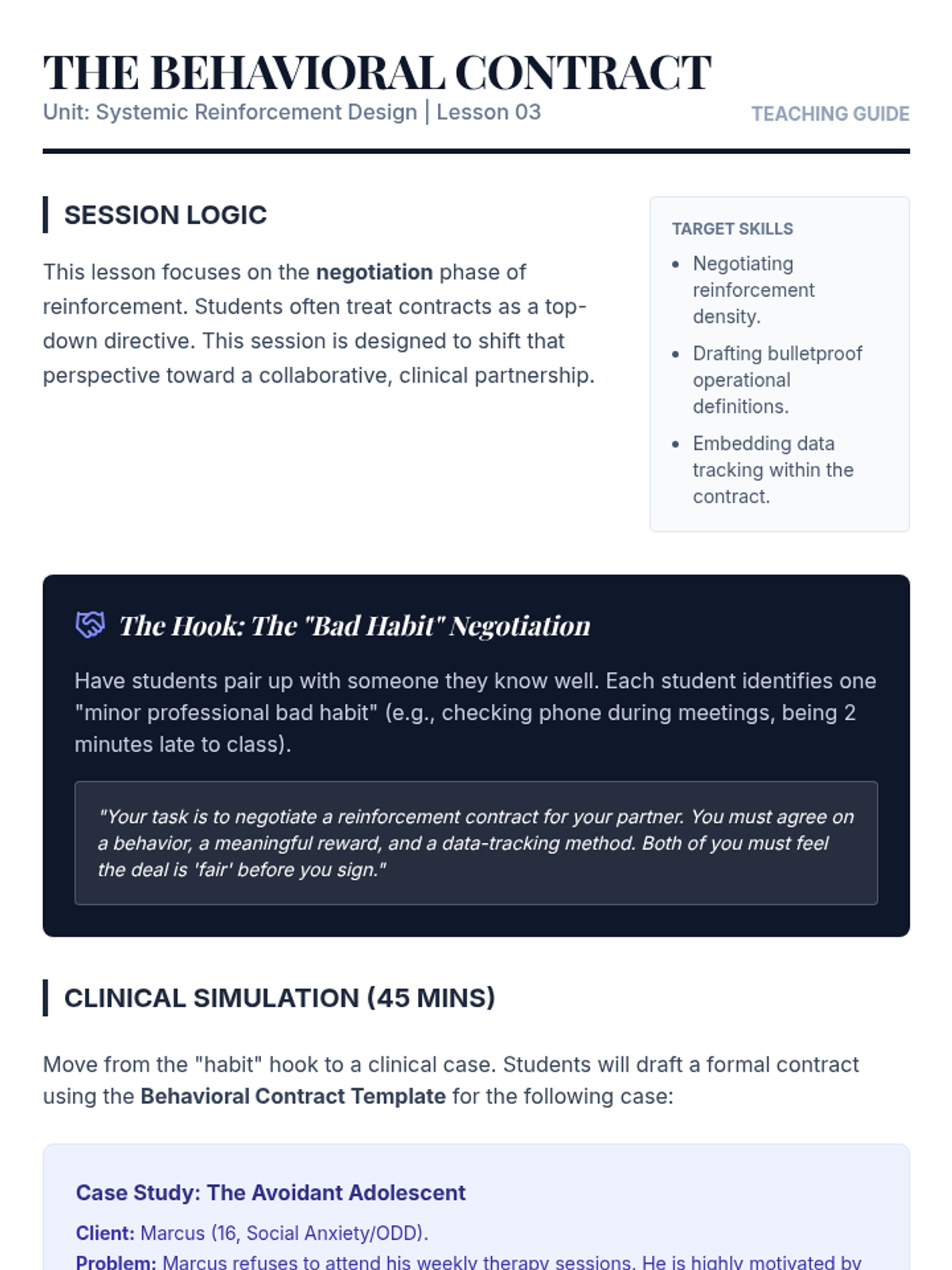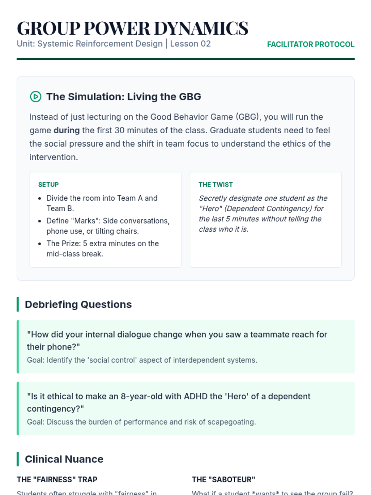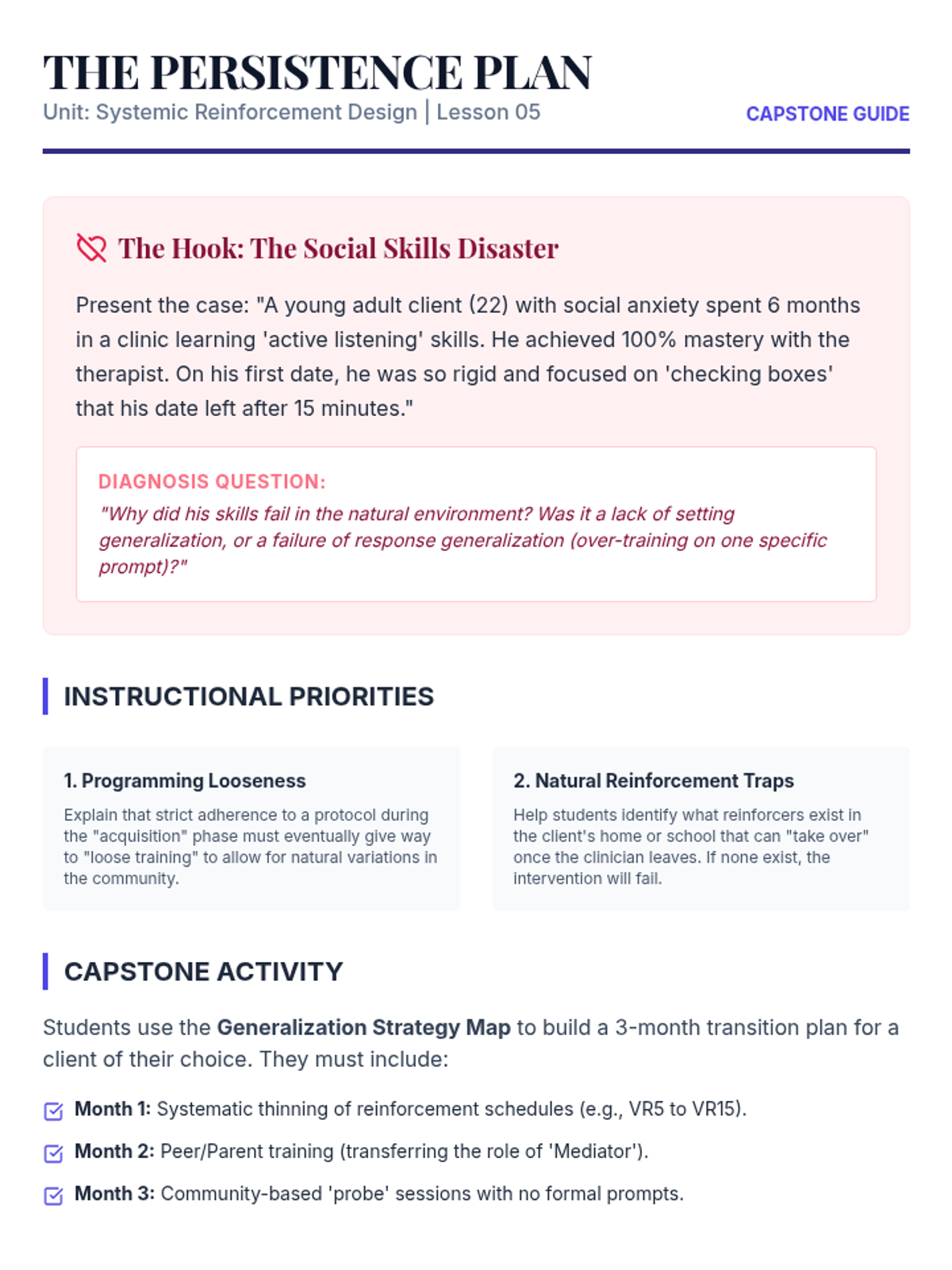 A comprehensive graduate-level sequence on designing, implementing, and monitoring systemic reinforcement interventions. Students move from the theoretical foundations of positive reinforcement to the practical design of token economies, group contingencies, and behavioral contracts, concluding with data-based decision-making and generalization strategies.