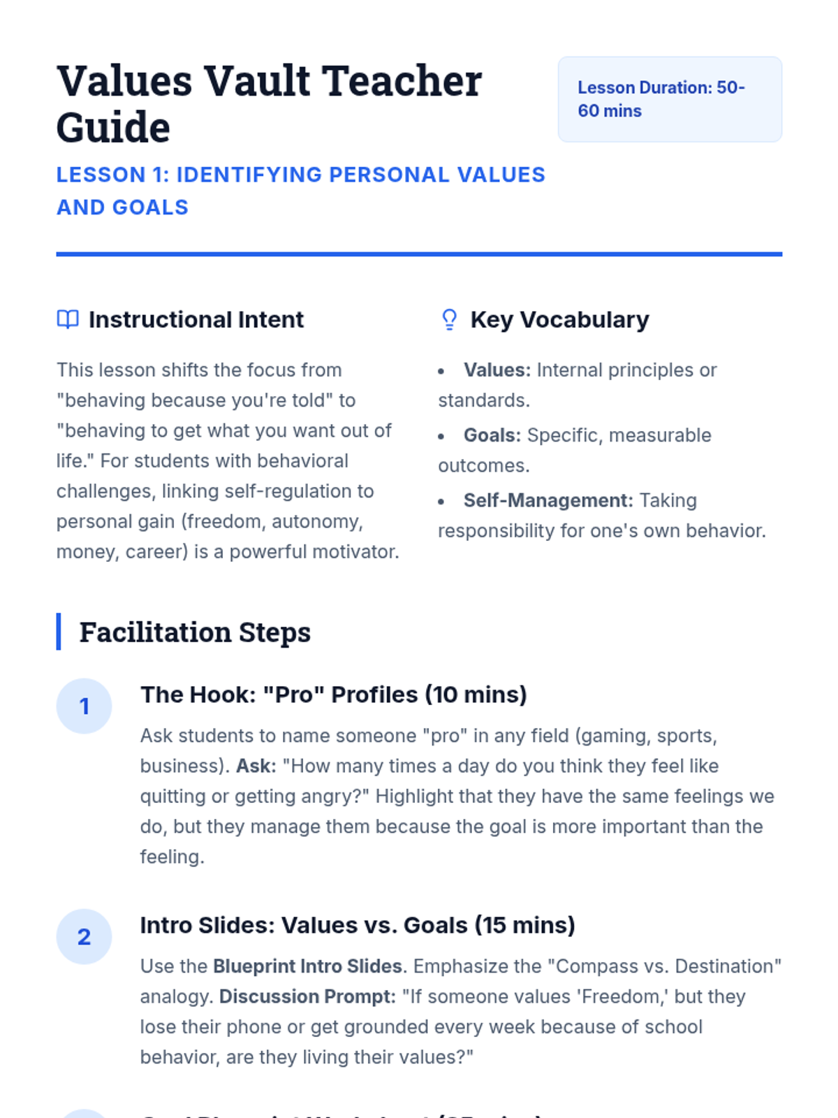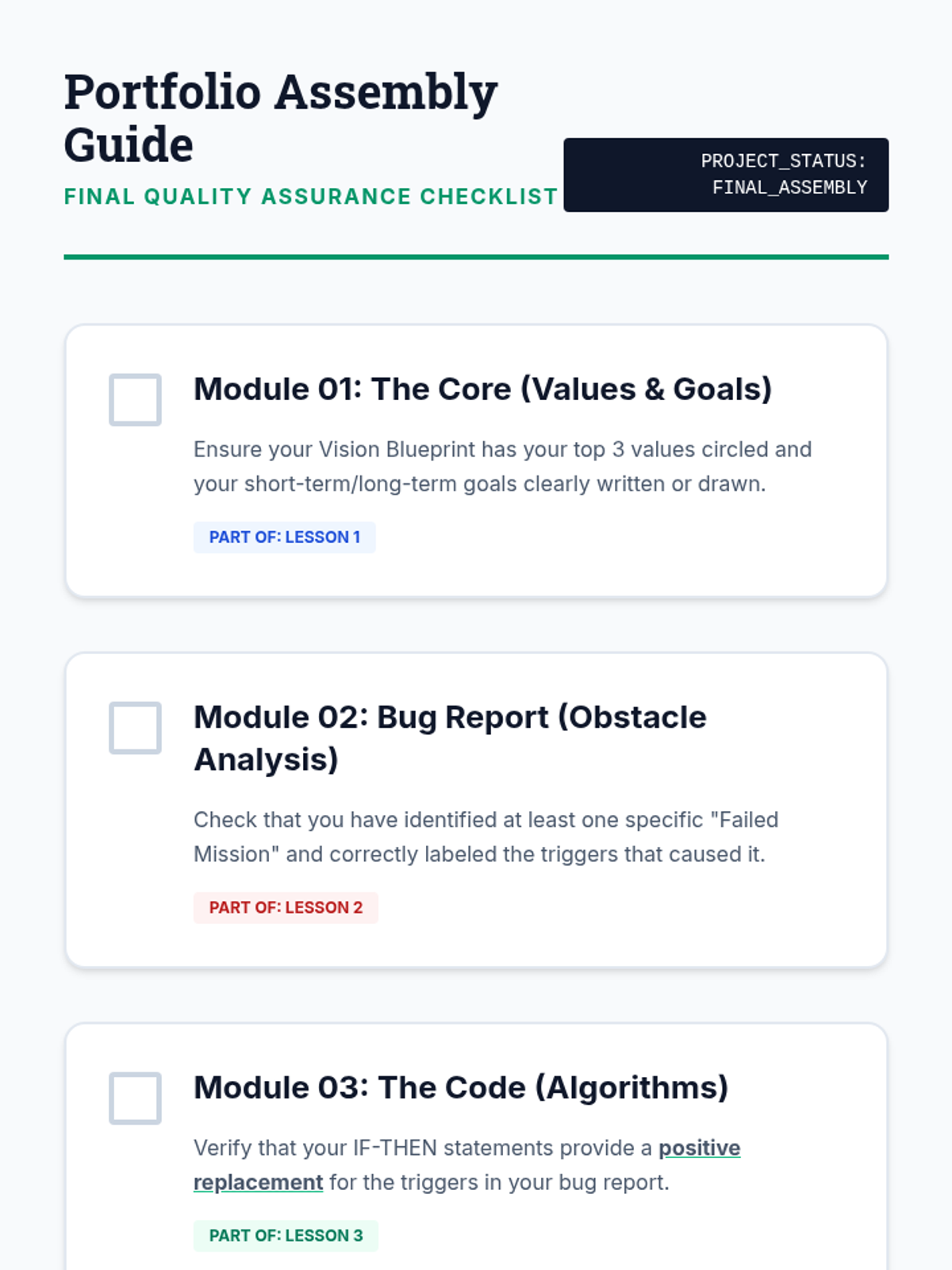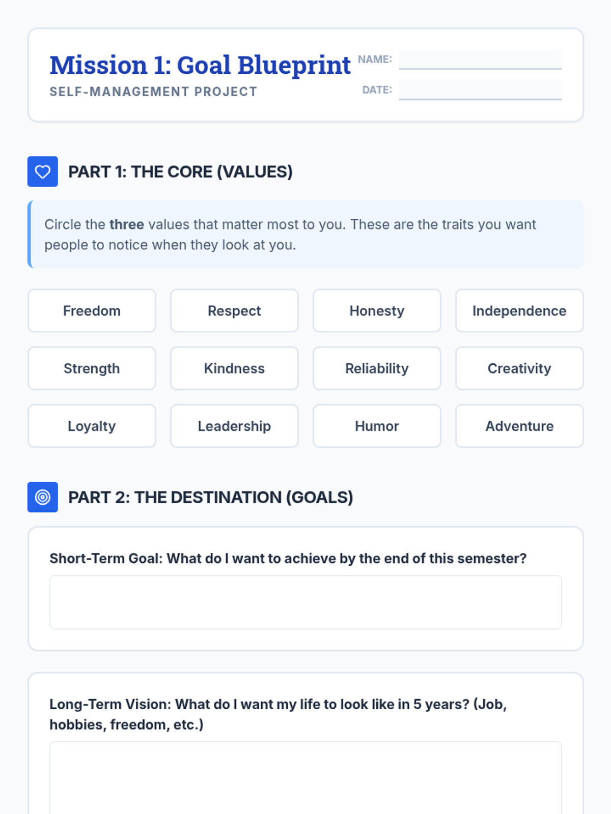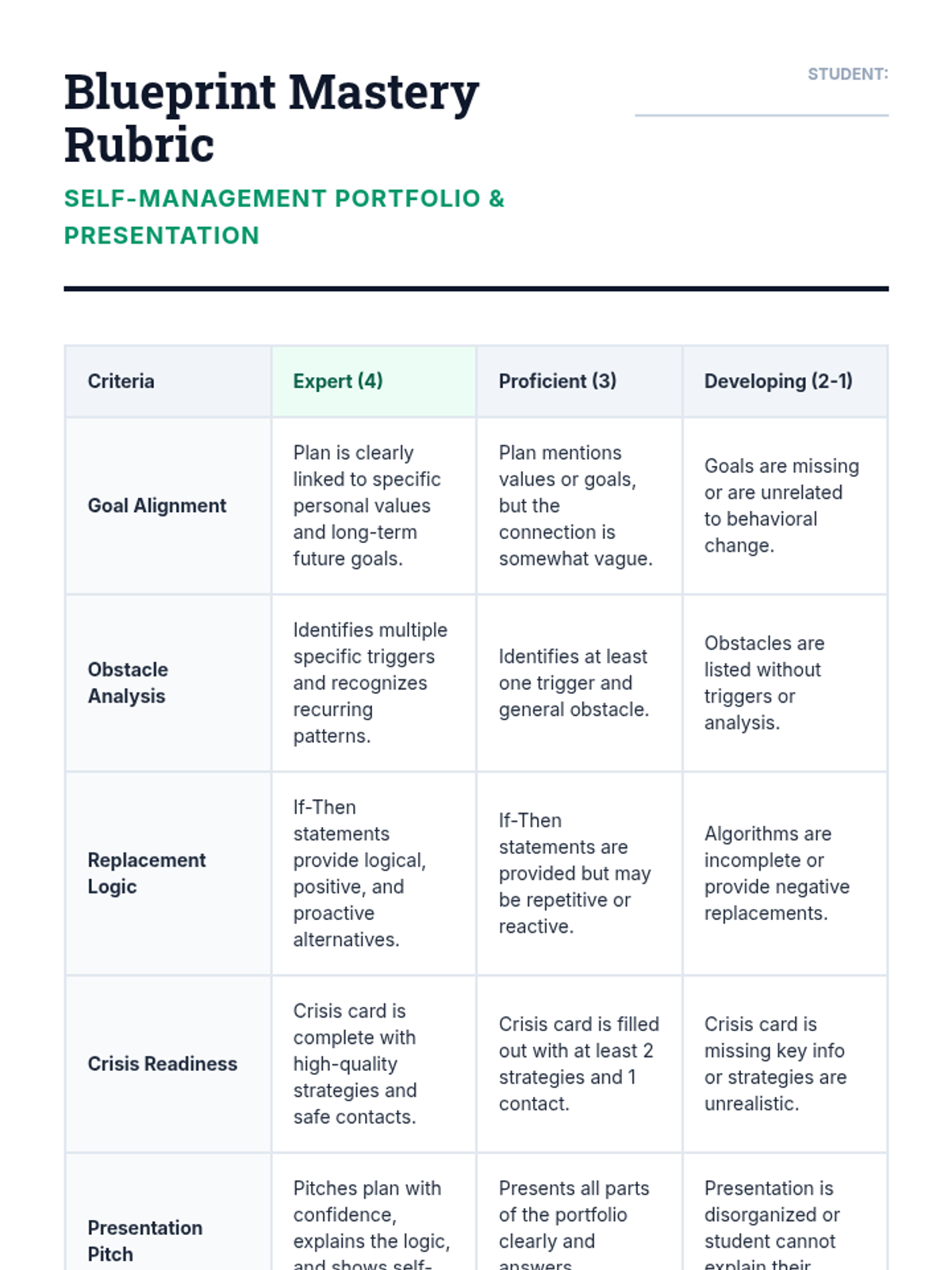 A project-based sequence where 8th-grade students design a personalized self-management plan to navigate behavioral challenges and reach their future goals. Students move from identifying core values to creating tangible crisis management tools and presenting their final portfolio.
