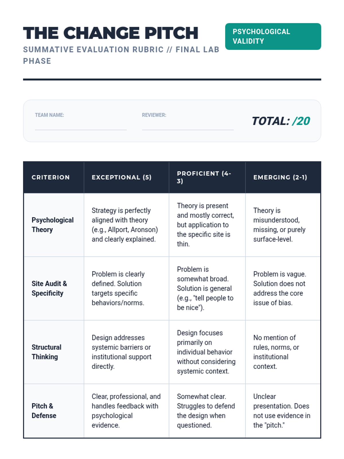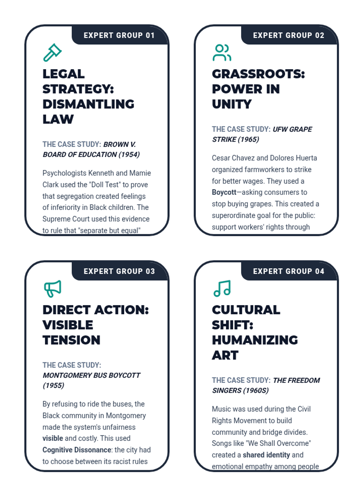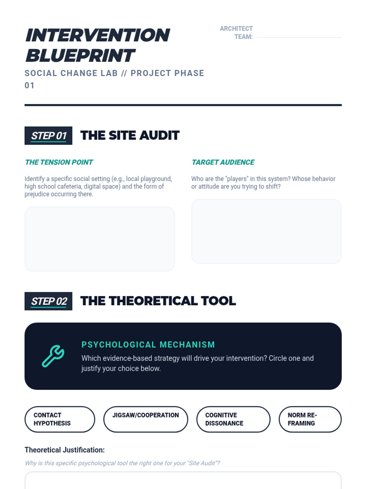 This 11th-grade psychology sequence shifts the focus from the roots of prejudice to evidence-based psychological strategies for reducing intergroup conflict. Students evaluate Allport's Contact Hypothesis, investigate systemic discrimination, and apply Elliot Aronson's Jigsaw Classroom technique, culminating in a project where they design their own psychological interventions for social change.